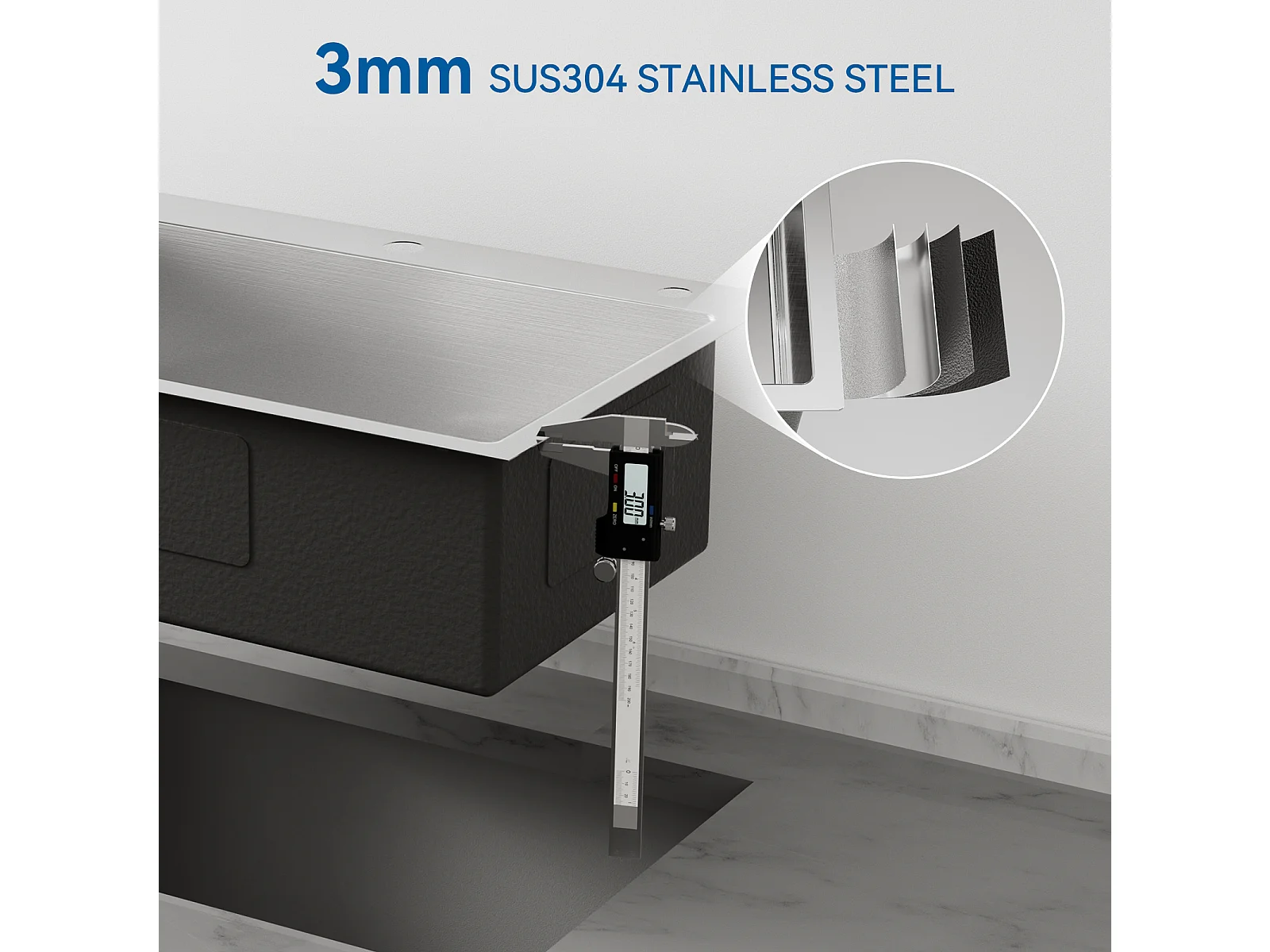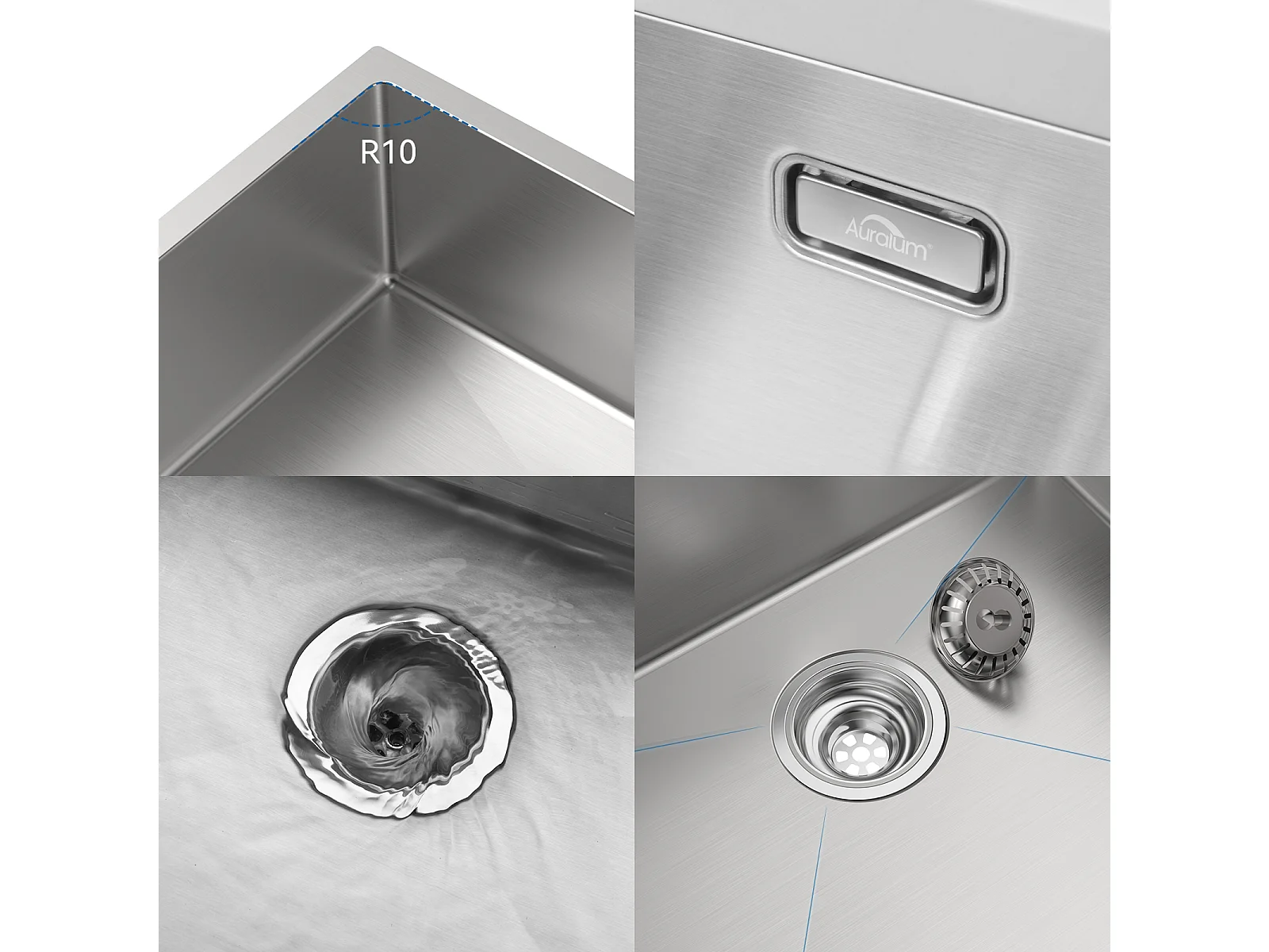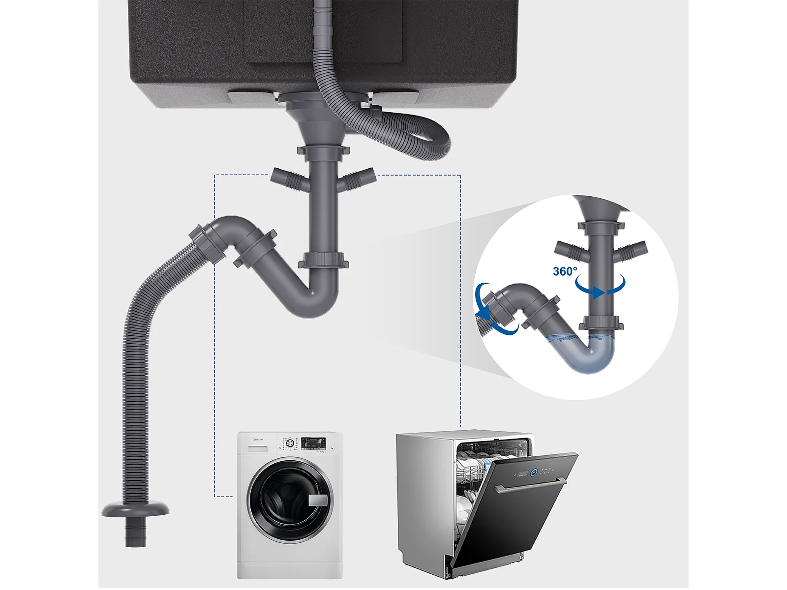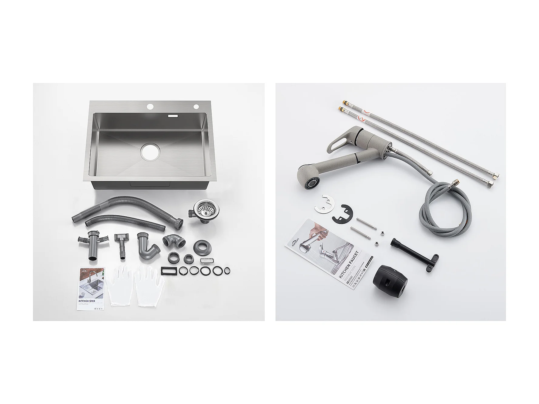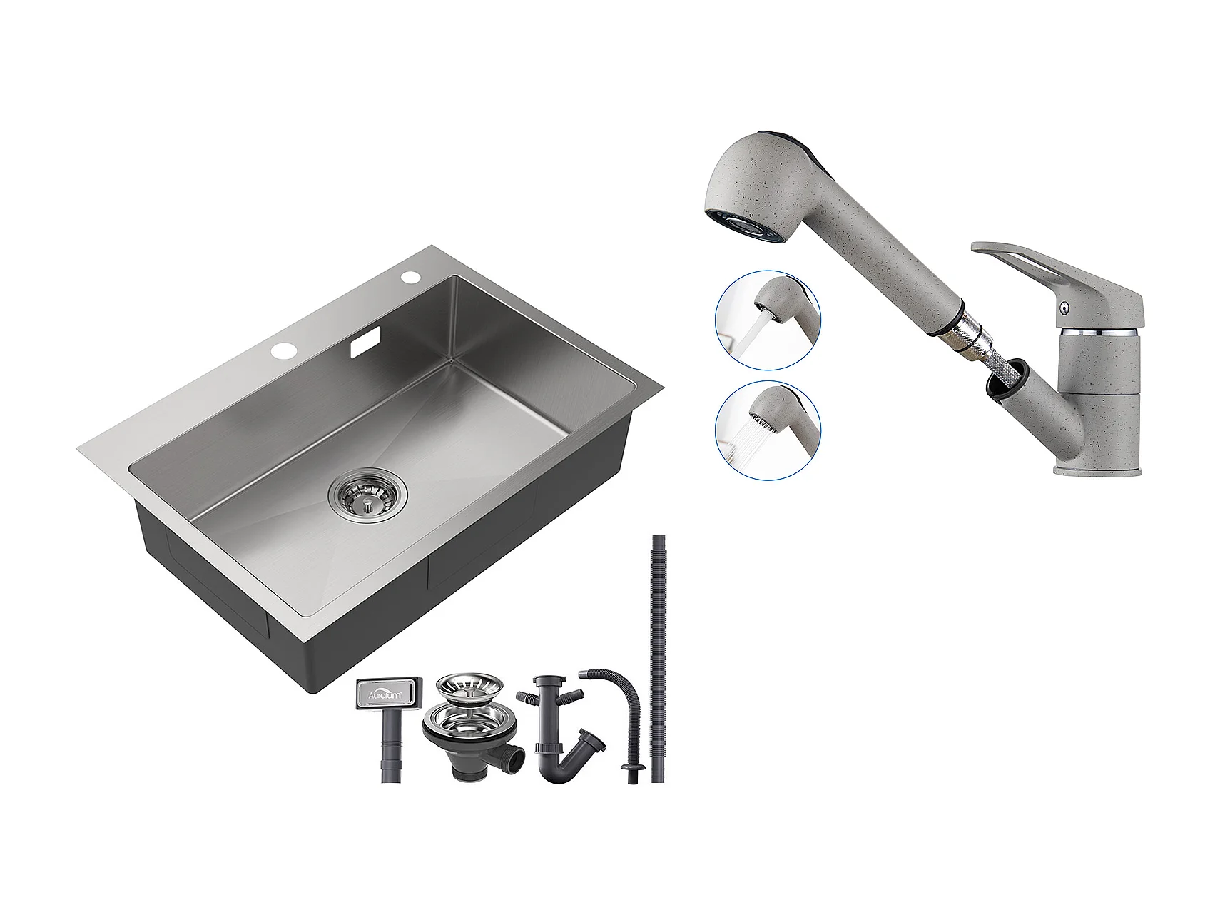 1-Bad-Küchenspüle aus gebürstetem Edelstahl 65 x 45 cm, Einbauspüle + Küchenarmatur mit ausziehbarer Brause, 2 Düsen, Warm- und Kaltwasser, grau