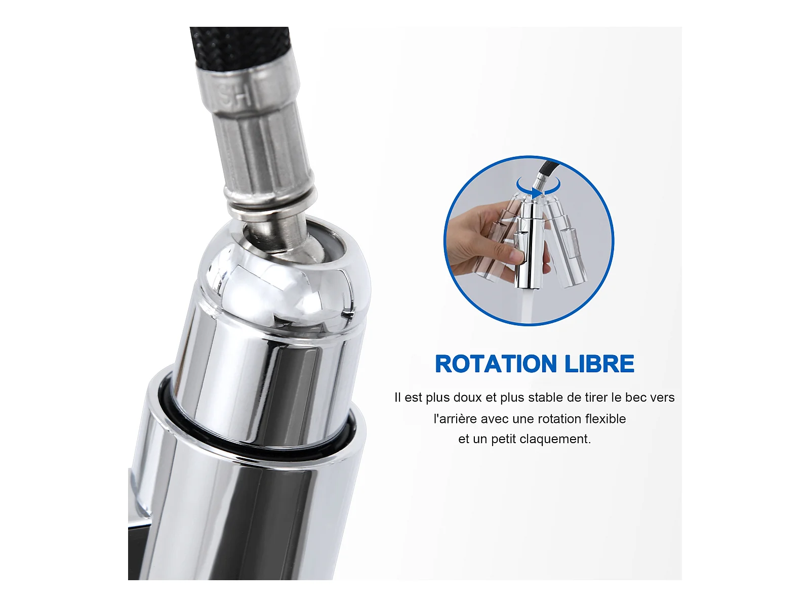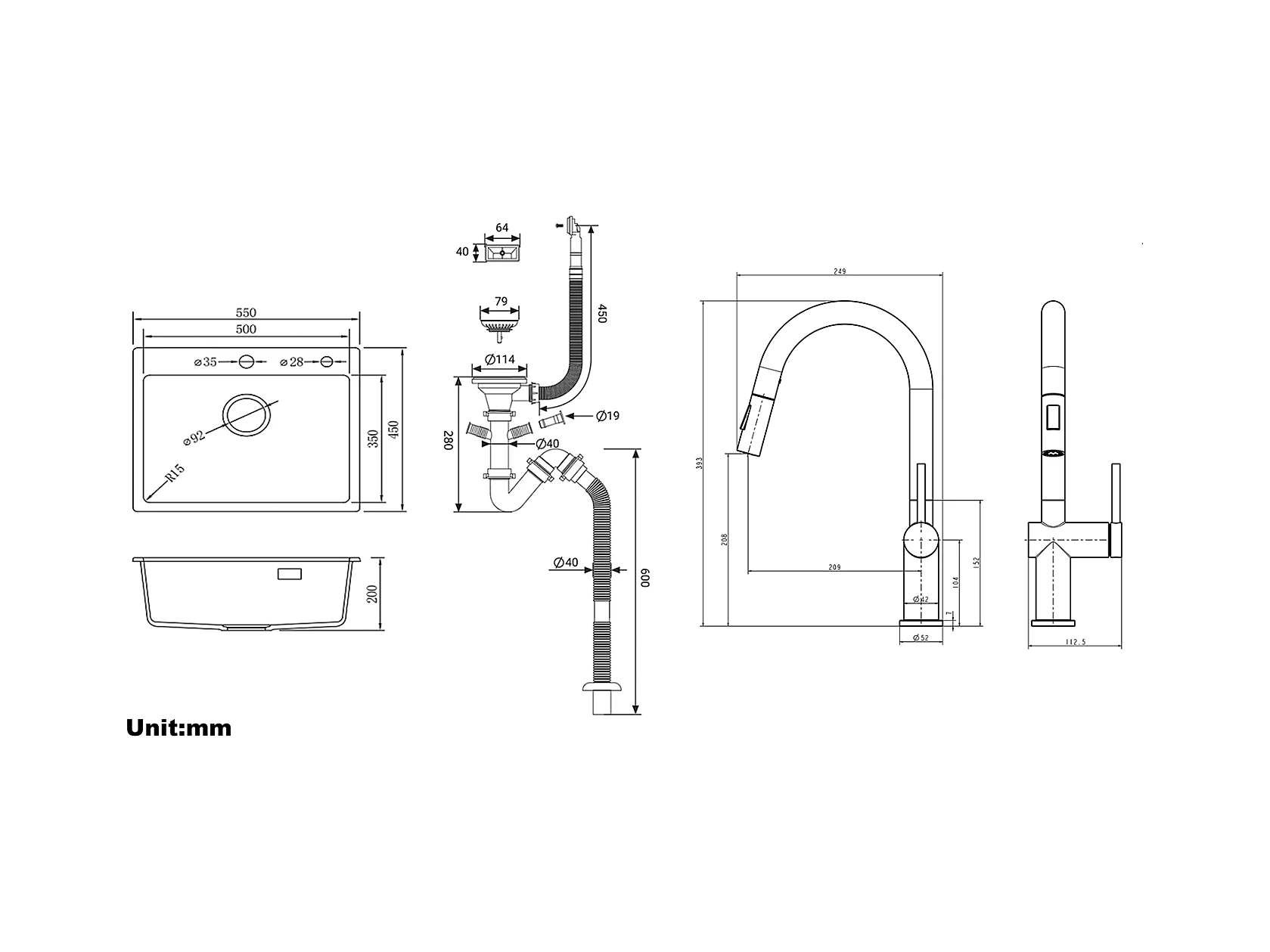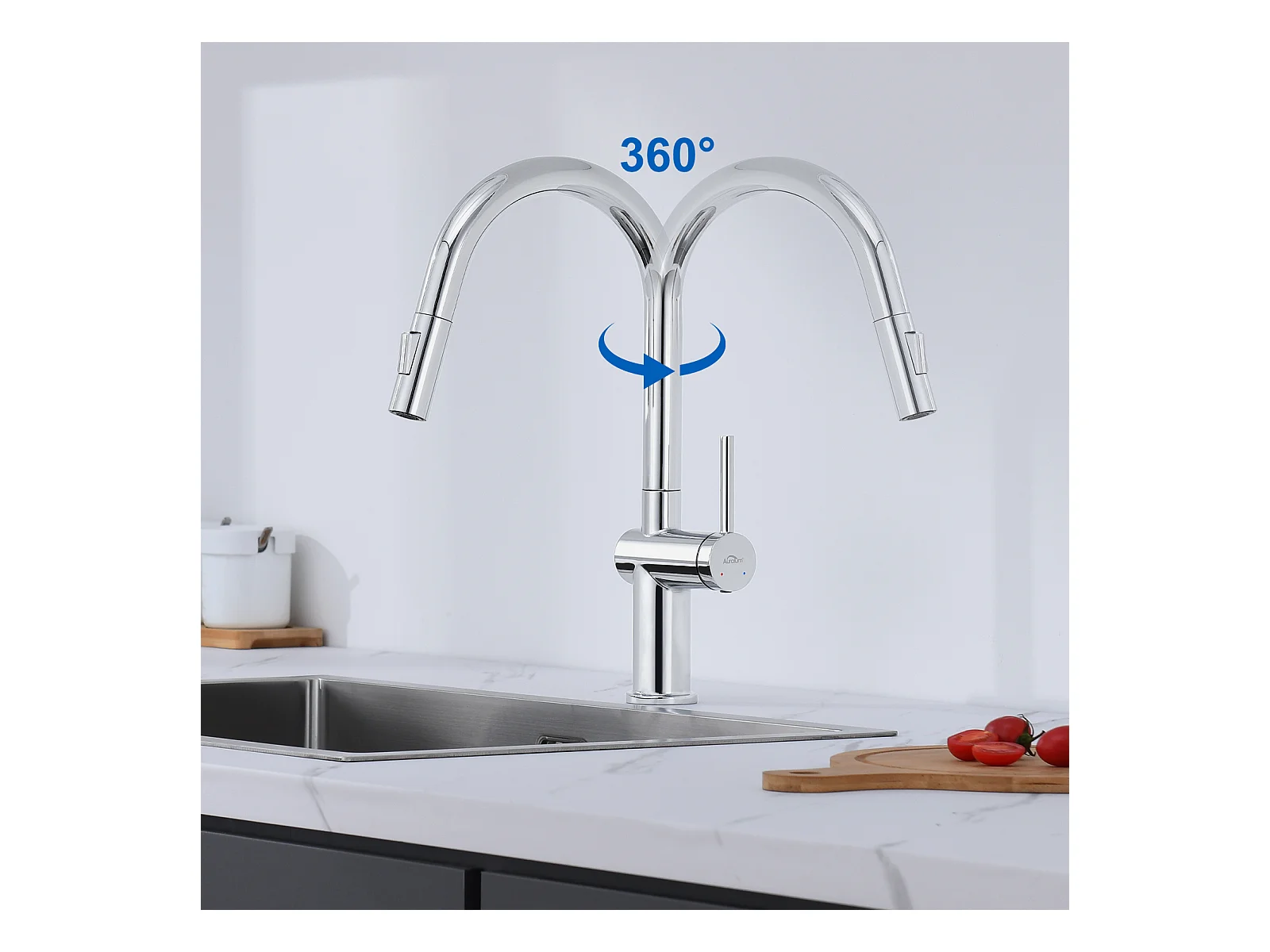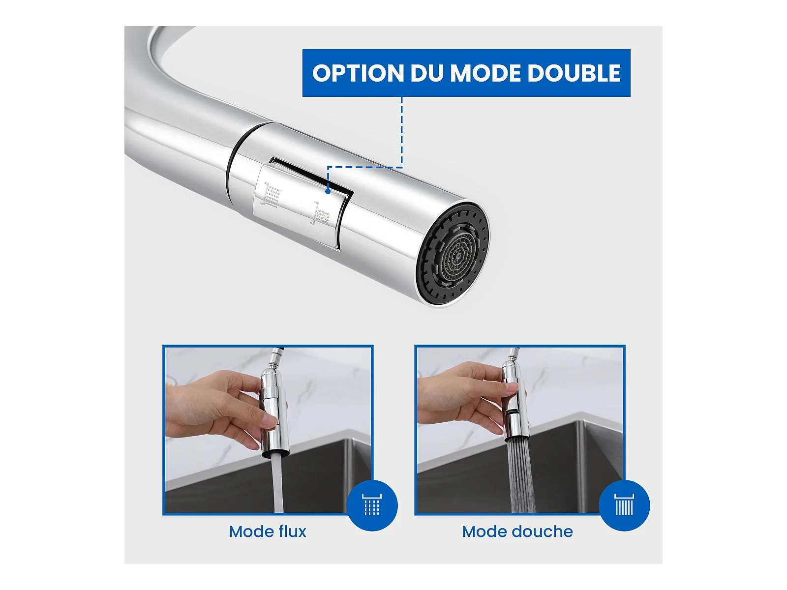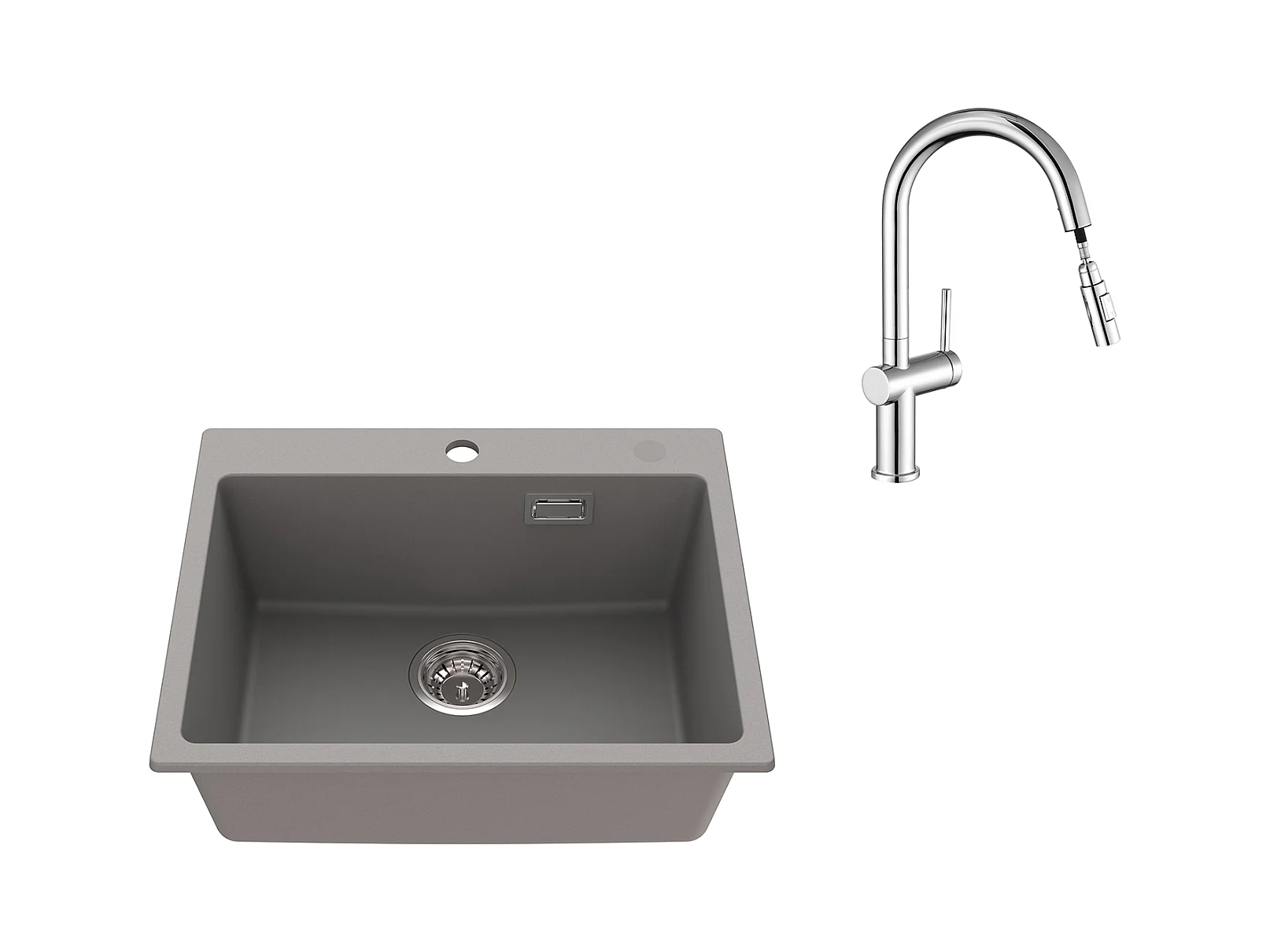 1-Becken-Granit-Küchenspüle, 55*45*20cm, Ablaufgarnitur, grau + Ausziehbarer Küchenhahn mit zwei Funktionen, Chrom