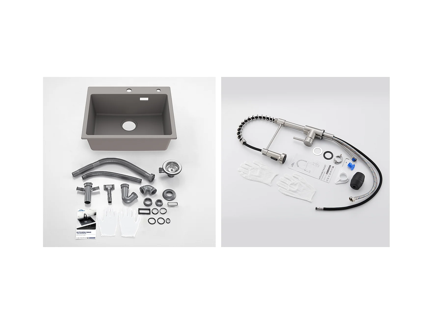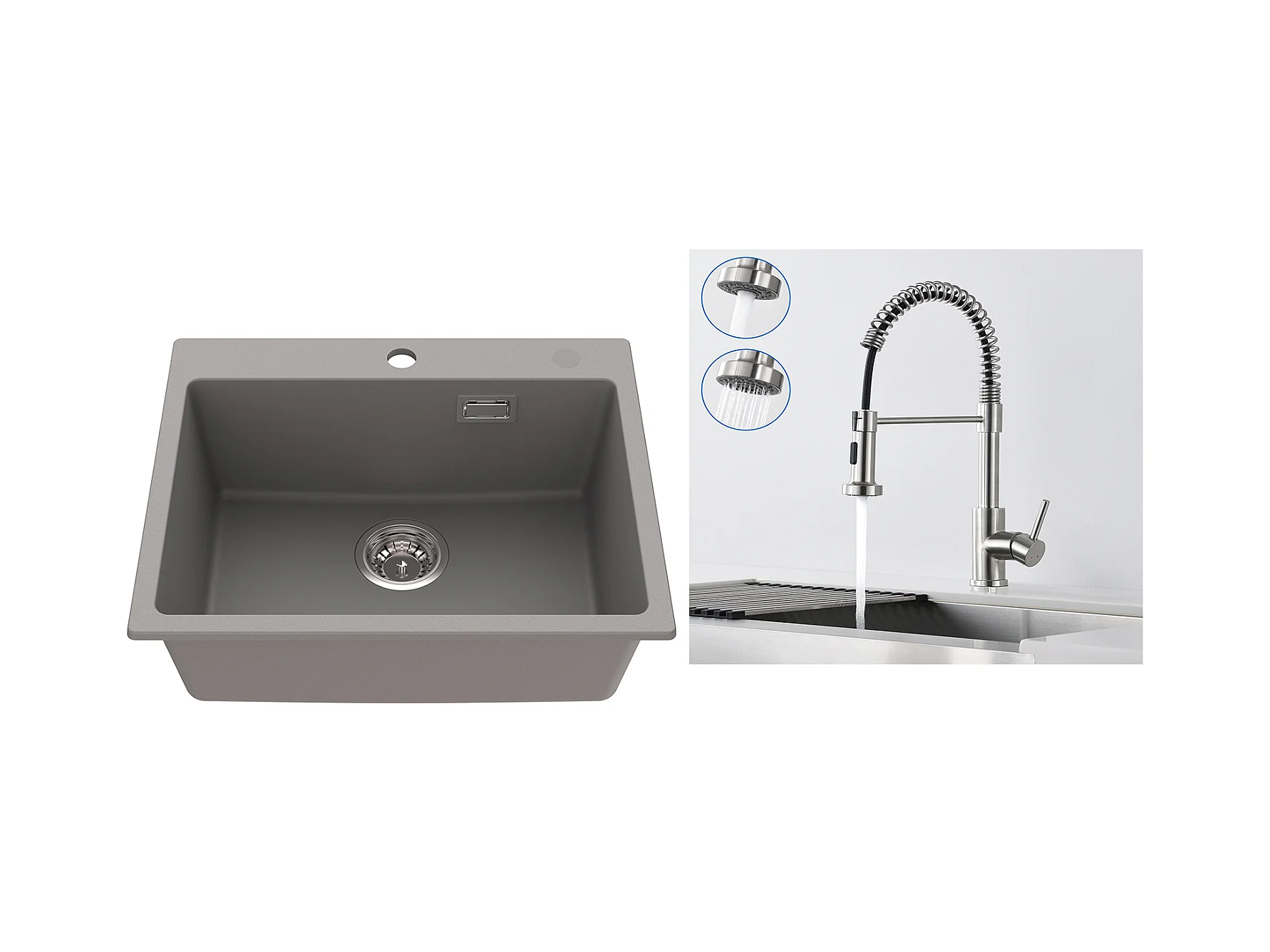 1 Becken Granit-Küchenspüle, 55*45*20cm, Ablaufgarnitur, Grau + Feder-Küchenarmatur mit ausziehbarem Sprüher, 2 Modi, 360° schwenkbar, Gebürstet
