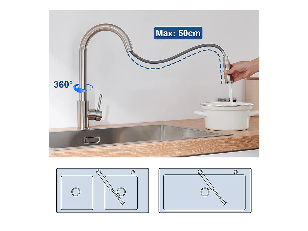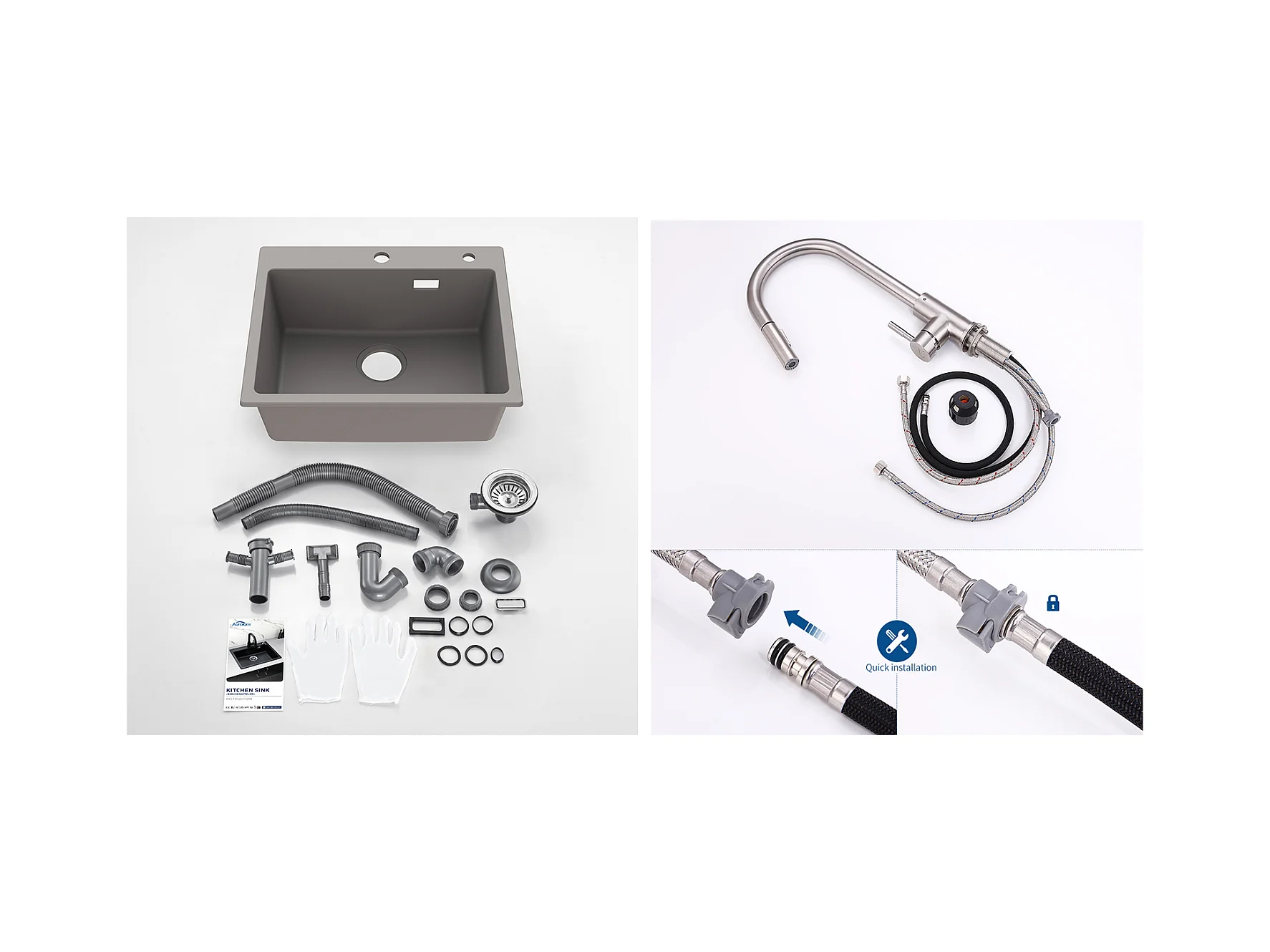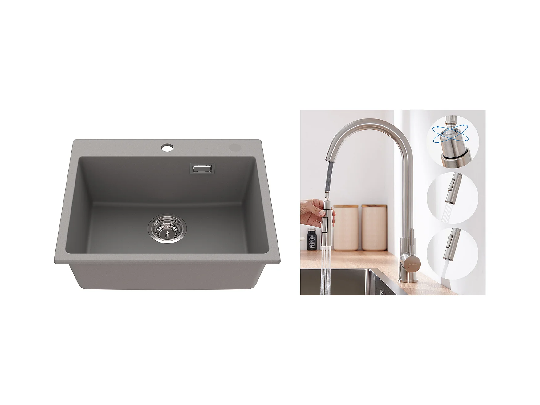 1 Becken Granit-Küchenspüle, 55*45*20cm, Ablaufgarnitur, grau + Küchenmischbatterie mit ausziehbarer Brause, 2 Modi, heißes/kaltes Wasser, gebürstet