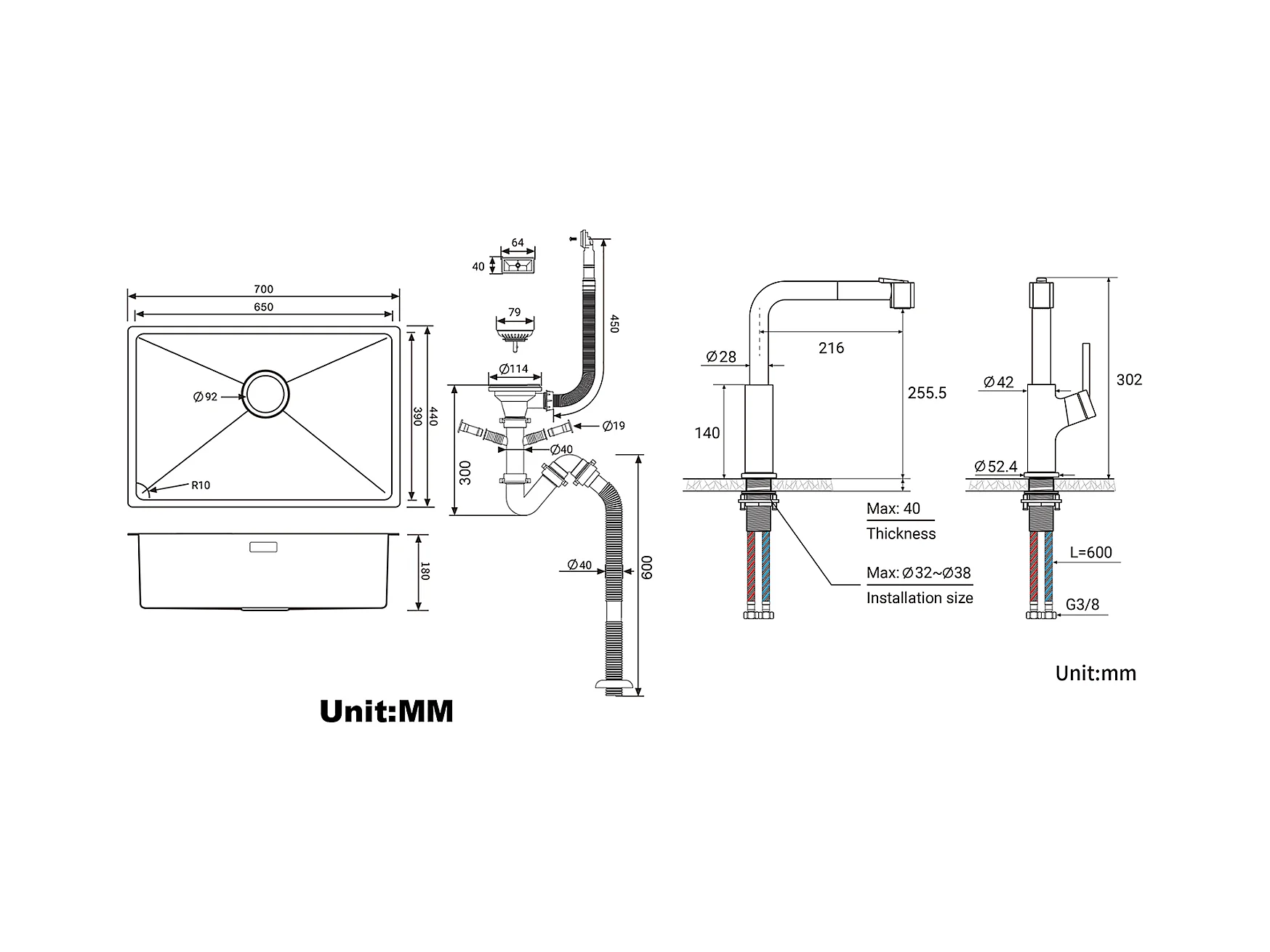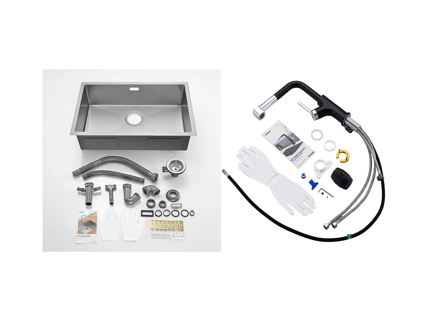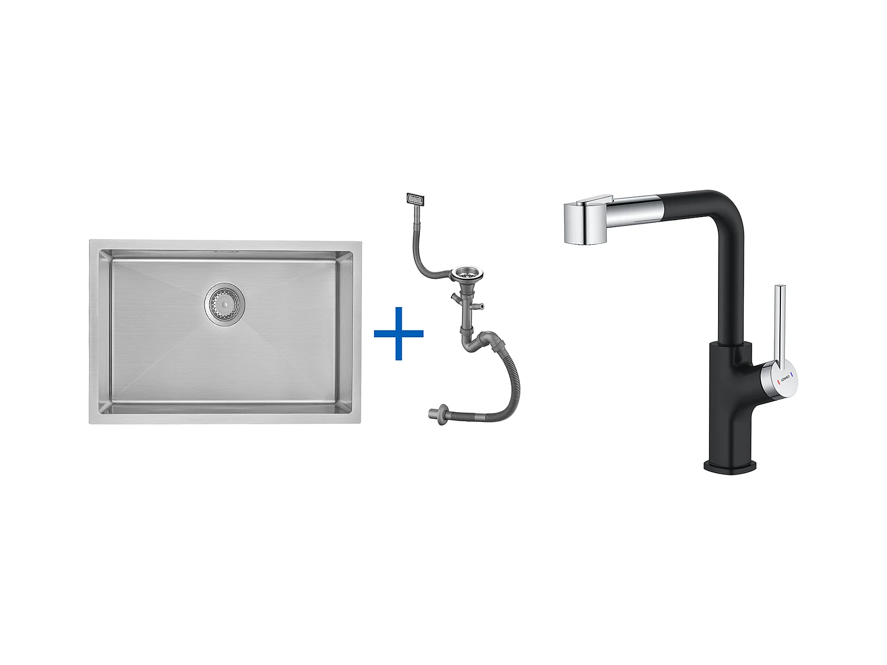 1 Becken Küchenspüle 70*44*19CM, Einbau/Blumen/Unterbau, mit Siphon/Überlauf, Gebürsteter + Drehbarer Ausziehbarer Küchenarmatur aus Edelstahl