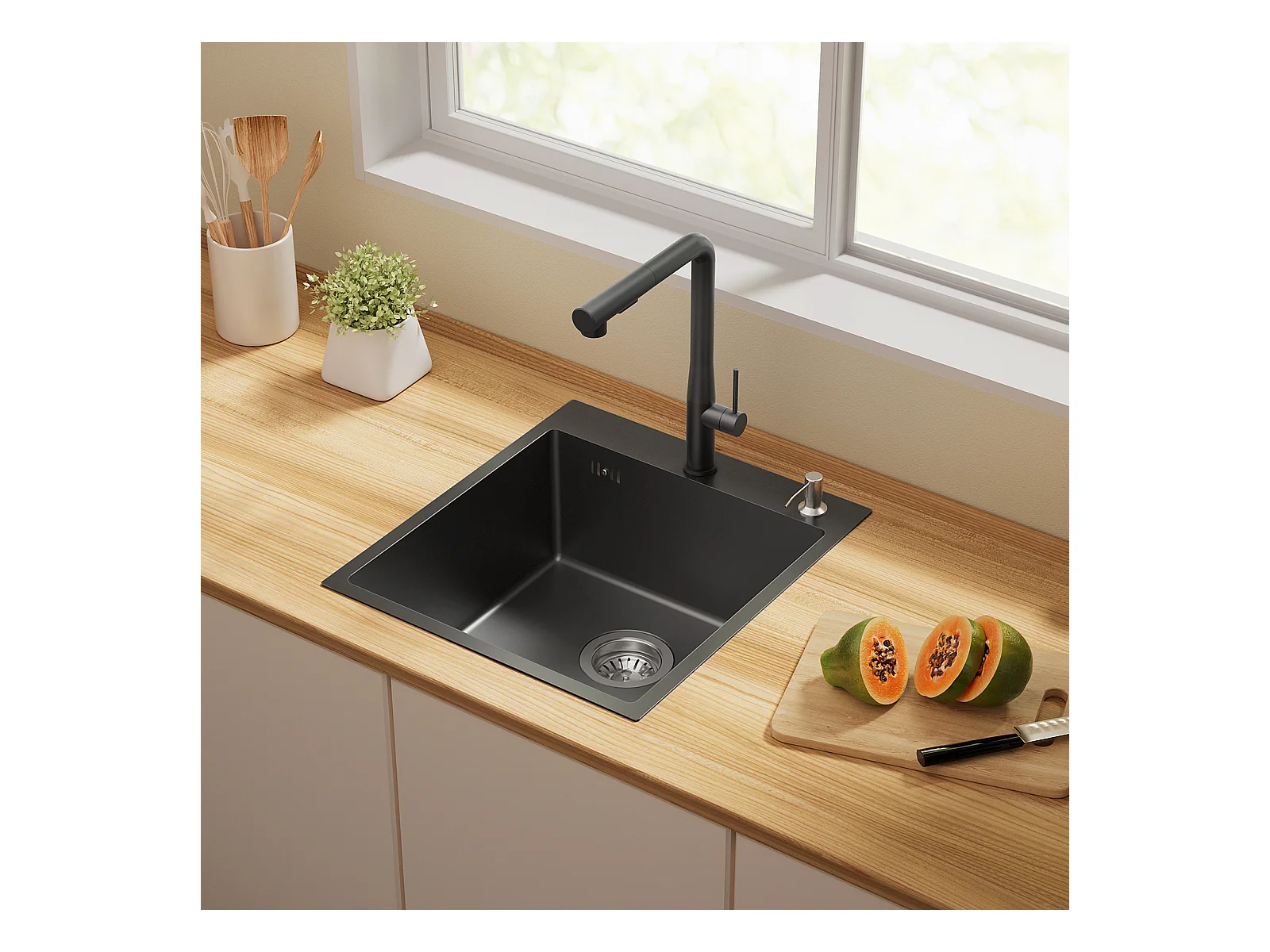 1 Becken Küchenspüle Grau-Schwarz, 44*49*20 CM, mit Seifenspender, Edelstahl, Einbau/Aufputz + Küchenarmatur, 360° schwenkbar, Warm-/Kaltwasser, Schwarz