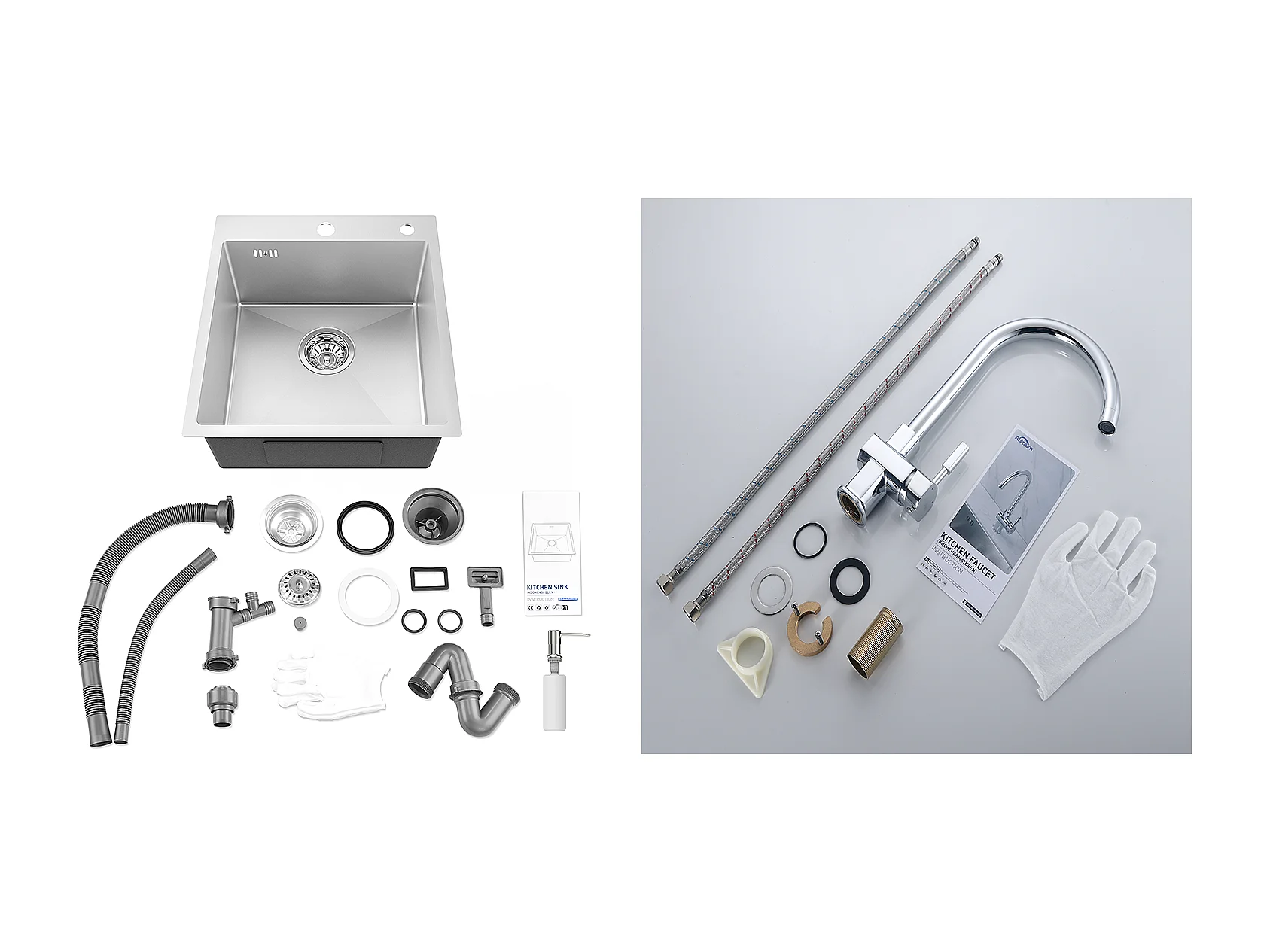 1-Behälter-Küchenspüle, silber, 44 x 49 x 20 cm, mit Seifenspender, Edelstahl + 360° schwenkbarer Chrom-Küchenhahn, Kalt-/Warmwasser