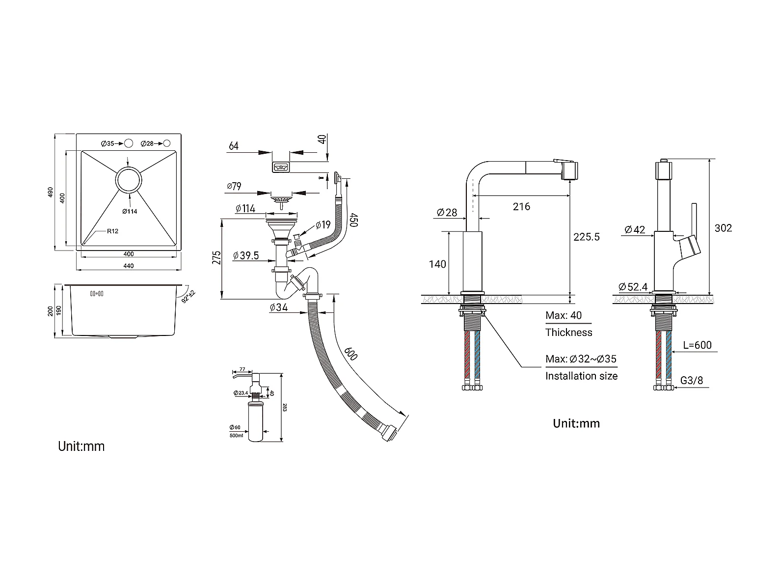 1-Beutel Silber Küchenspüle, 44*49*20 CM, mit Seifenspender, Edelstahl + 360° drehbarer ausziehbarer Edelstahl Küchenarmatur