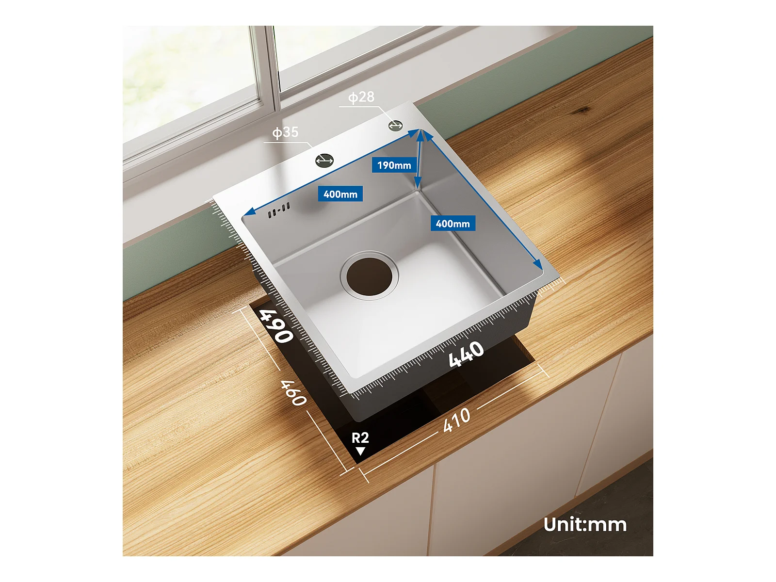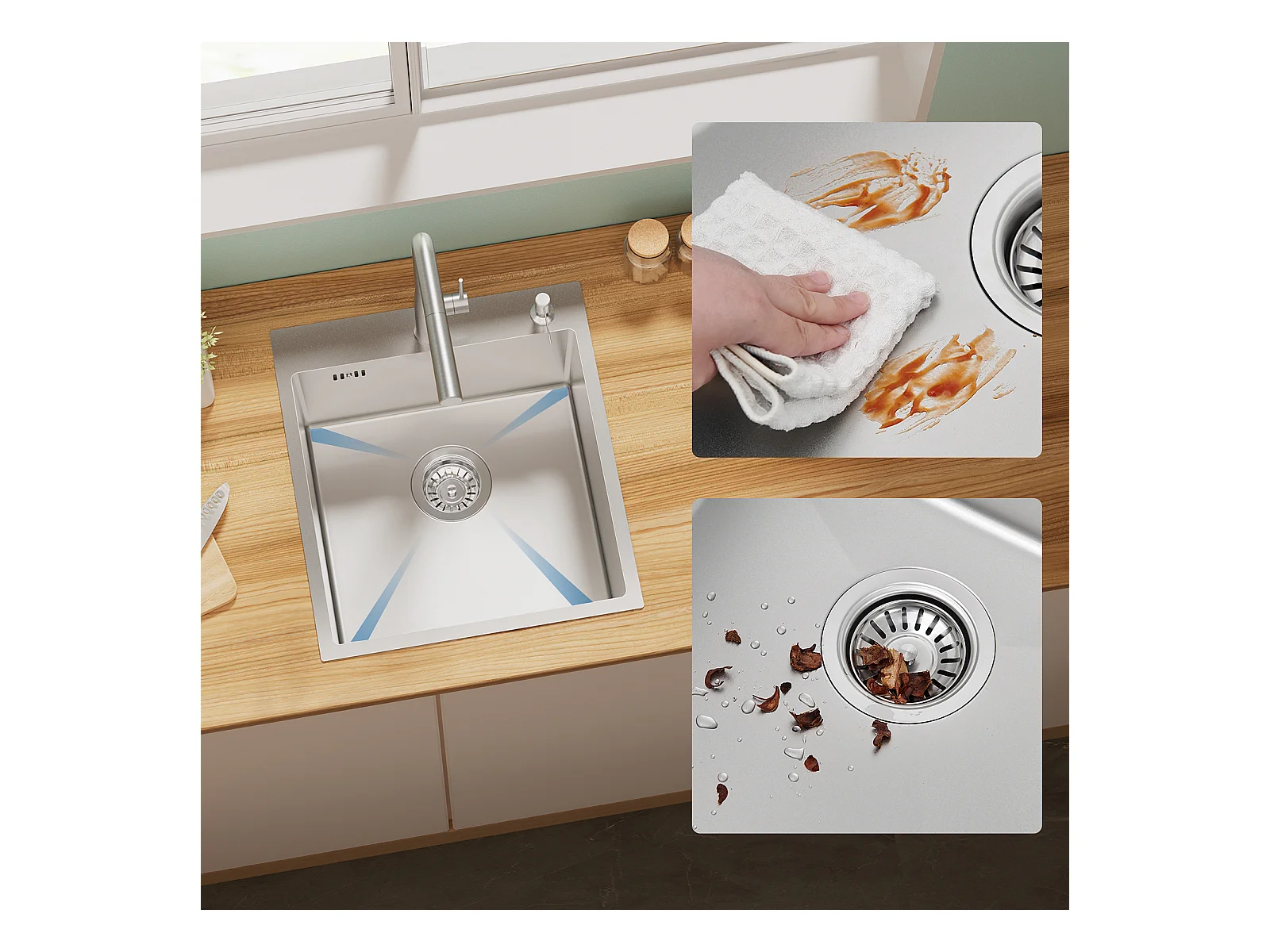 1-Bin Silber Küchenspüle, 44*49*20 CM, mit Seifenspender, Edelstahl + Küchenarmatur mit ausziehbarer Brause Chrom 360° drehbar, Chrom