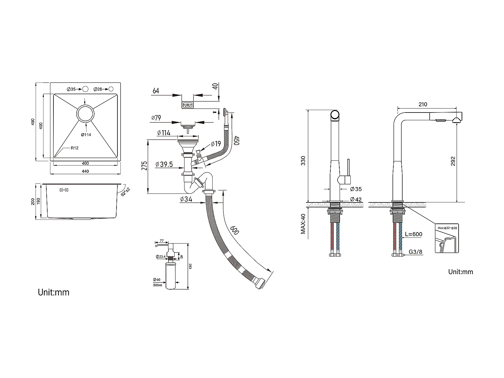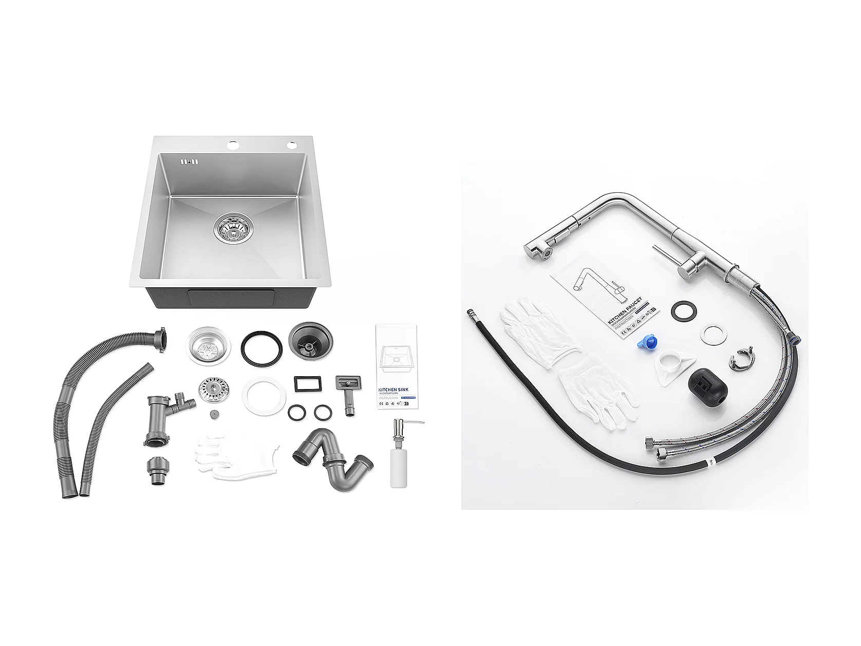 1-Bin Silber Küchenspüle, 44*49*20 CM, mit Seifenspender, Edelstahl + Küchenmischbatterie mit 360° drehbarer Ausziehbrause, gebürstet
