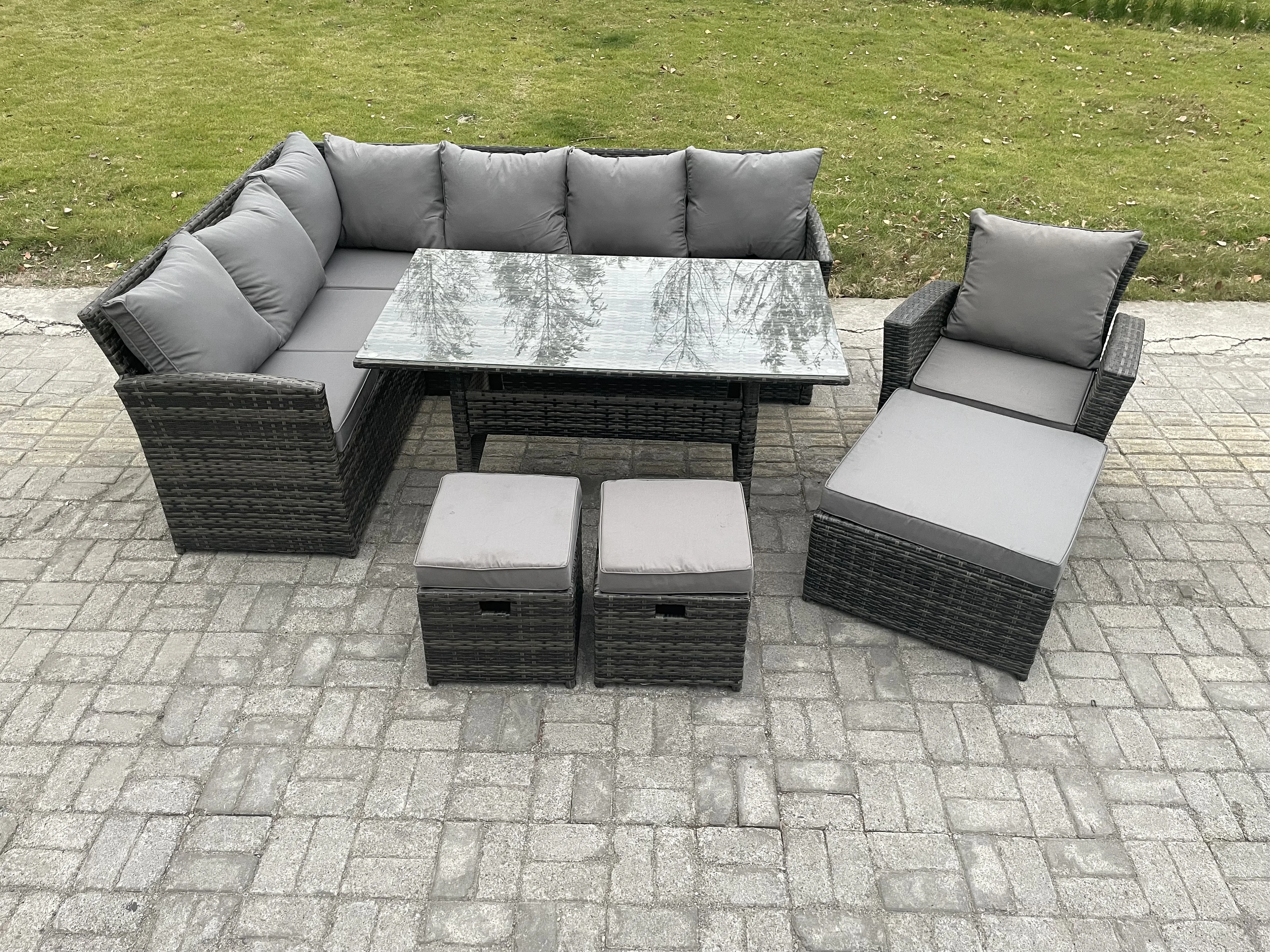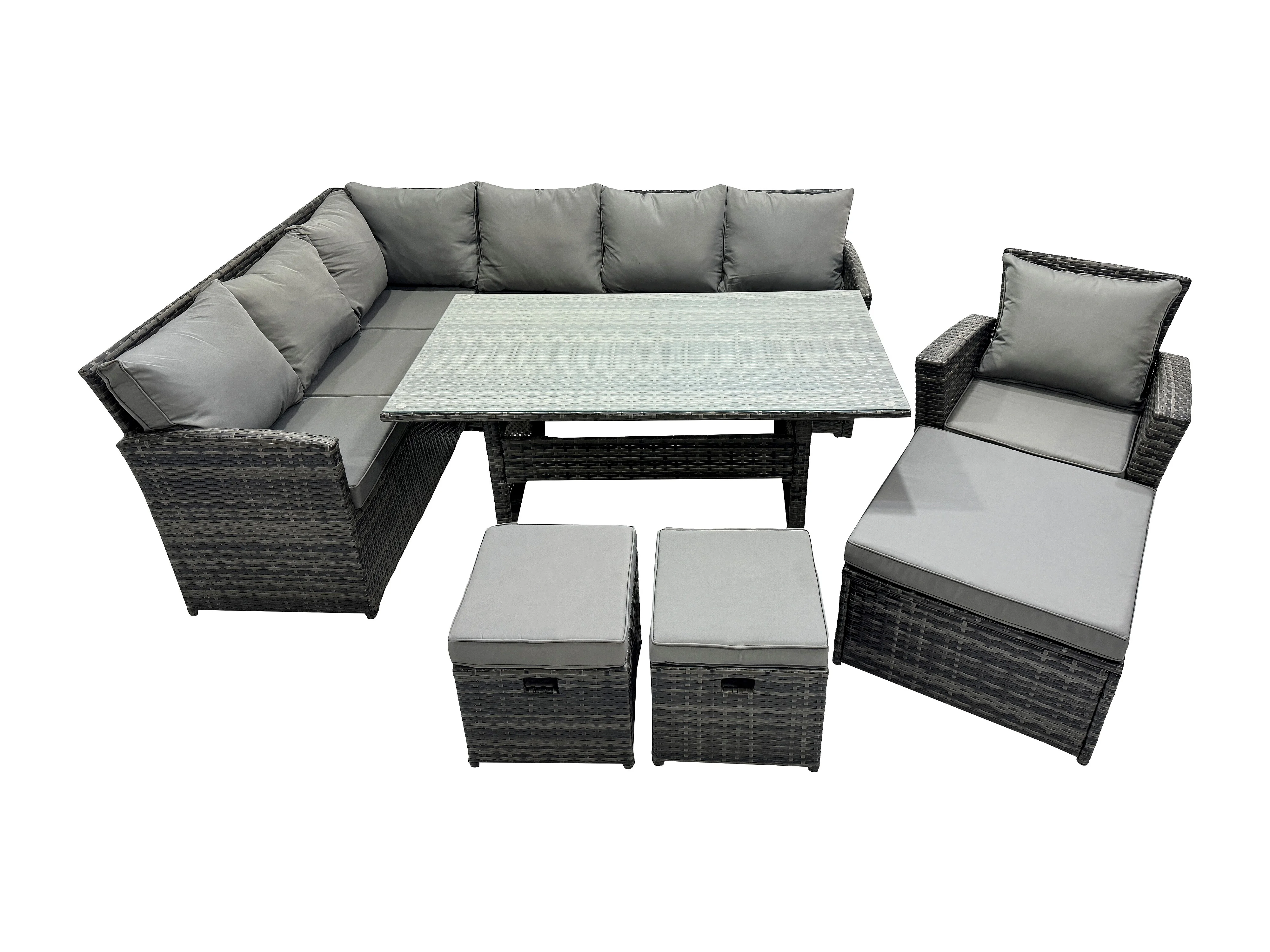 10 Sitzer Outdoor Rattan Gartenmöbel-Set mit Rechteckiger Esstisch 3 Hockern Sessel Dunkelgrau gemischt