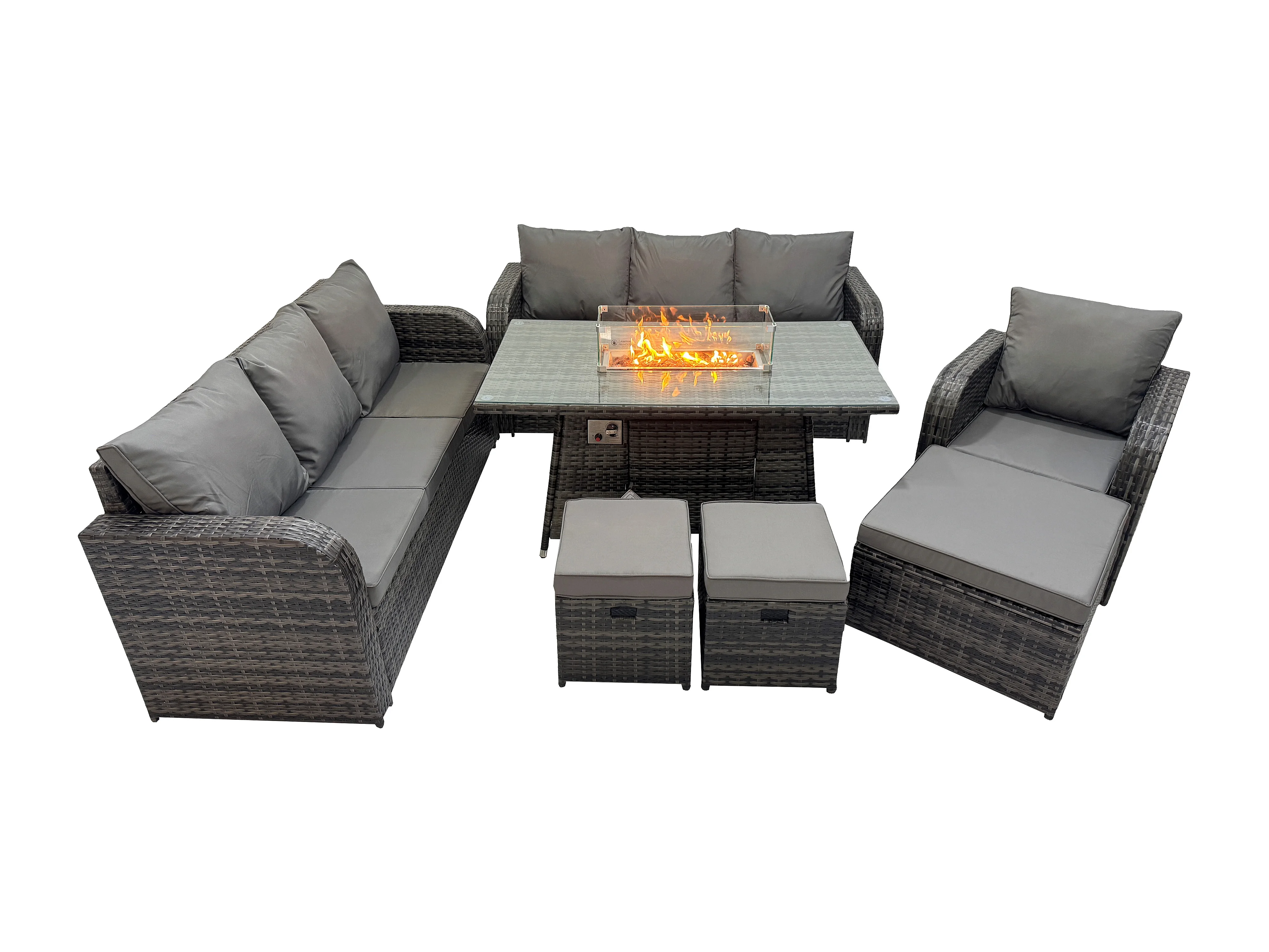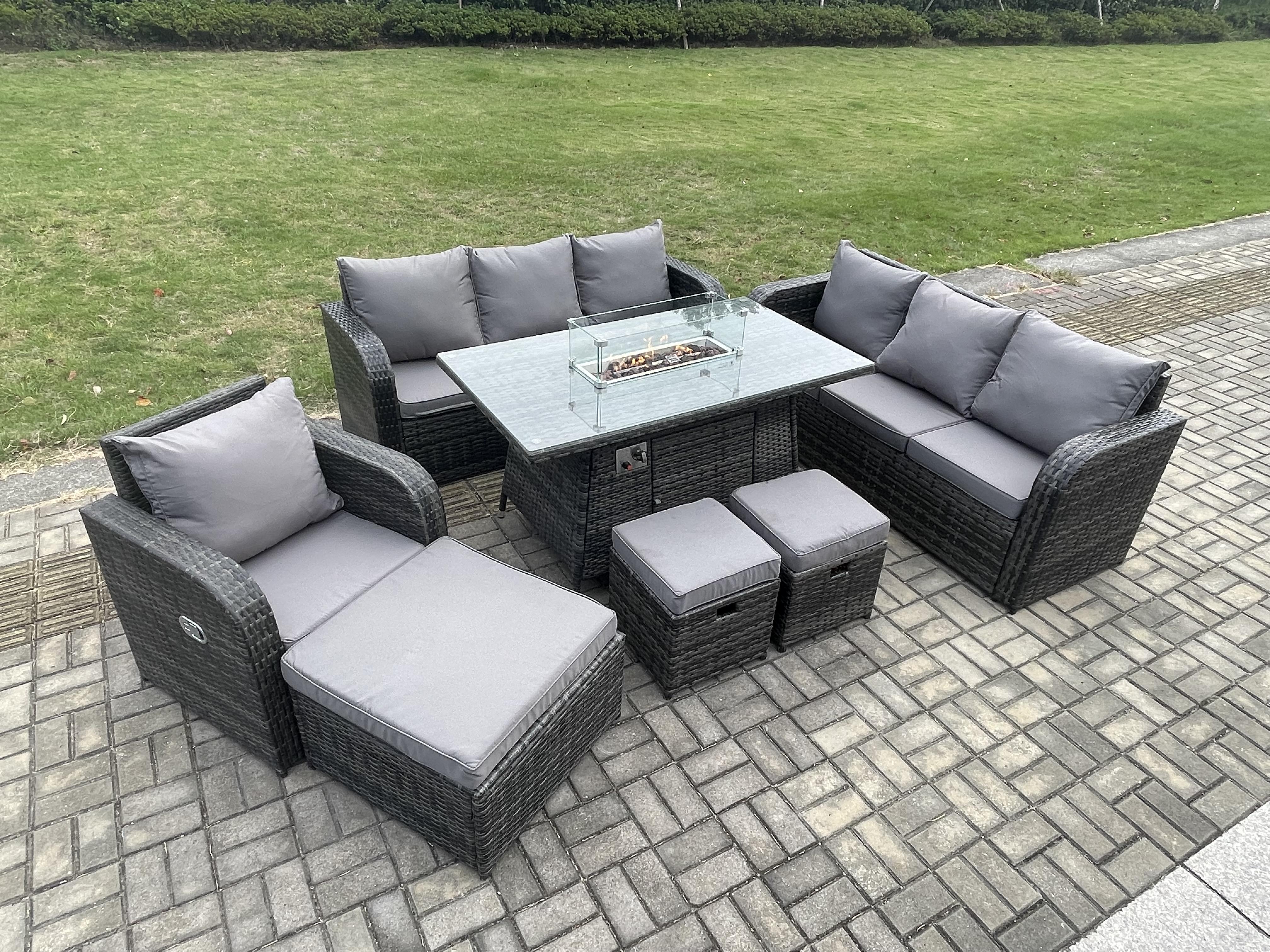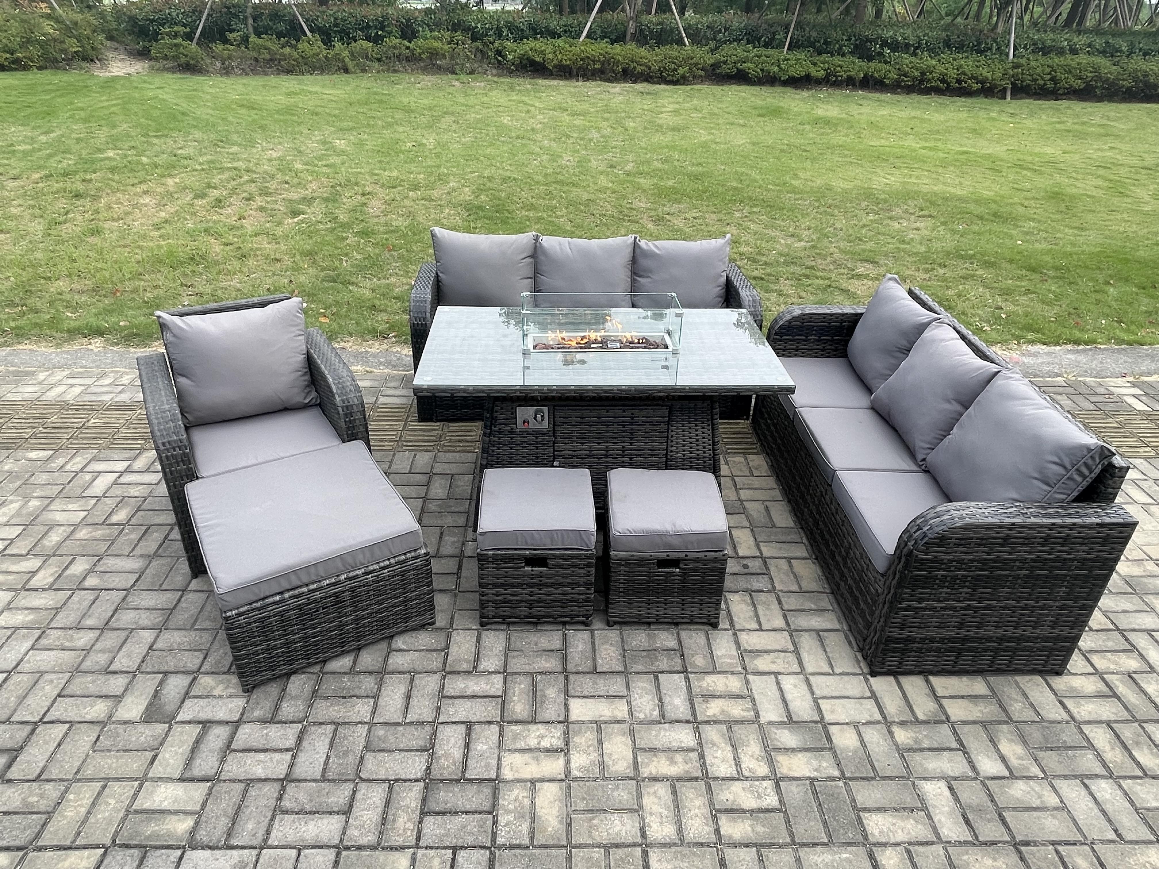 10-Sitzer Polyrattan Gartenmöbel Set Gas Feuerstelle Esstisch Liegestühle 3-Sitzer Sofa Set mit 3 Hockern