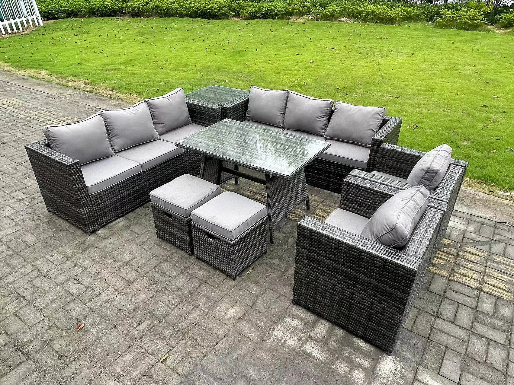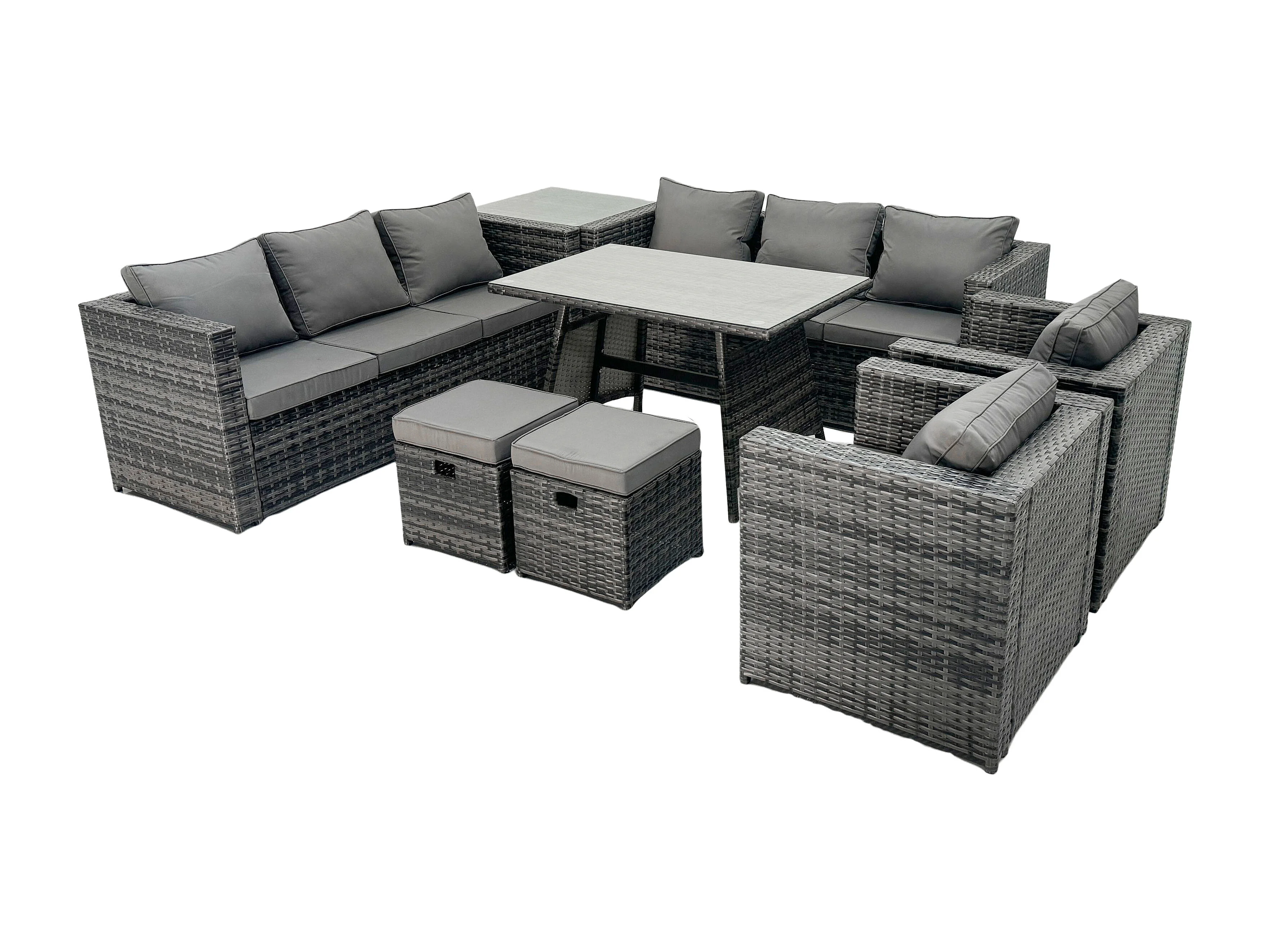 10-Sitzer Polyrattan Gartenmöbel Set im Balkon Lounge Sofa Garten Esstisch Set mit Beistelltisch Sesseln 2 Hockern Dunkelgrau Gemischt