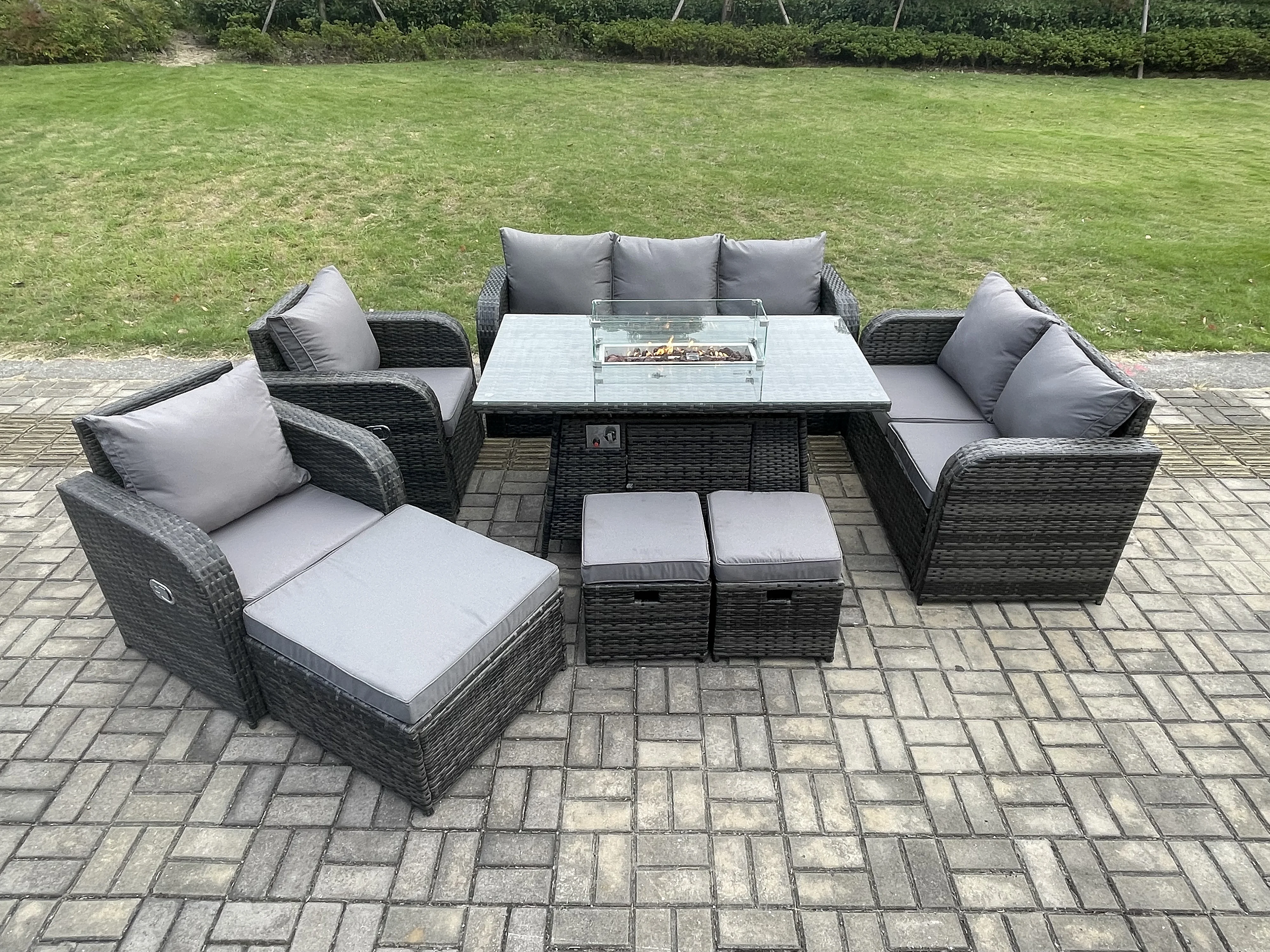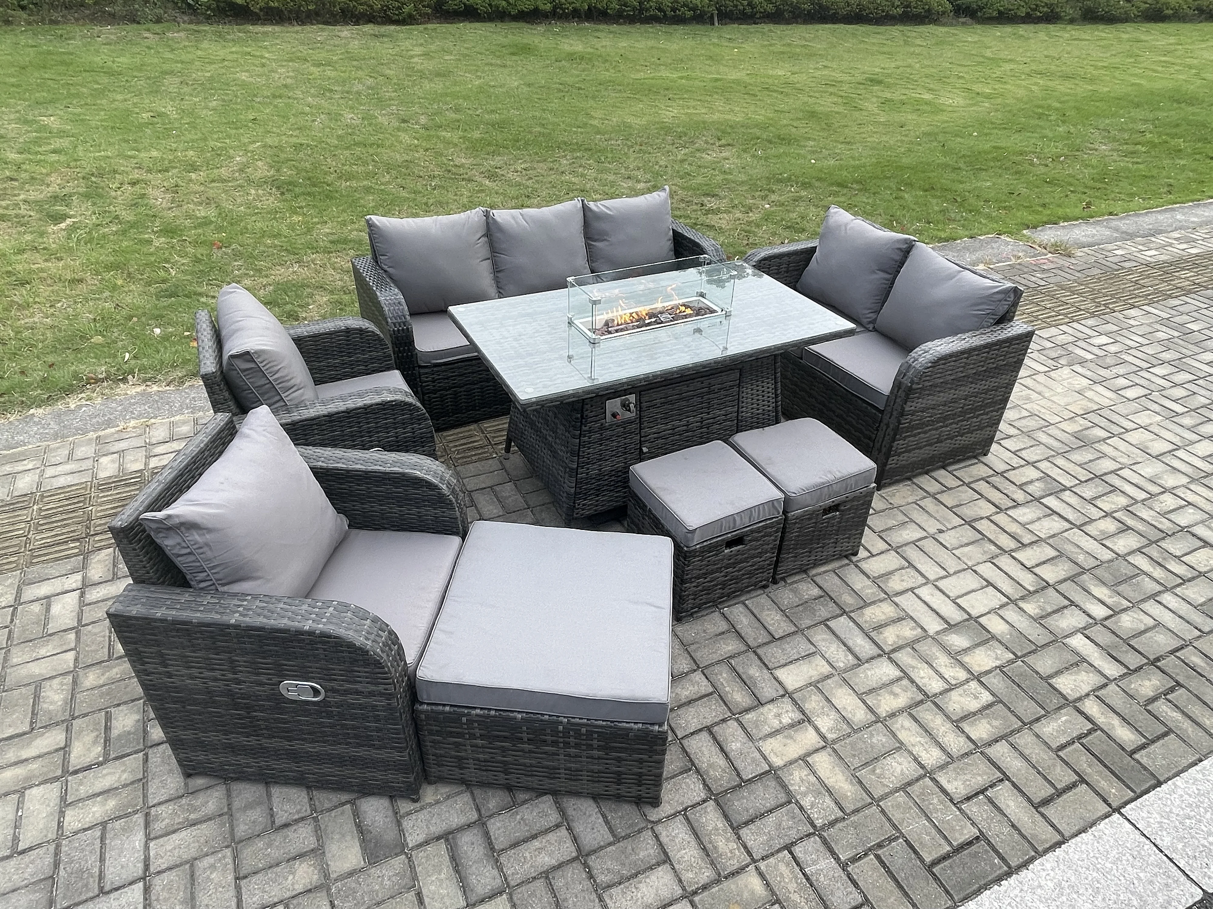 10-Sitzer Polyrattan Gartenmöbelset Gasfeuerstelle Esstisch und Sofa Sessel set mit 3 Hockern