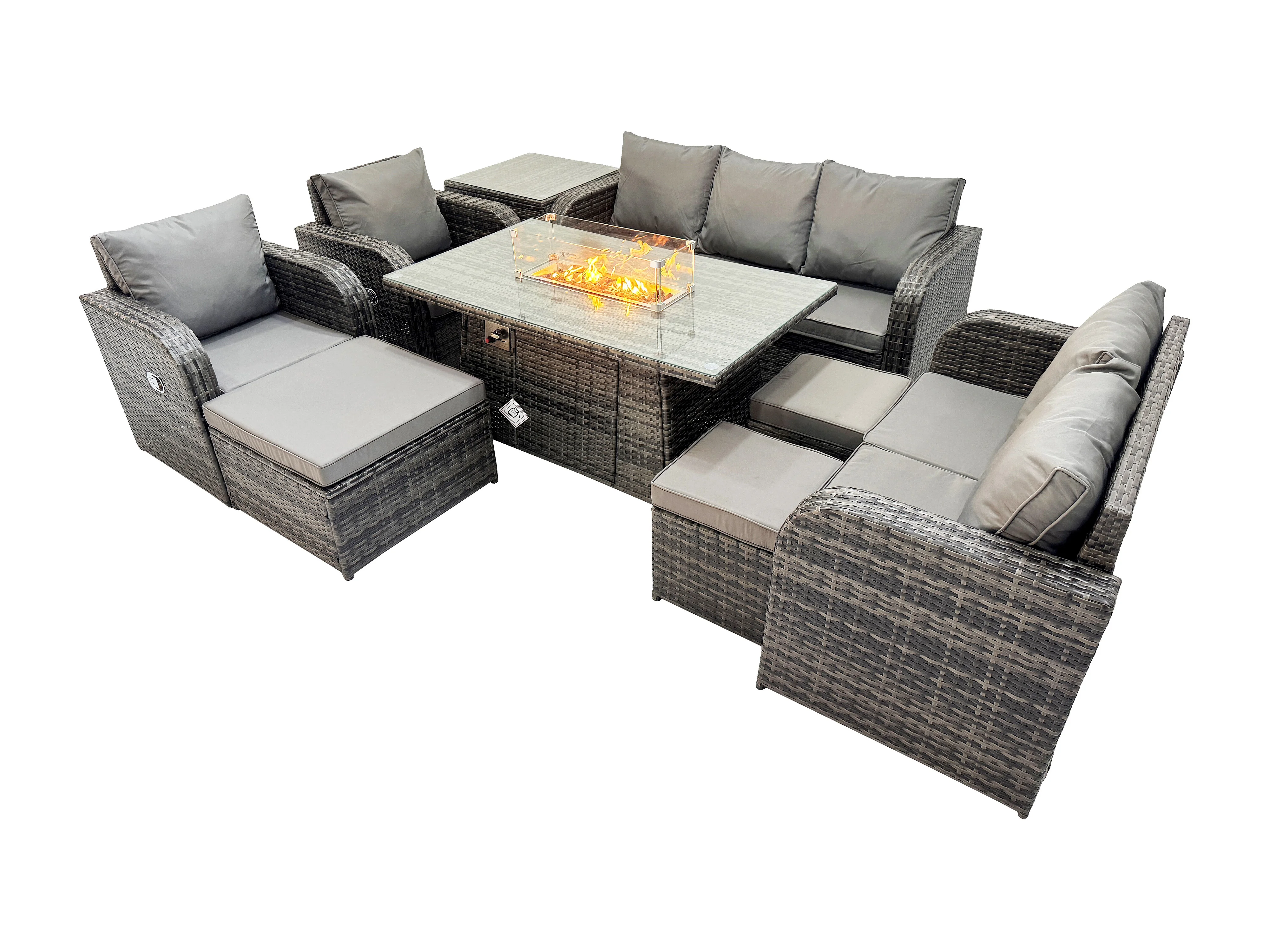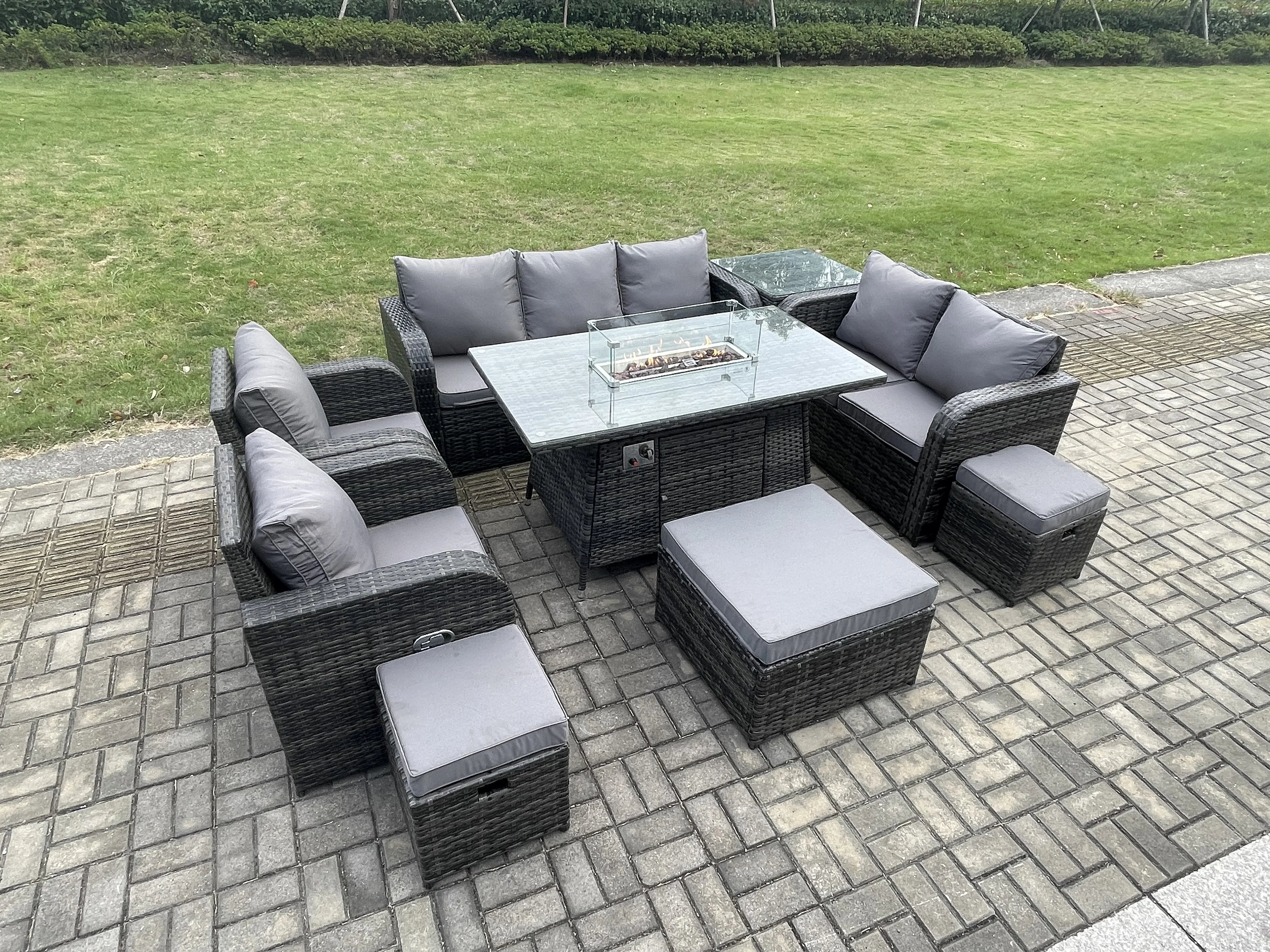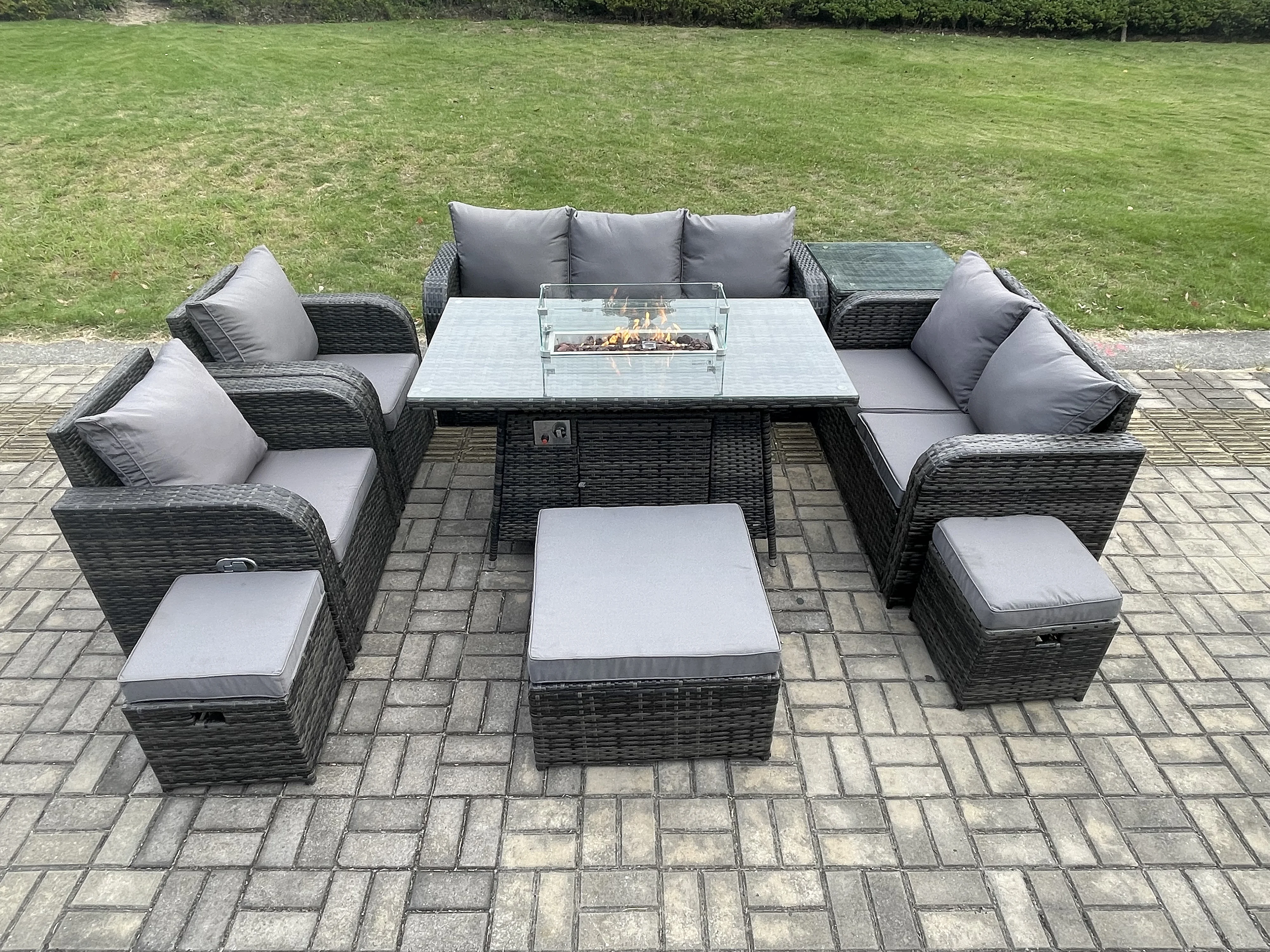 10-Sitzer Polyrattan Gartenmöbelset Gasfeuerstelle Esstisch und Sofa Sessel set mit 3 Hockern Beistelltisch