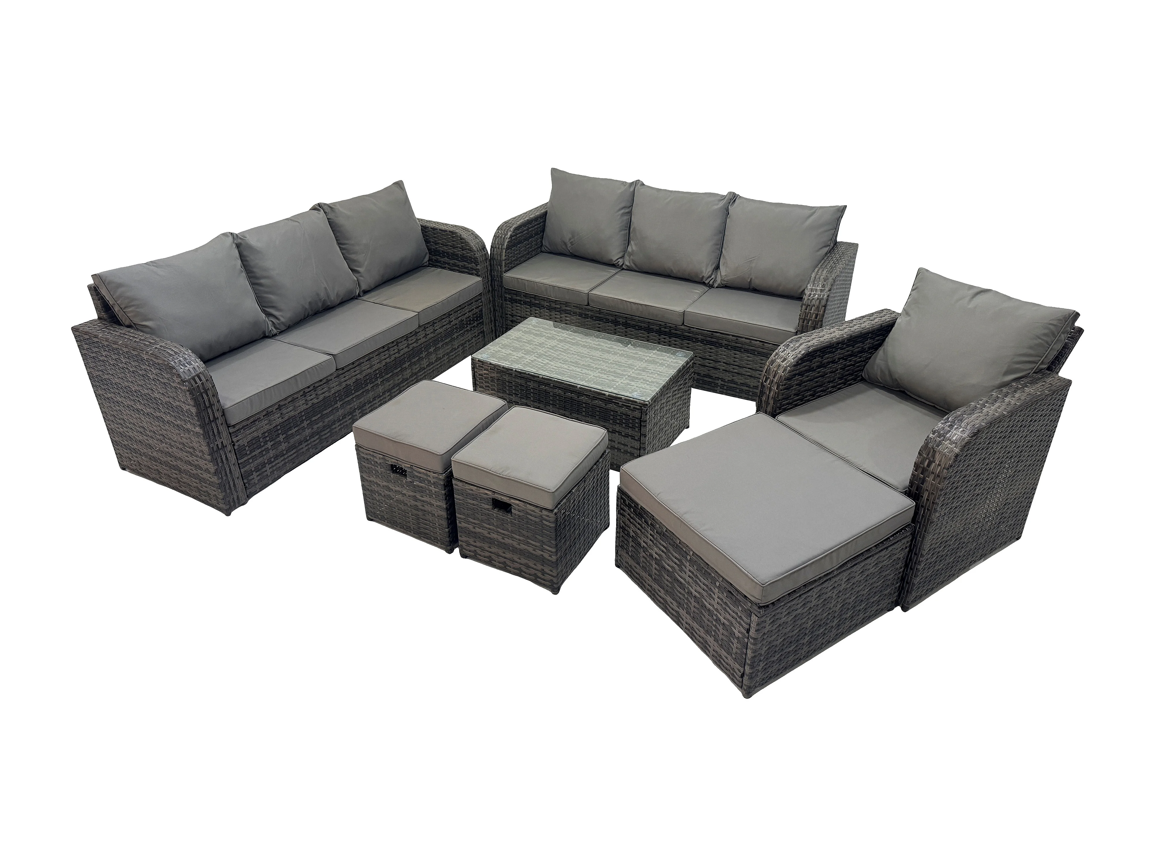 10-Sitzer Rattan Lounge Sofa Set Gartenmöbel-Set mit Rechteckiger Couchtisch 3-Sitzer Sofa 3 Hockern Dunkelgrau Gemischt
