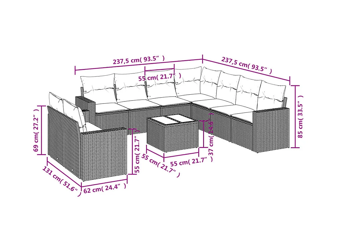 10-tlg. Garten-Sofagarnitur mit Kissen Braun Poly Rattan