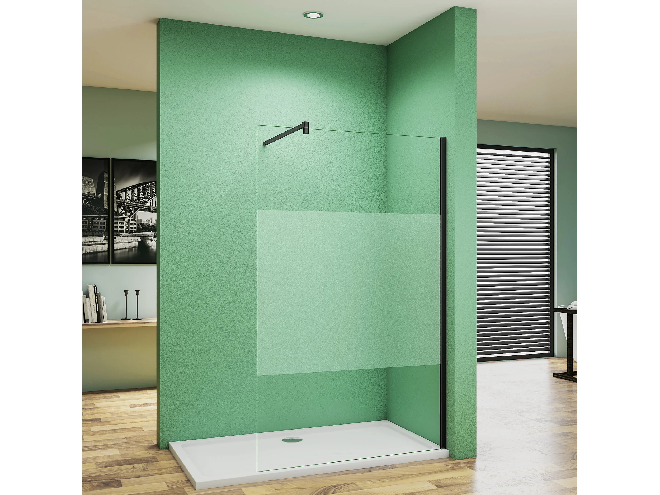110x200cm Schwarzrahmen Duschabtrennung Walk In 8mm Nano ESG Milchglasstreifen Duschabtrennung + F Form 140cm Stabilisator Höhe 200cm