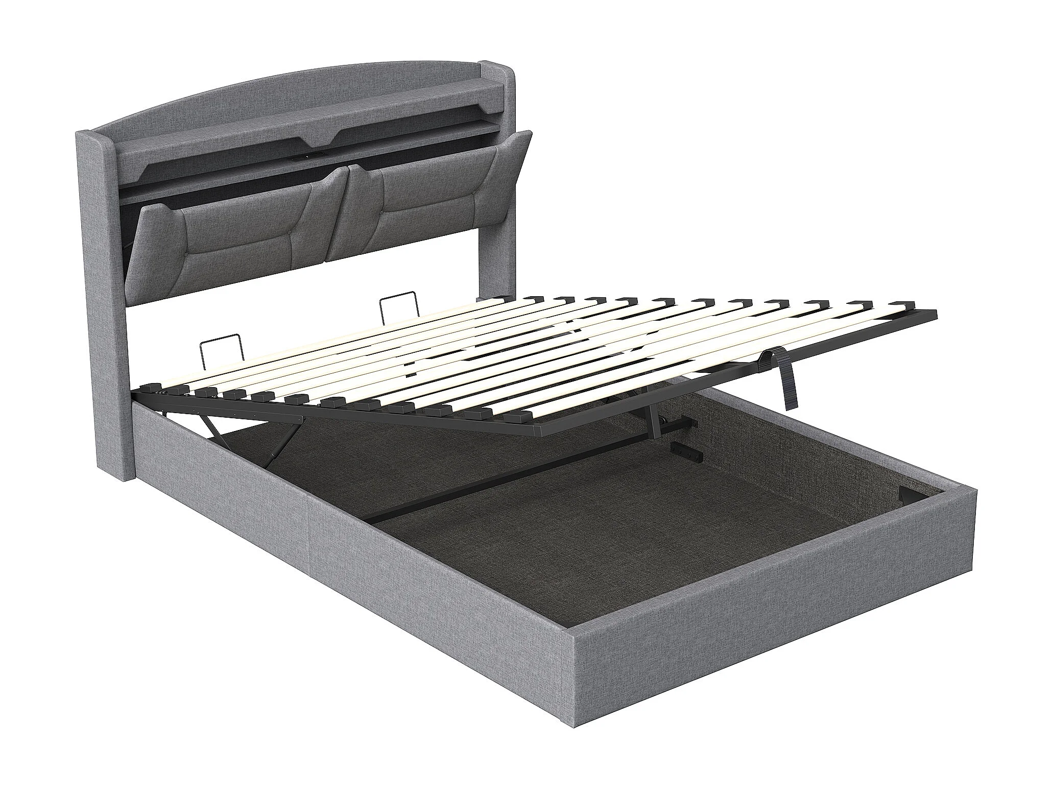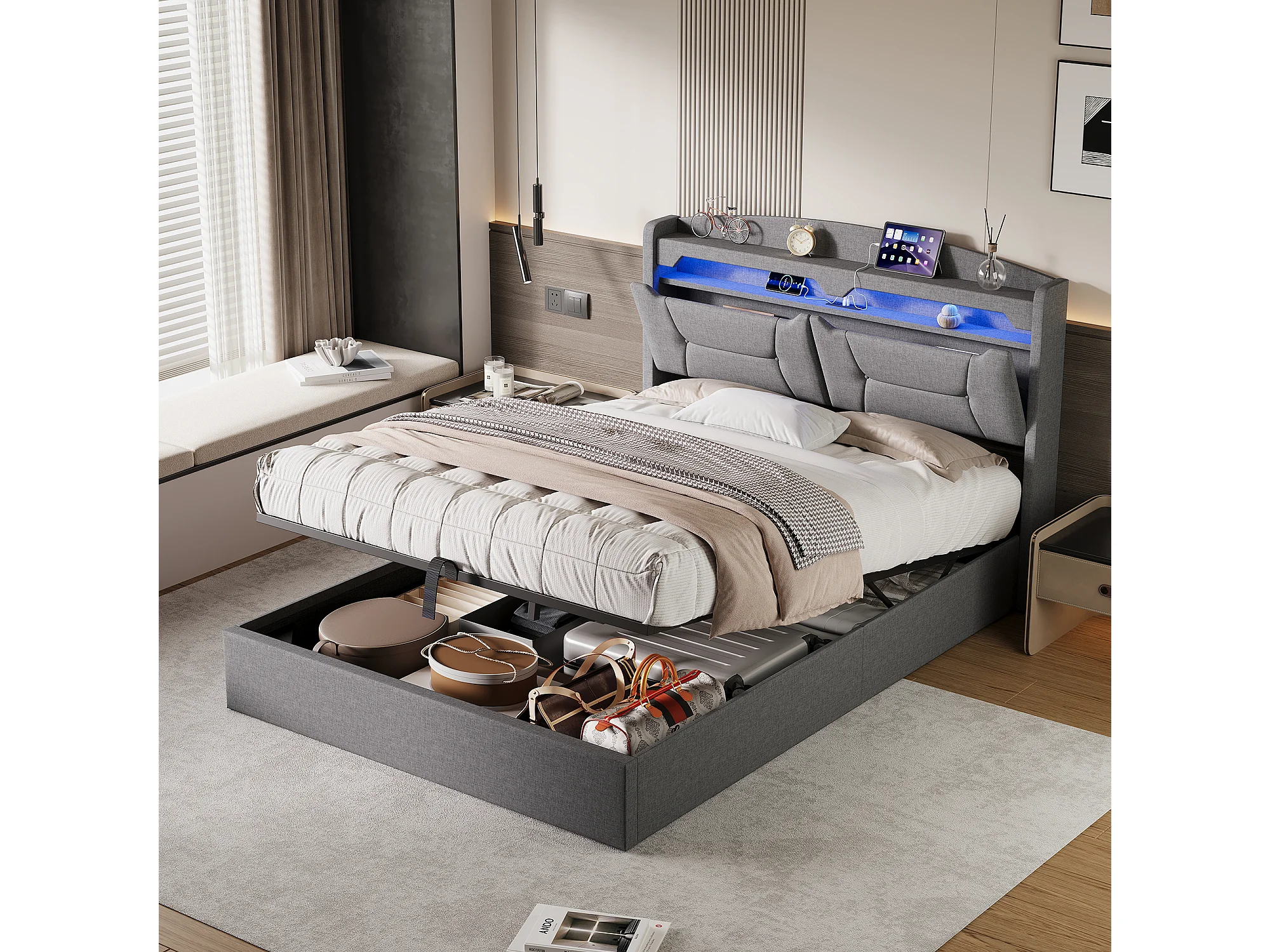 140 x 190 cm großes Bett mit Stauraum, multifunktionalem Kopfteil, RGB-LED-Beleuchtung und großem Stauraum – hellgrauer Stoff