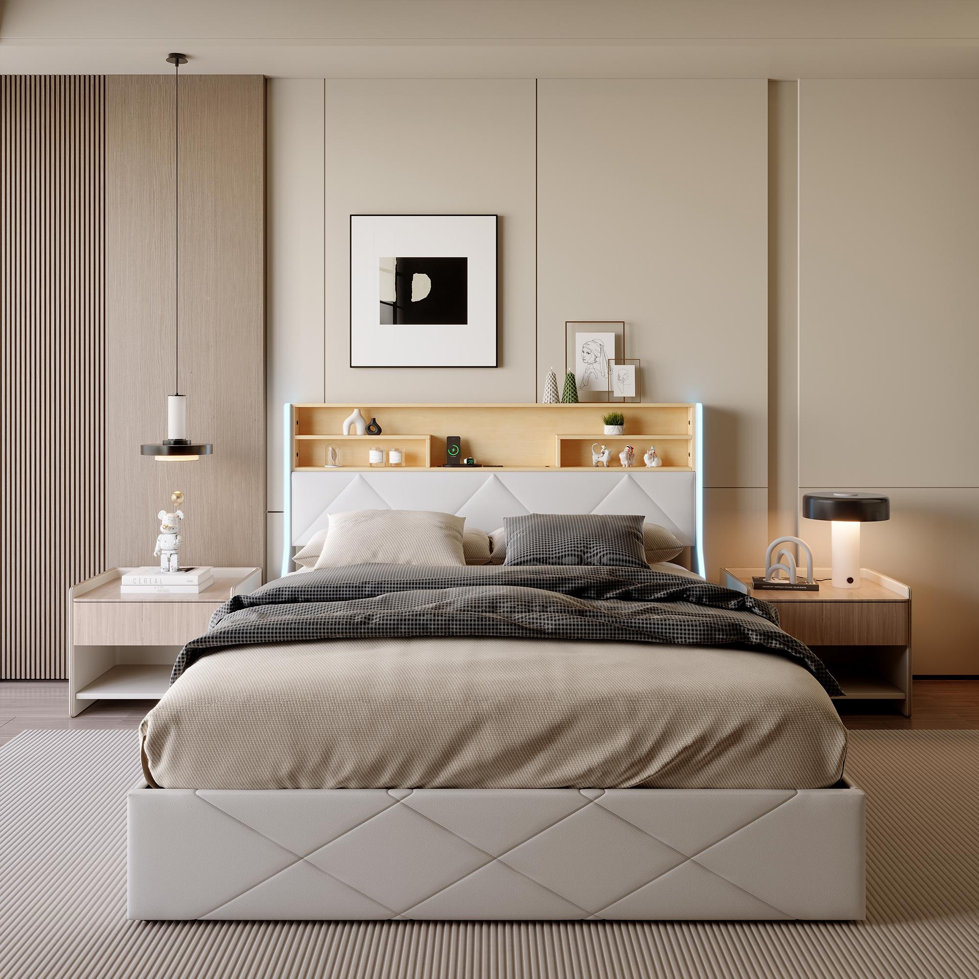 140 x 200 cm Bett mit Stauraum und Kopfteil mit Stauraum, USB-/Typ-C-Anschluss und RGB-LED-Beleuchtung – weißes PU & helle Eiche