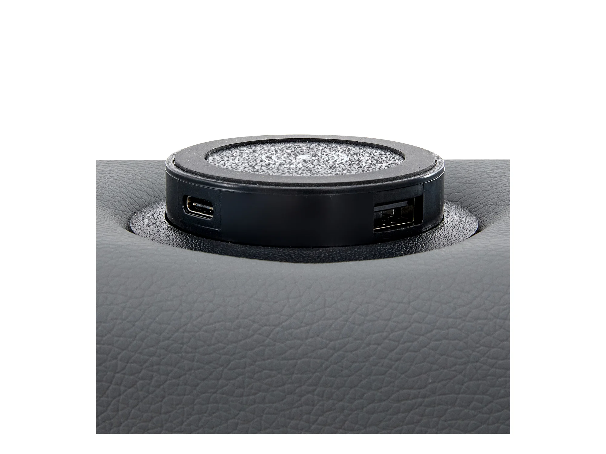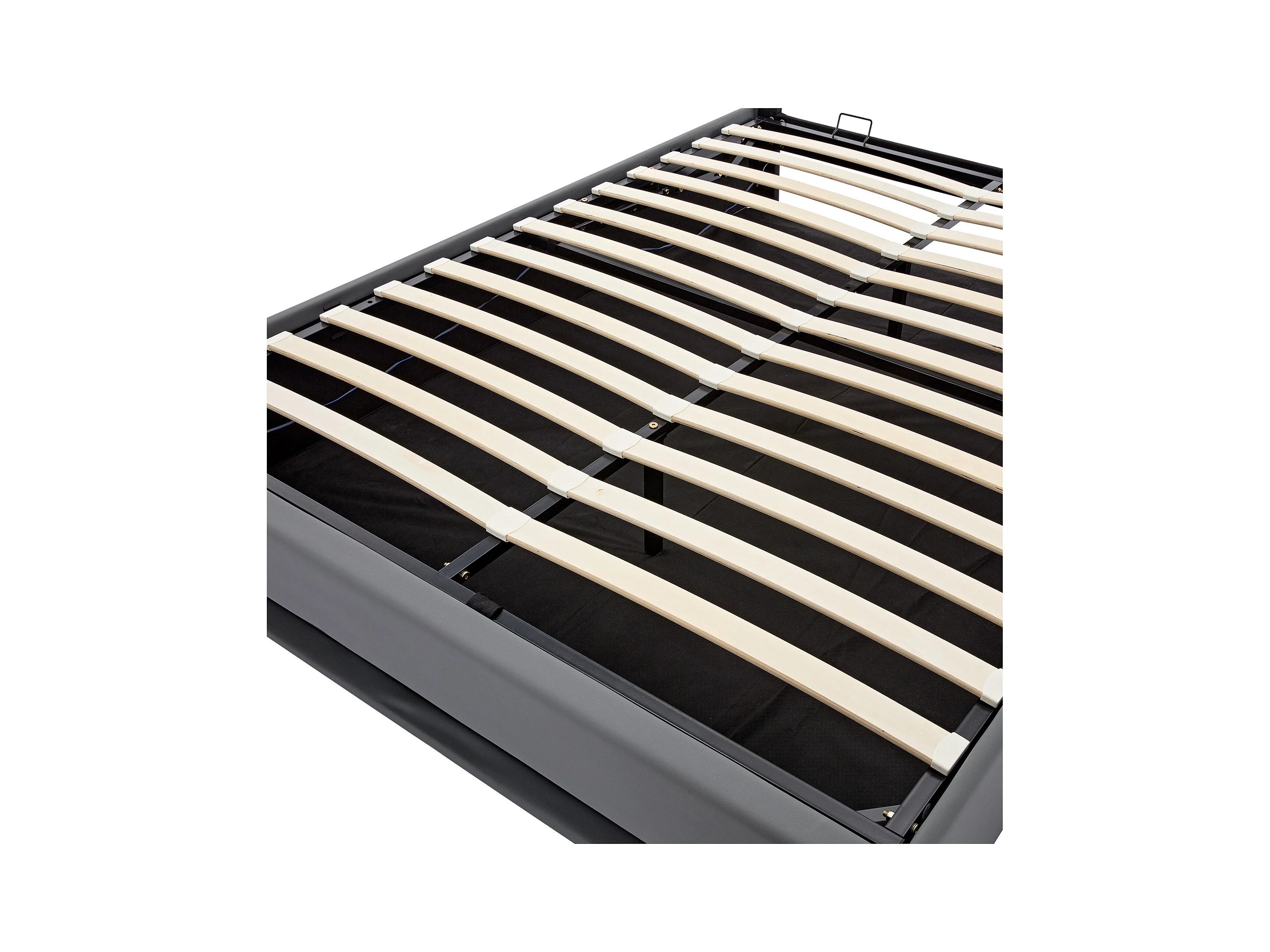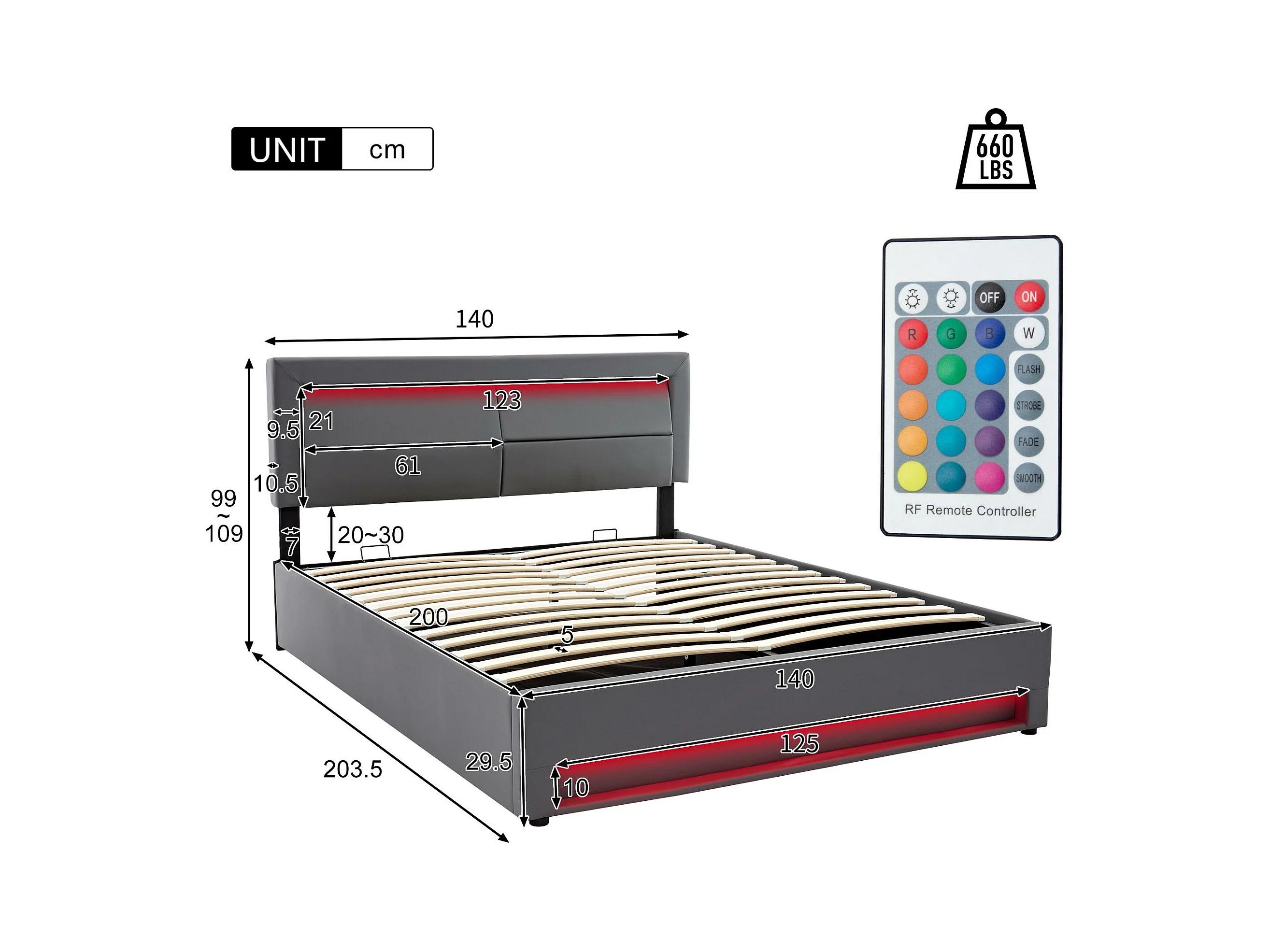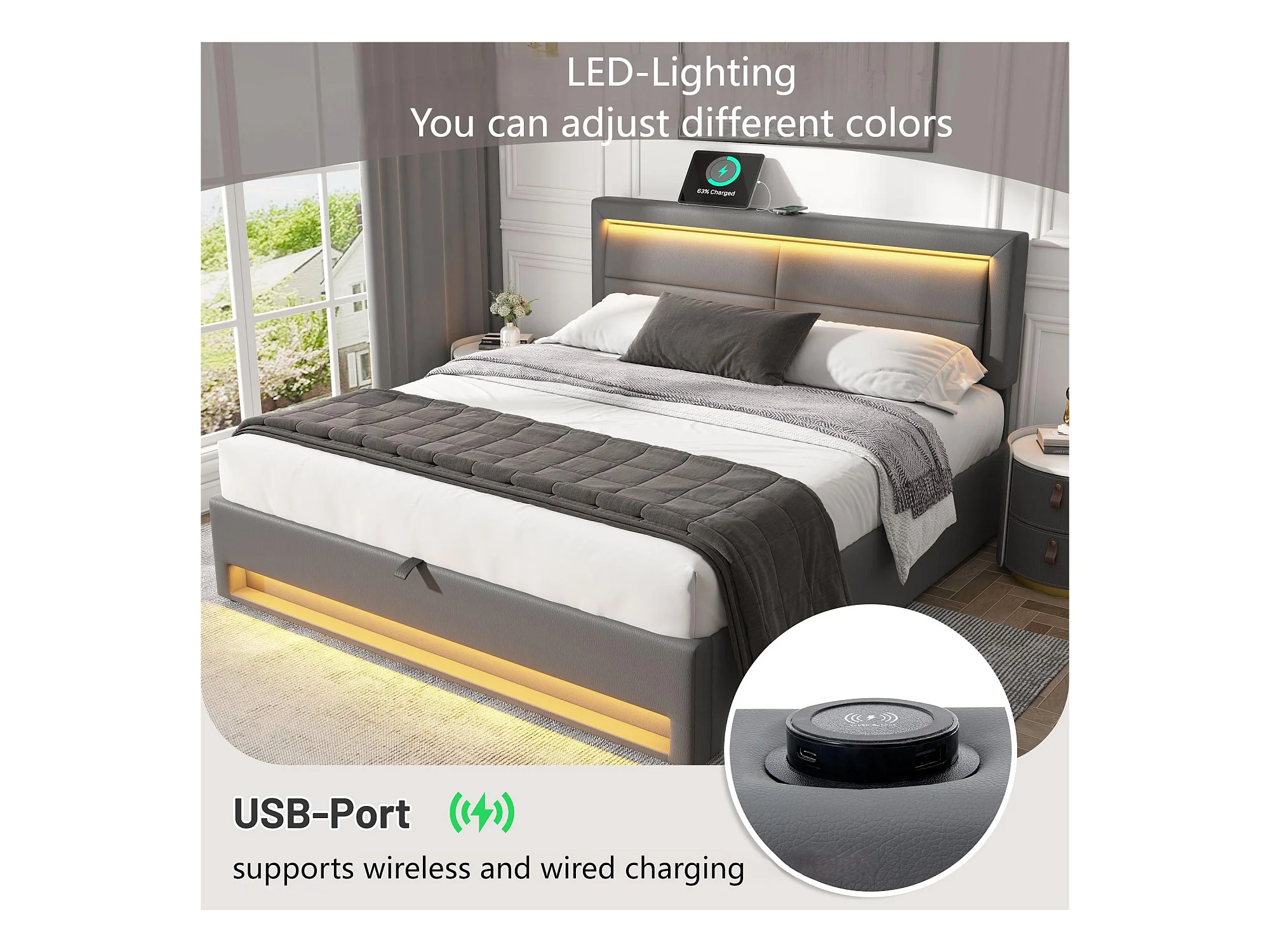140 x 200 cm großes Stauraumbett aus Kunstleder mit LED – mit Ladeanschlüssen (kabelgebunden und kabellos) – Grau