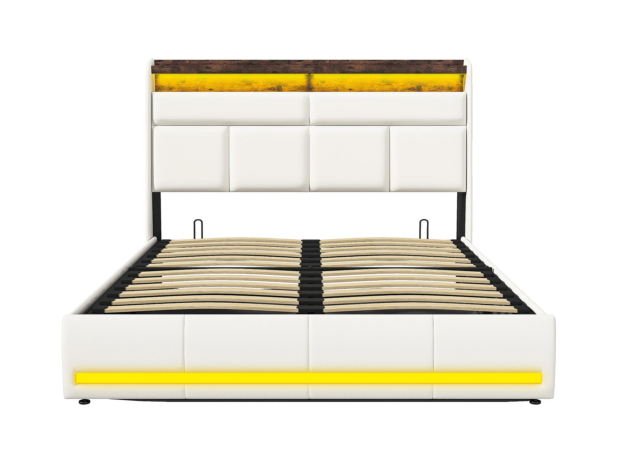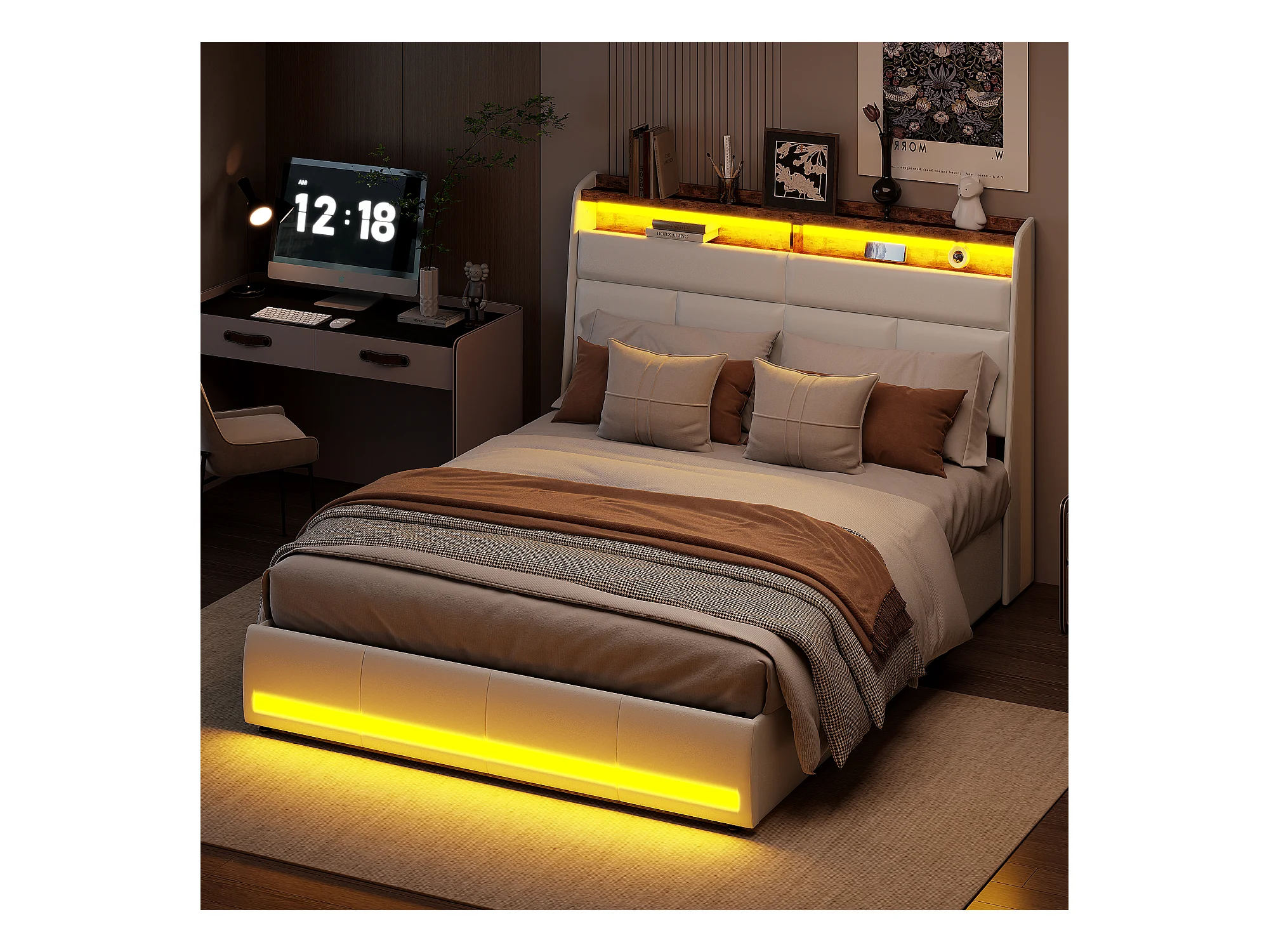 140x200 cm Polsterbett mit LED-Leuchten, gesteppt, Lattenrost, Bettkasten und Hydraulikfunktion, in weißem PU, Zusatzbett für Erwachsene.