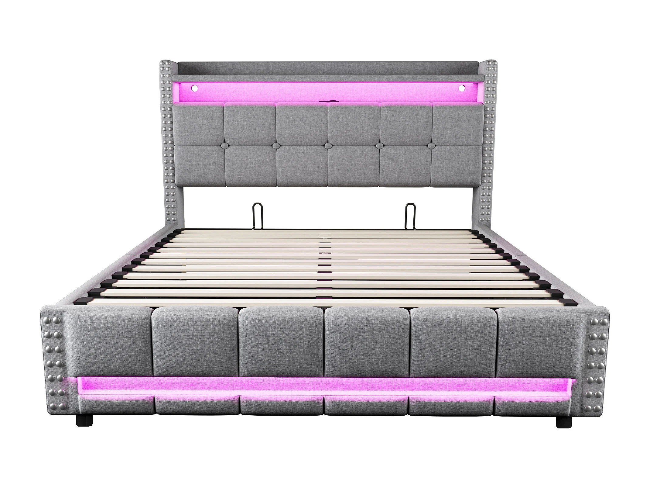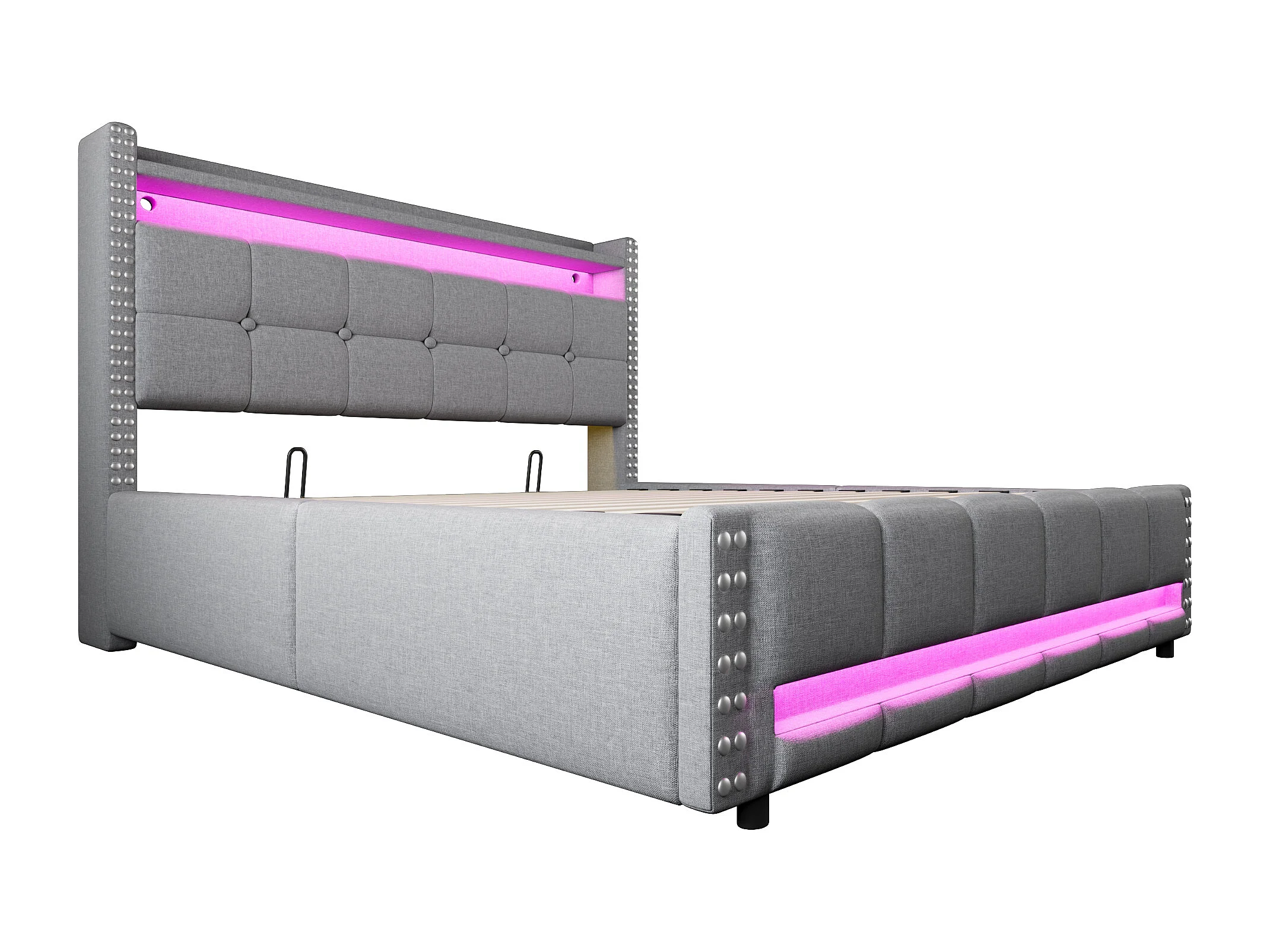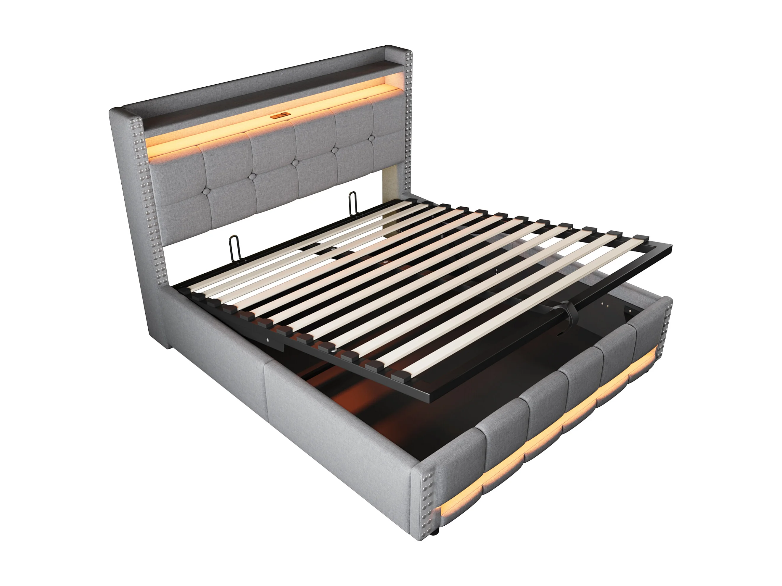 160 x 200 cm Bett mit Stauraum – Erwachsenenbett mit LED-Beleuchtung und USB-Anschluss – kopfteil mit regalen und stauraum – hellgraues leinen