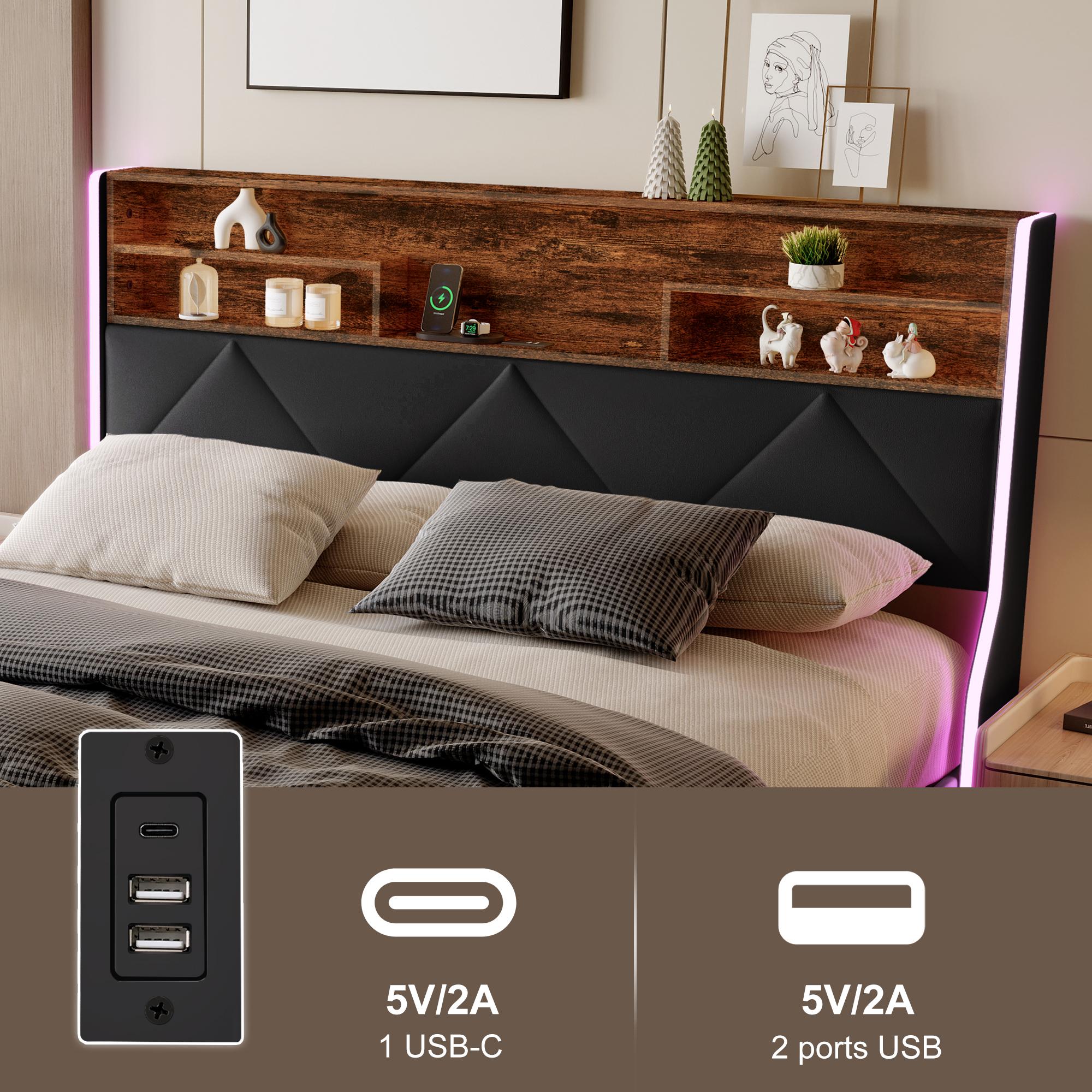 160 x 200 cm Bett mit Stauraum und Kopfteil mit Stauraum, USB-/Typ-C-Anschluss und RGB-LED-Beleuchtung – Schwarzes PU & helle Eiche