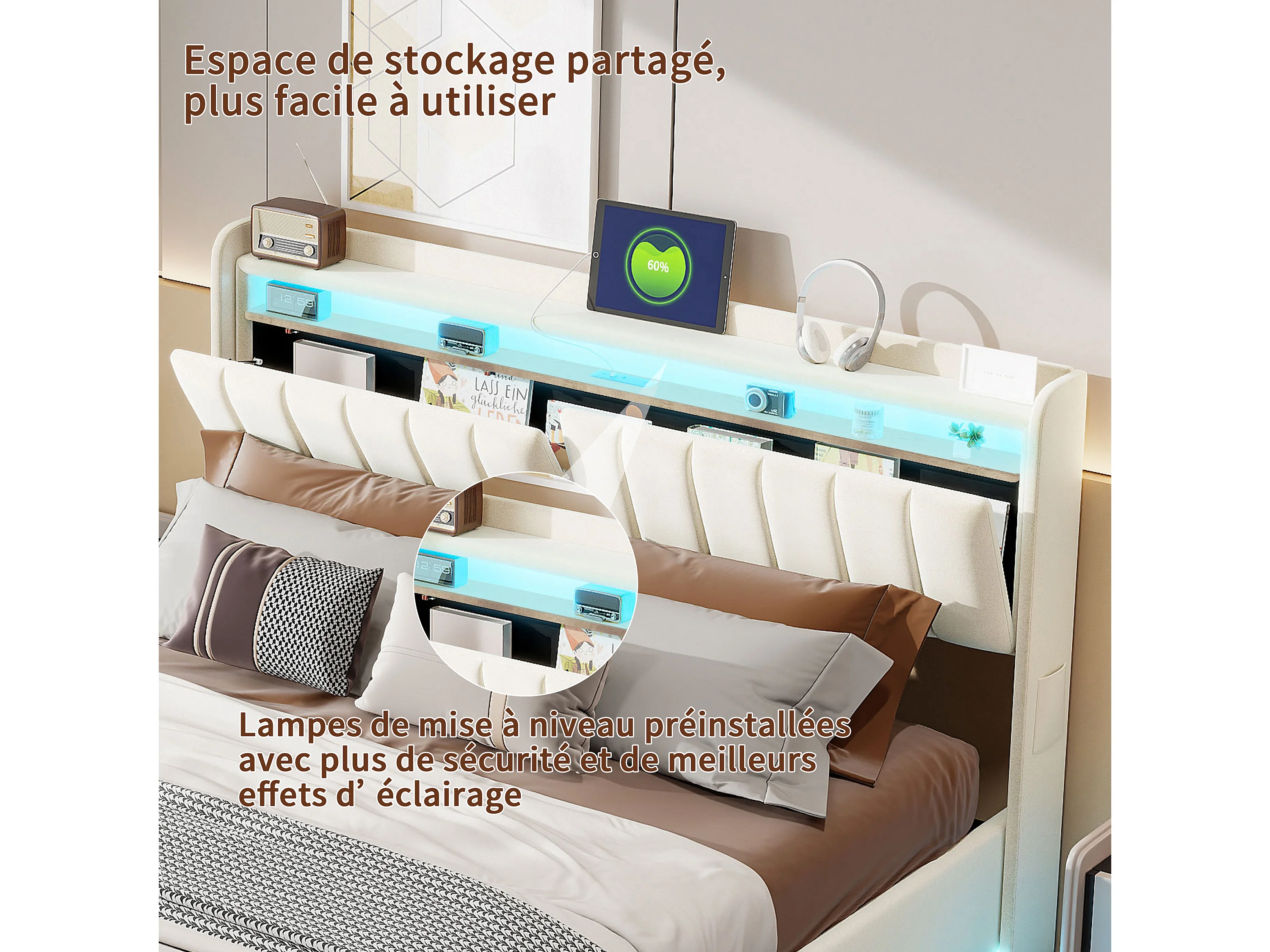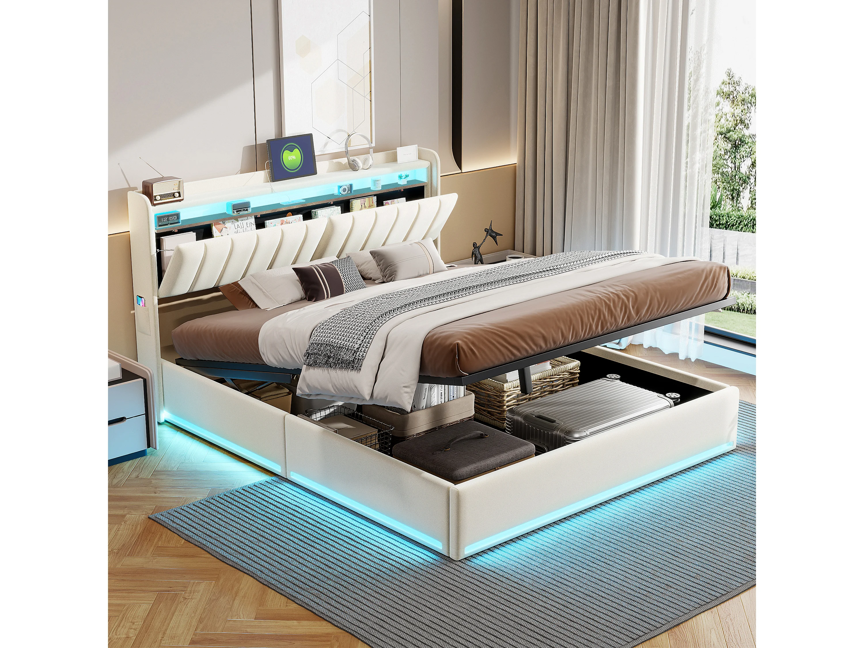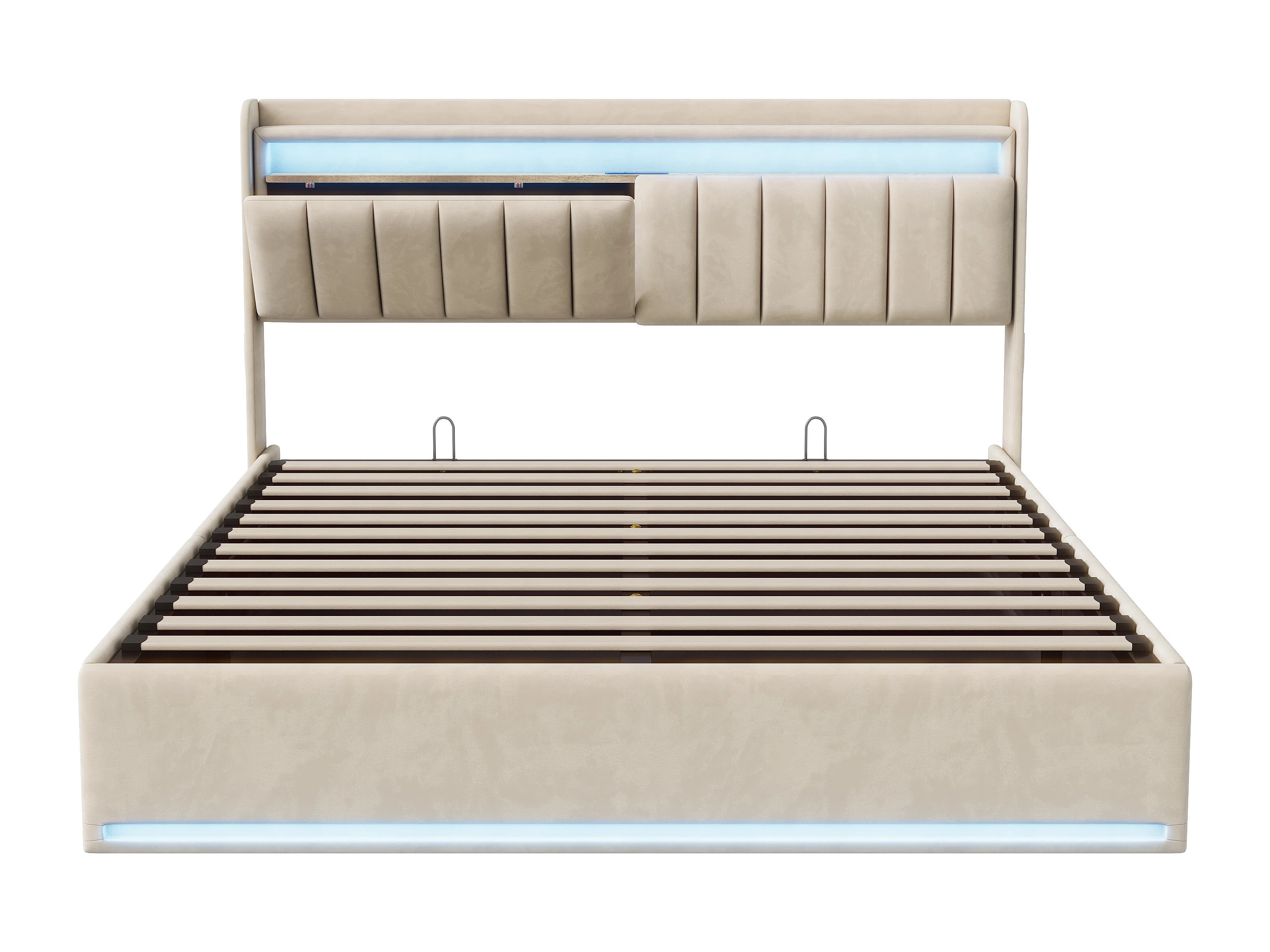 160x200 cm beigefarbenes Samtbett mit Stauraum, RGB-LEDs, Kopfteil mit Stauraum und USB- & USB-C-Anschlüssen