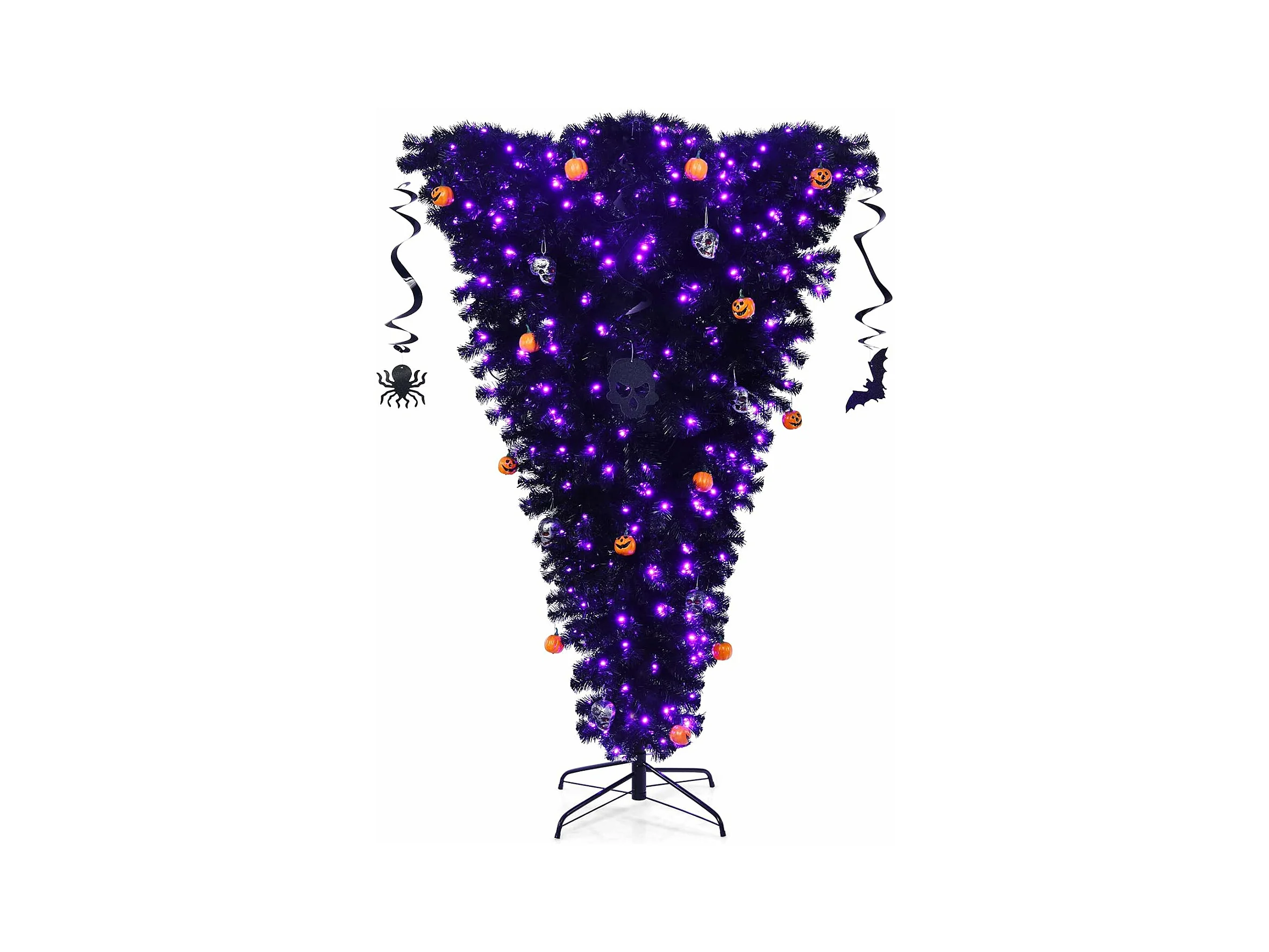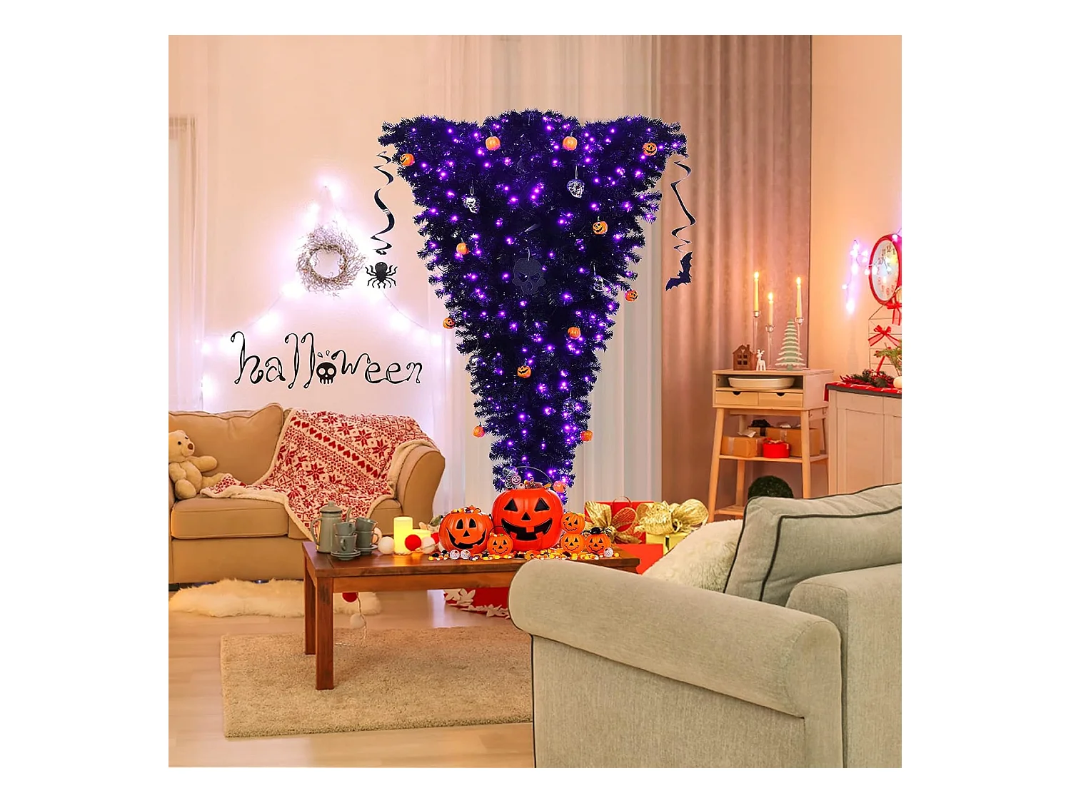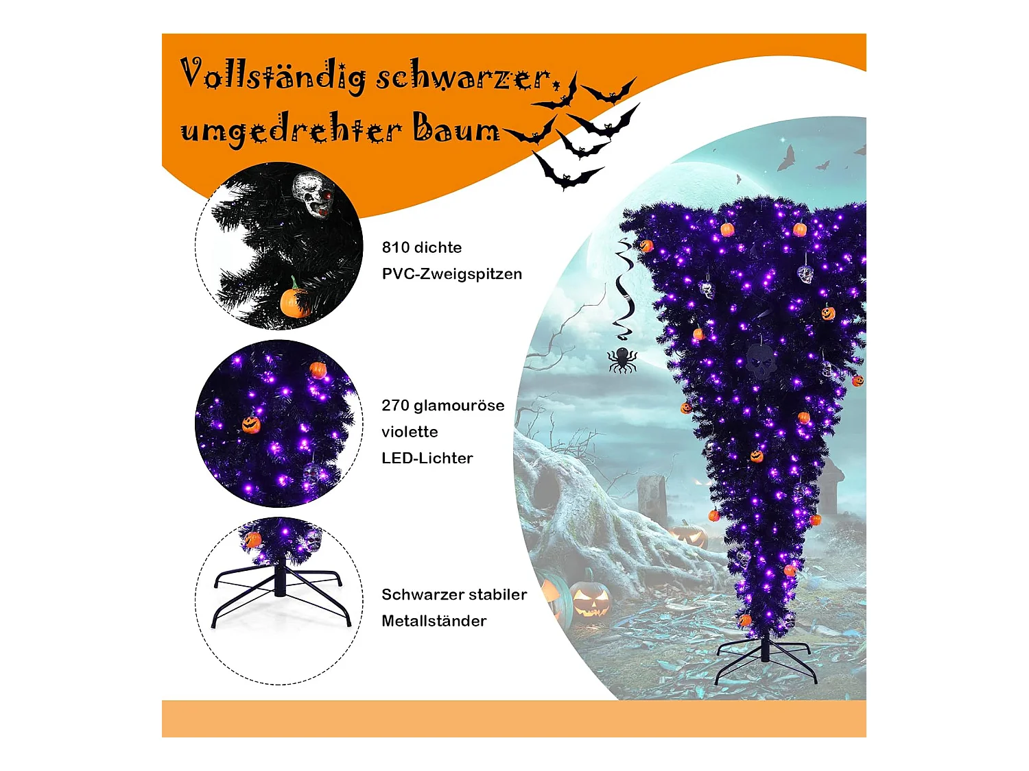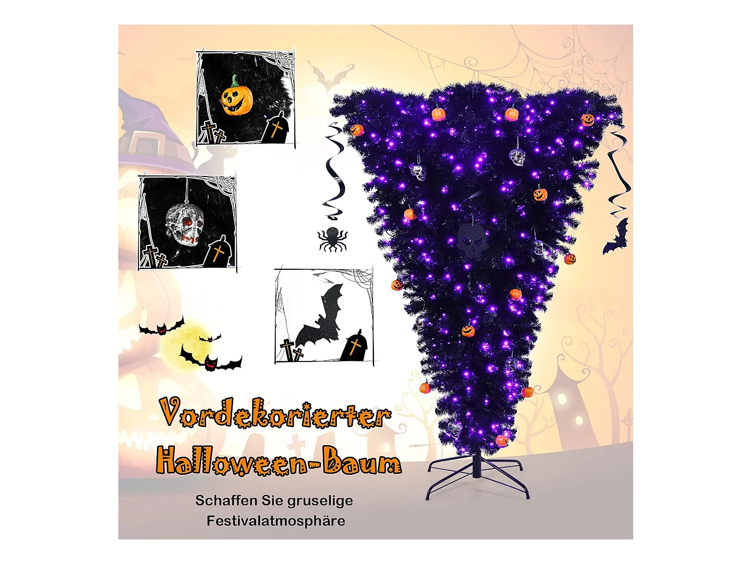 180cm Weihnachtsbaum mit 270 lila Leuchten und Dekorationen, Tannenbaum Kopfüber für Halloween schwarz