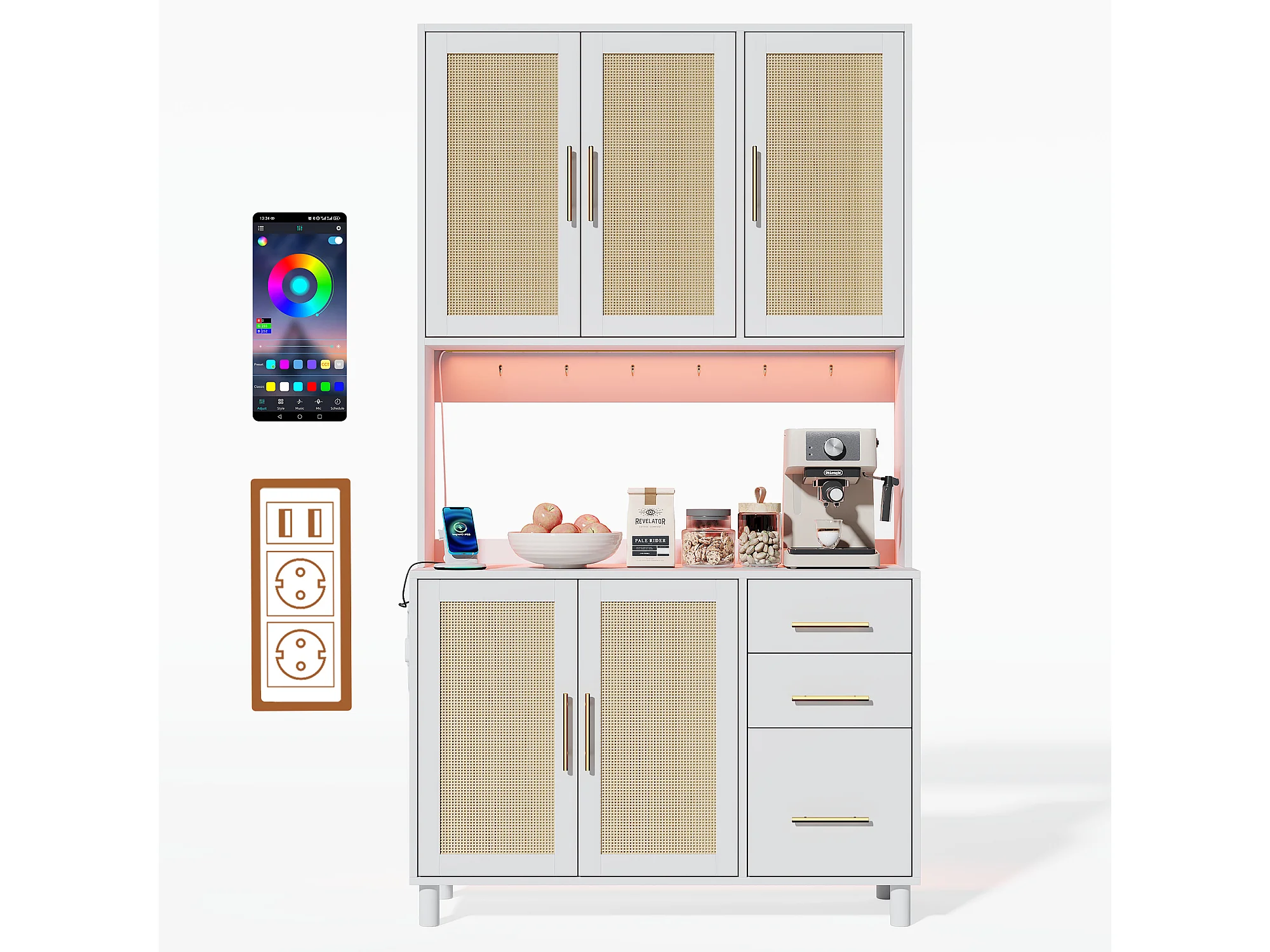 183 cm Küchen-Sideboard mit LED-Beleuchtung, USB-Anschlüssen, verstellbaren Einlegeböden und 3 Schubladen – Weiß