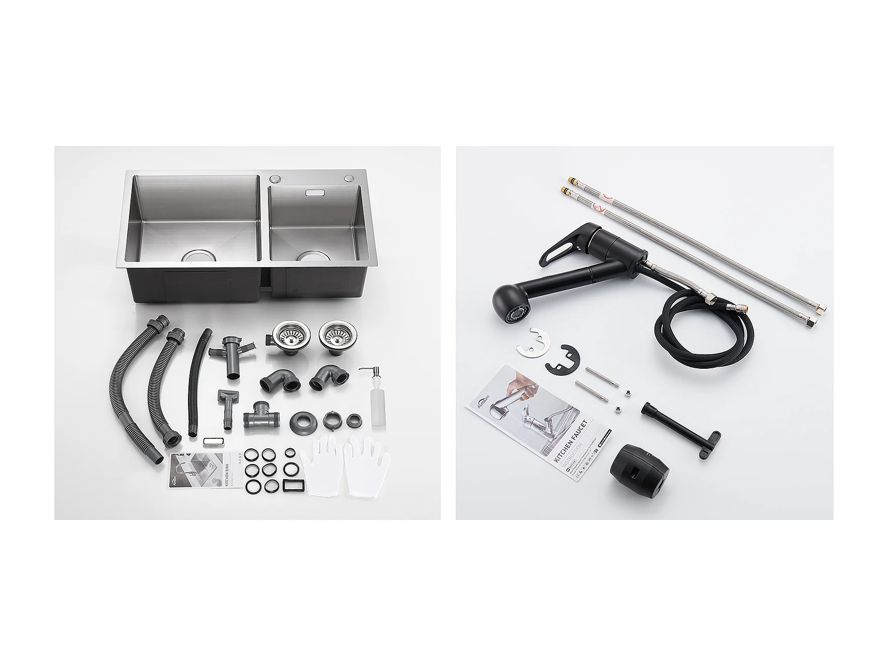 2-Becken-Küchenspüle 75x45x19cm, Einbau-/Aufsatzspüle mit Seifenspender + schwarzer Küchenarmatur mit ausziehbarer Brause, 2 360°-Düsen