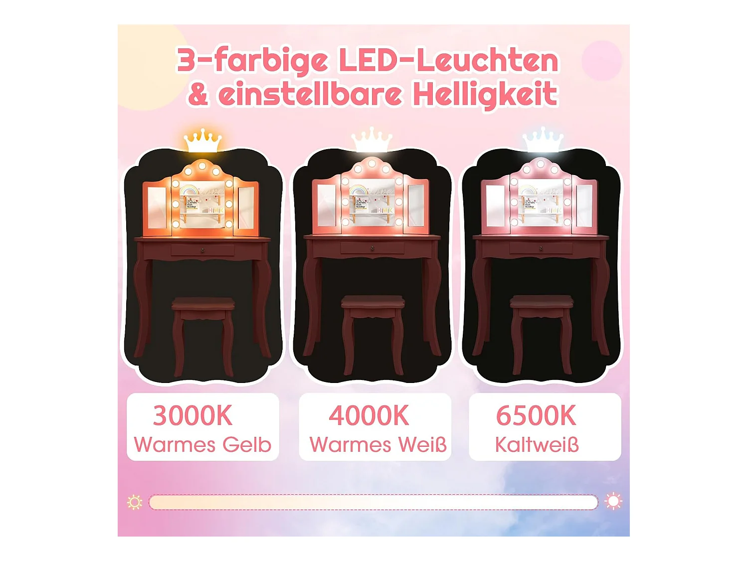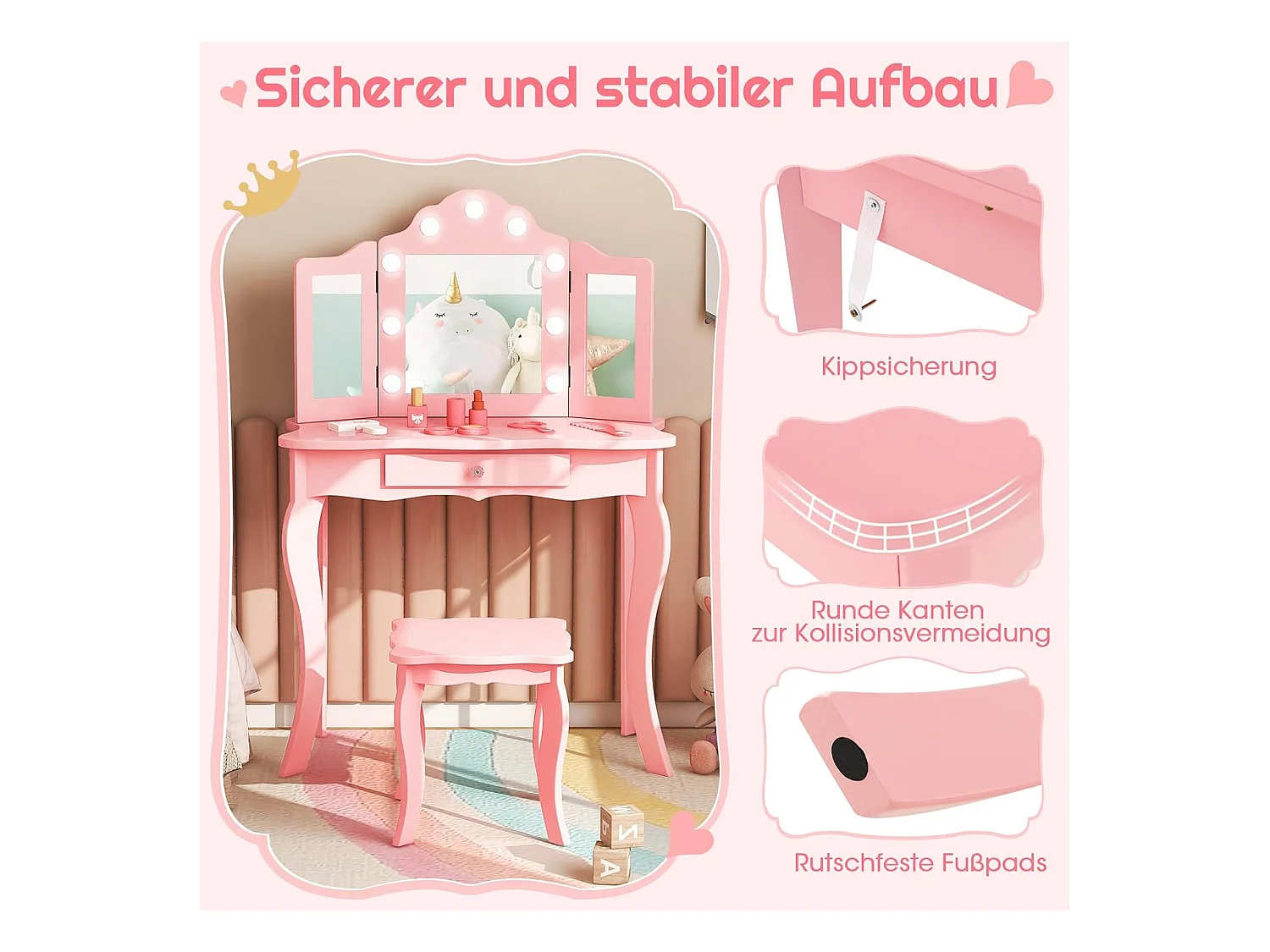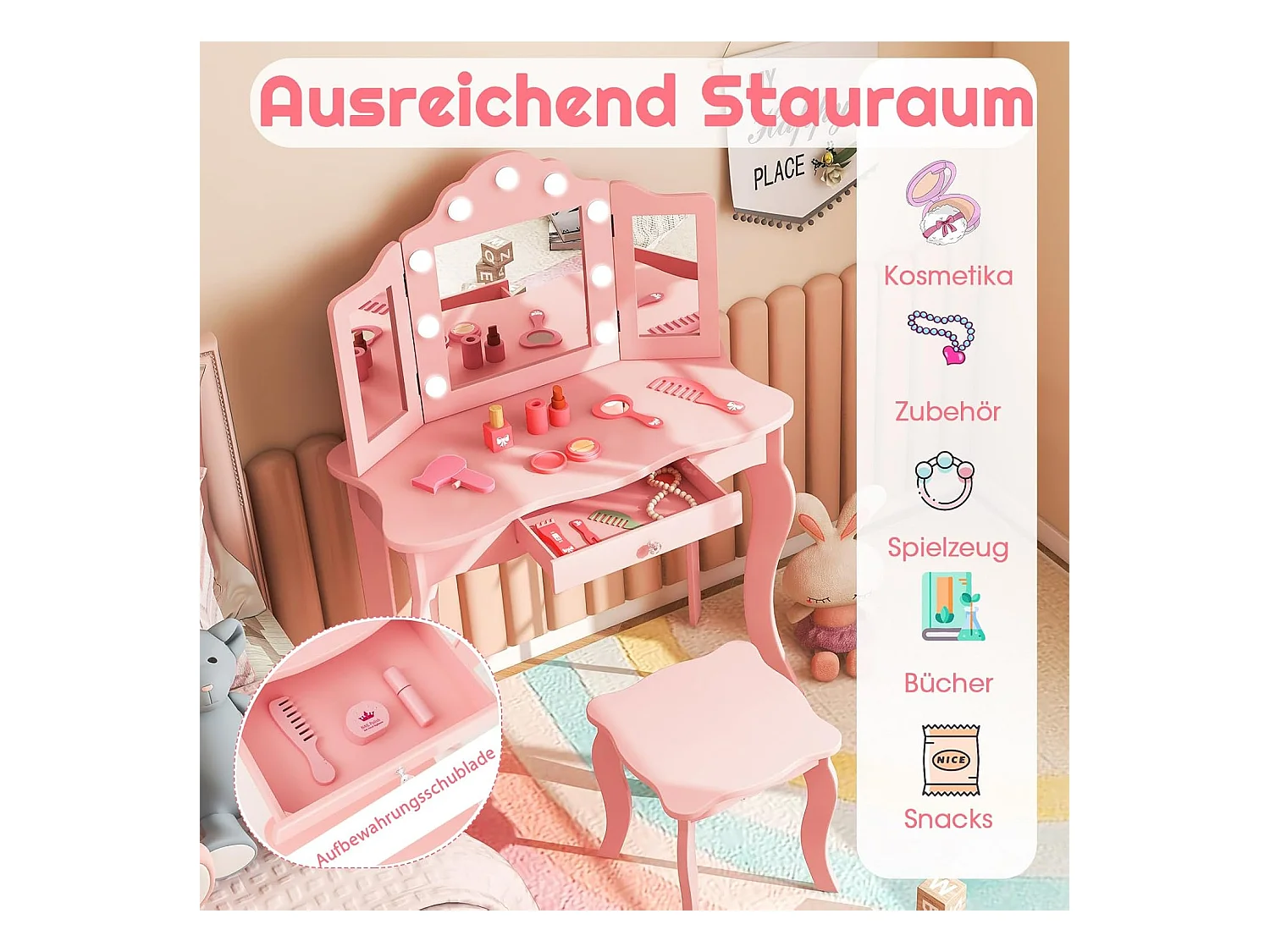 2 in 1 Kinder Schminktisch, Frisiertisch mit LED-Leuchten, klappbarem Spiegel & Schubladen, Kosmetiktisch Prinzessin für Kinder Mädchen(Rosa) TK32457