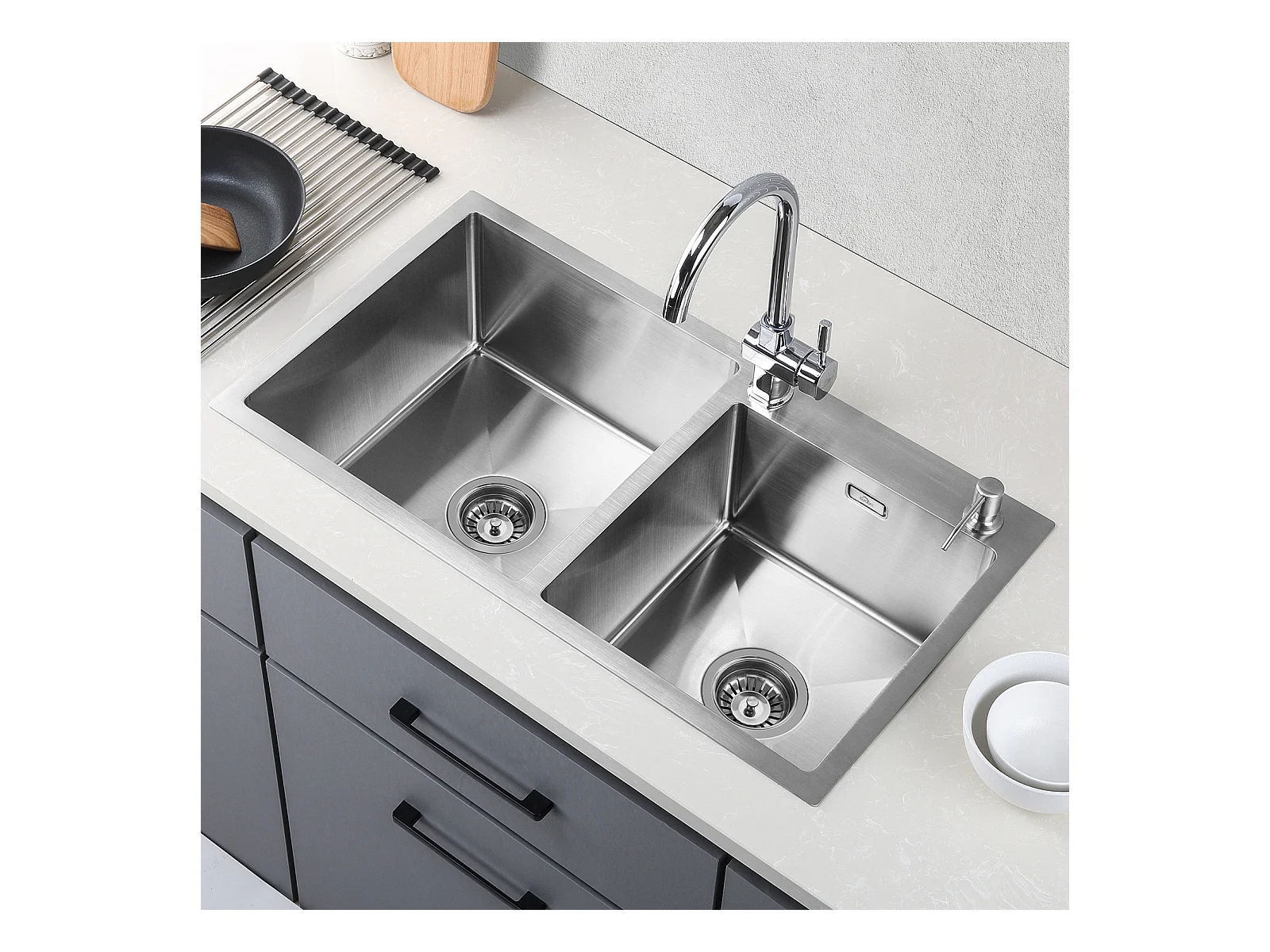 2-in-1-Küchenspüle, 2 Becken, 75 x 45 x 19 cm, Einbauspüle/Aufsatzspüle mit Seifenspender + flexiblem Küchenhahn, hoher schwenkbarer Auslauf