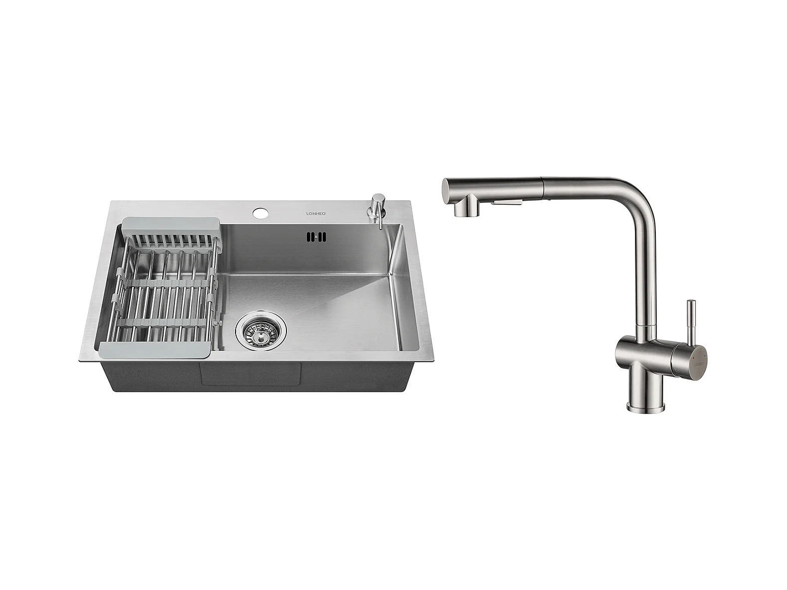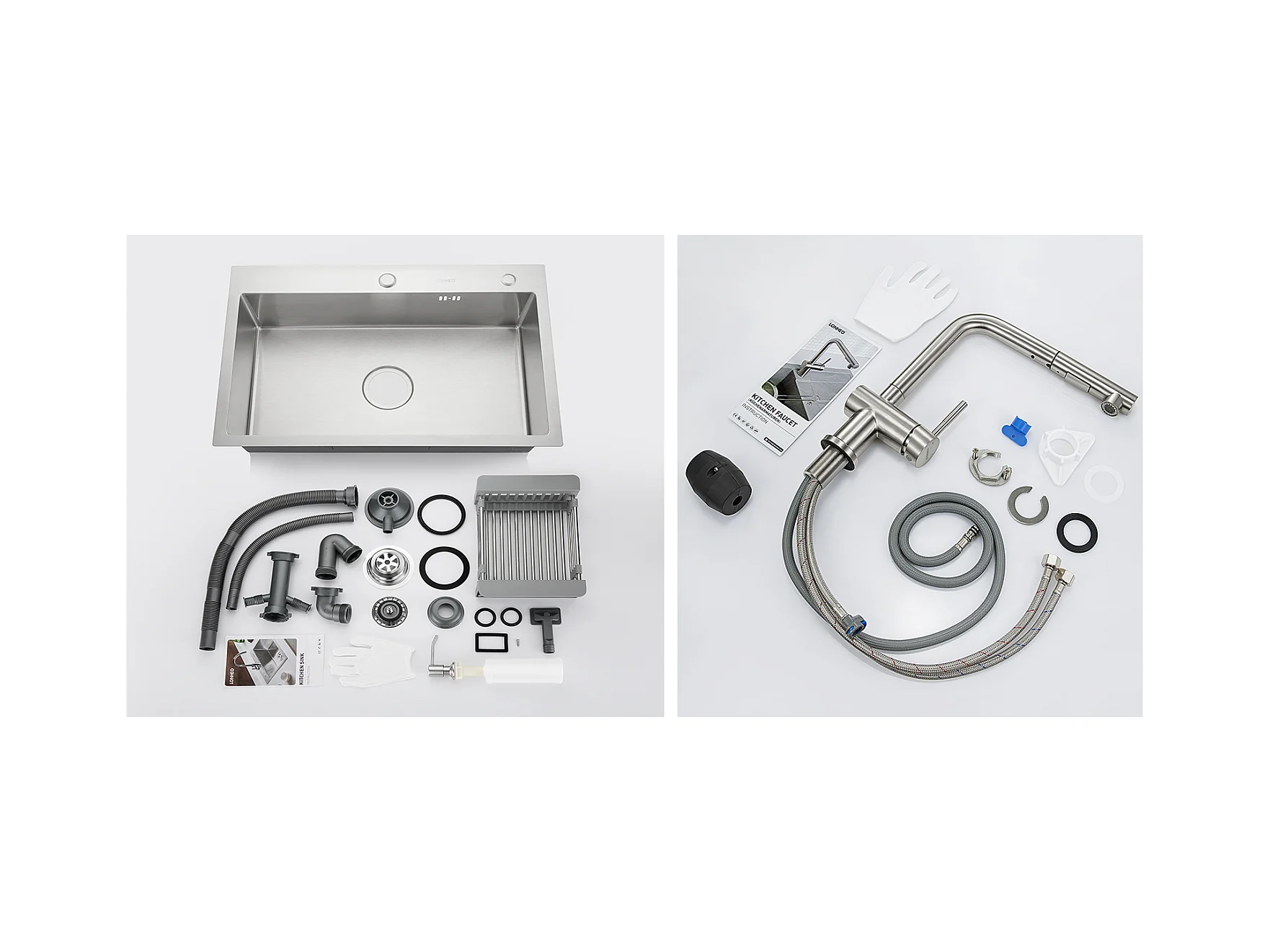 2-in-1-Küchenspüle, gebürstet, 68 x 45 x 19 cm, mit Seifenspender, Abtropfkorb + Küchenarmatur, ausziehbarer Brause, zwei Düsen, 360° schwenkbar