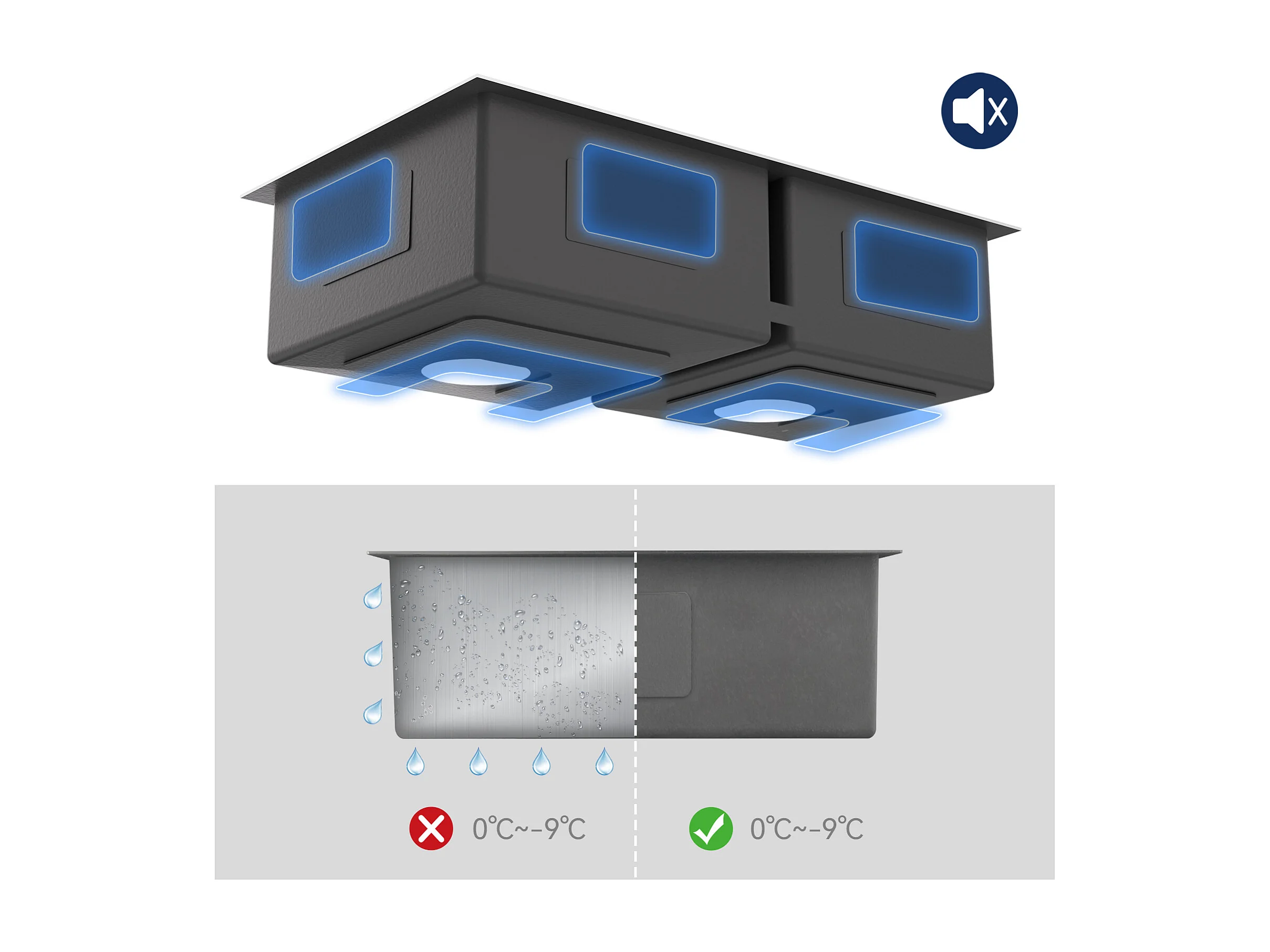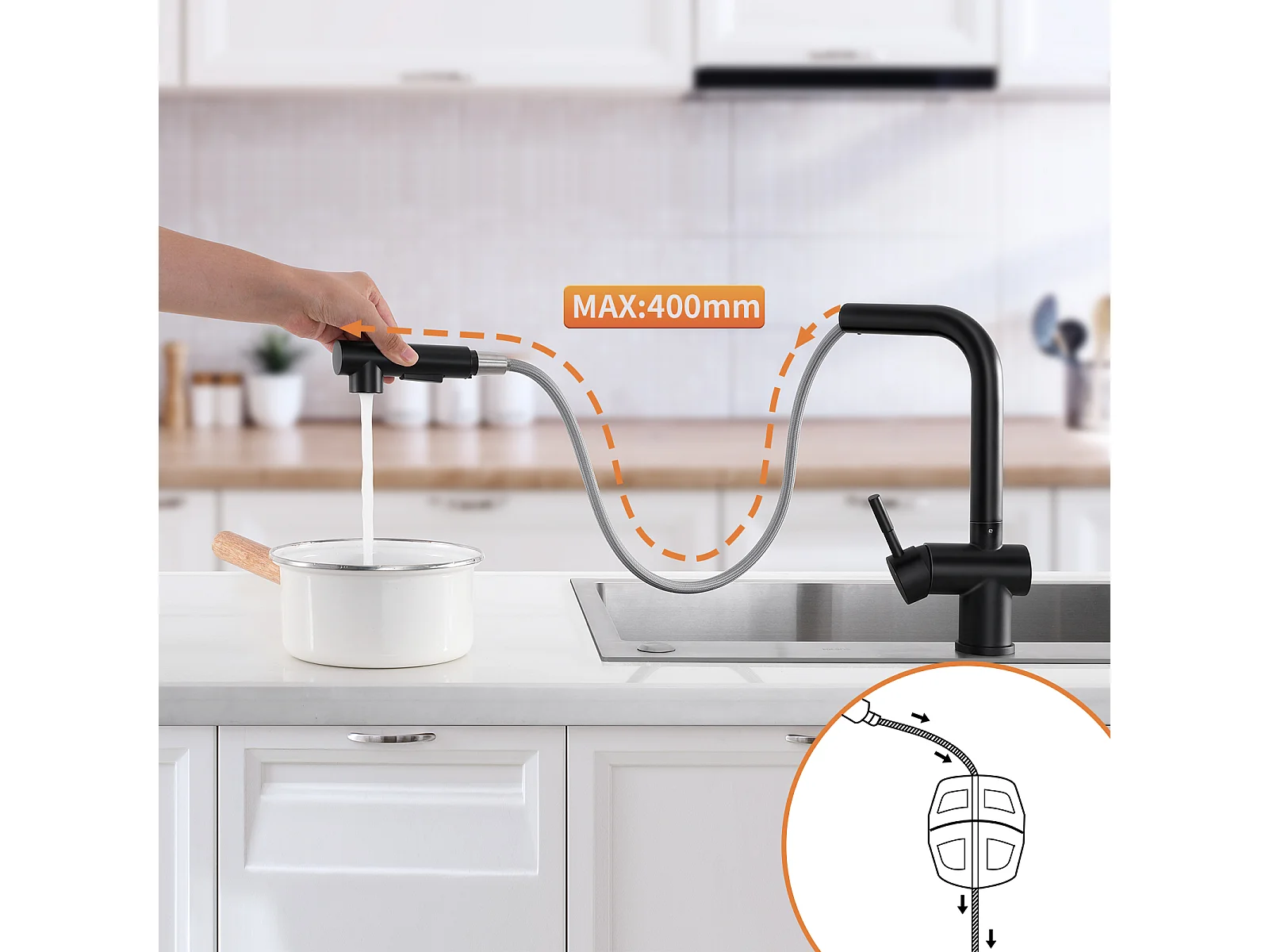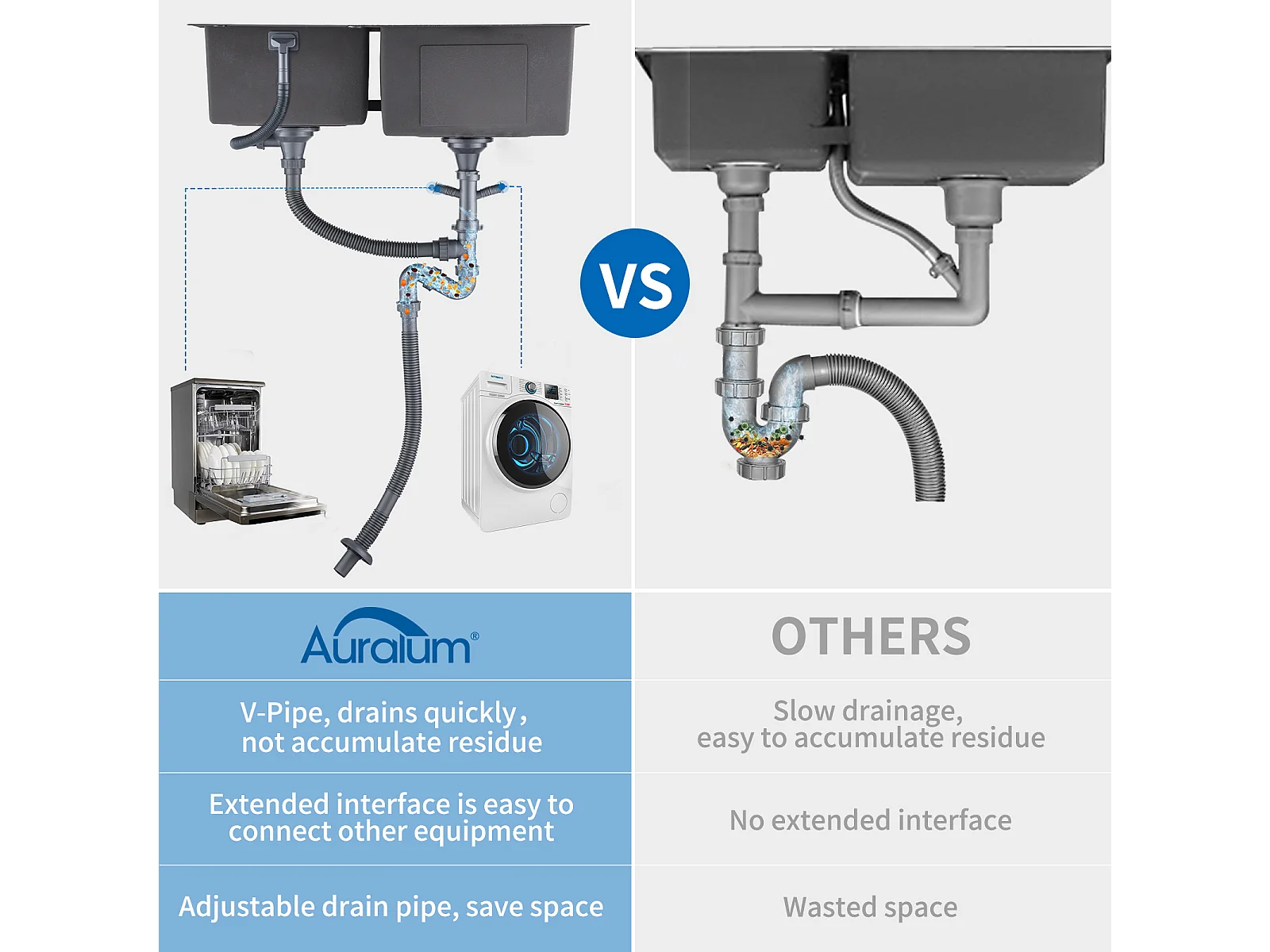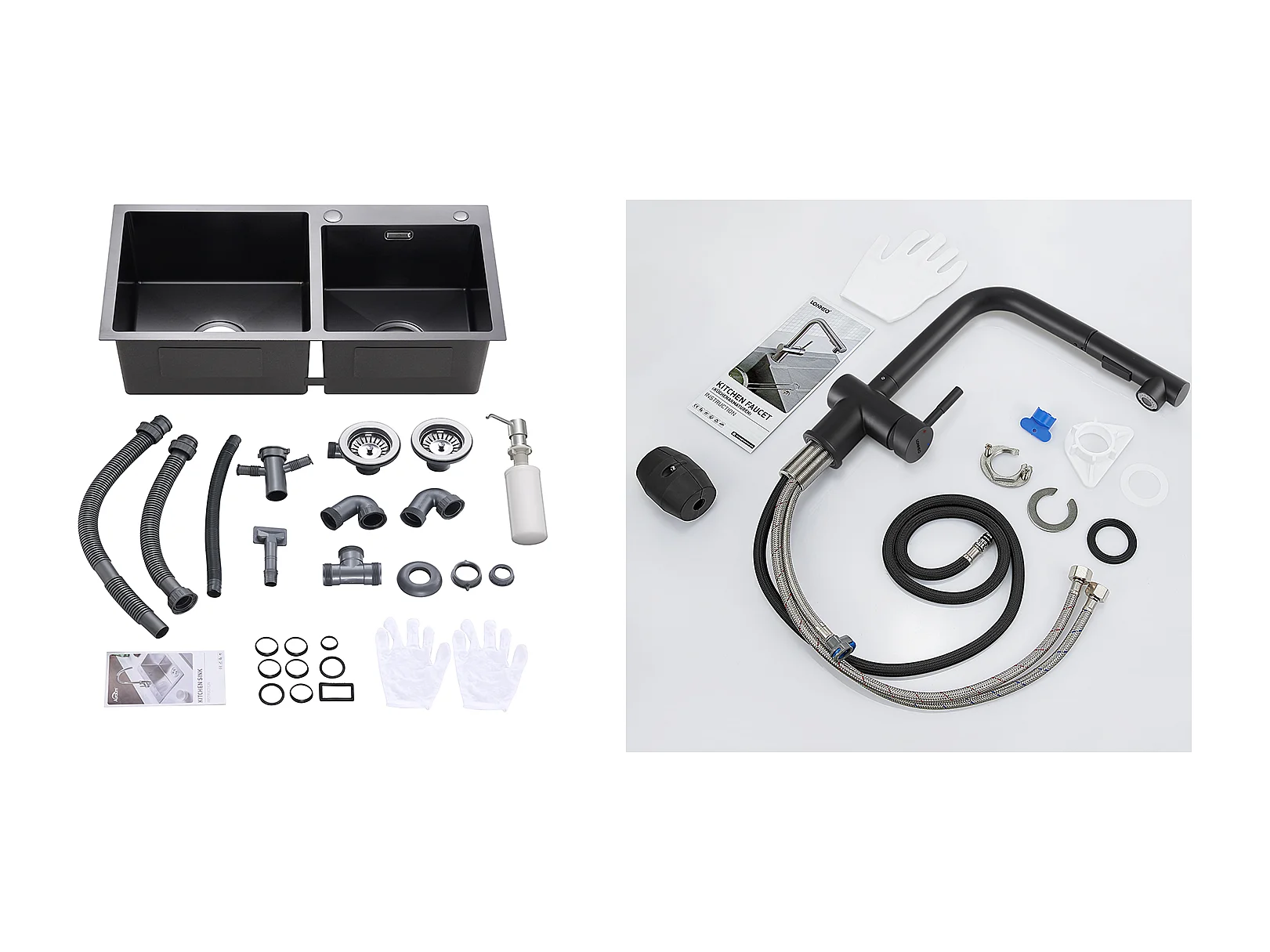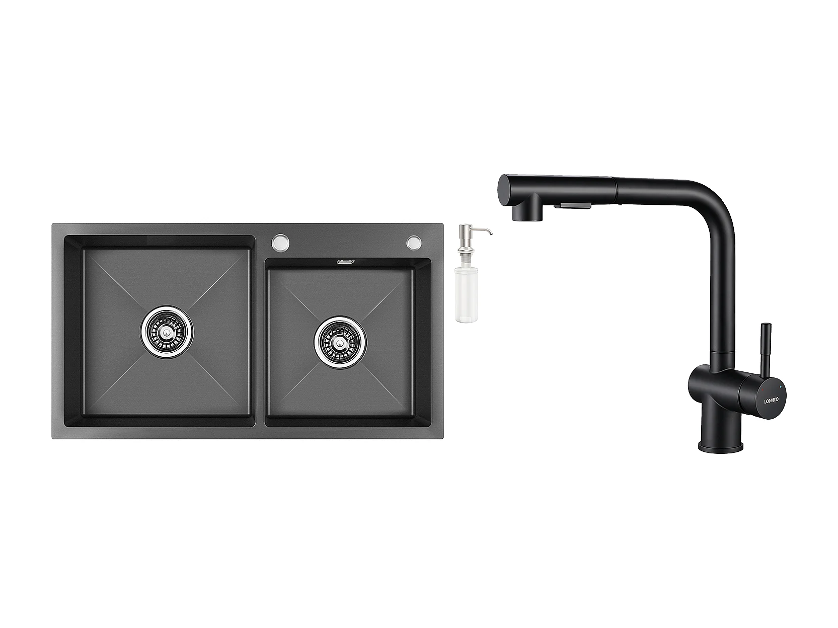 2-in-1-Küchenspüle mit 2 Becken, 75 x 45 x 19 cm, Einbauspüle/Aufsatzspüle mit Seifenspender + Küchenarmatur mit ausziehbarer Brause, zwei Düsen, schwarz