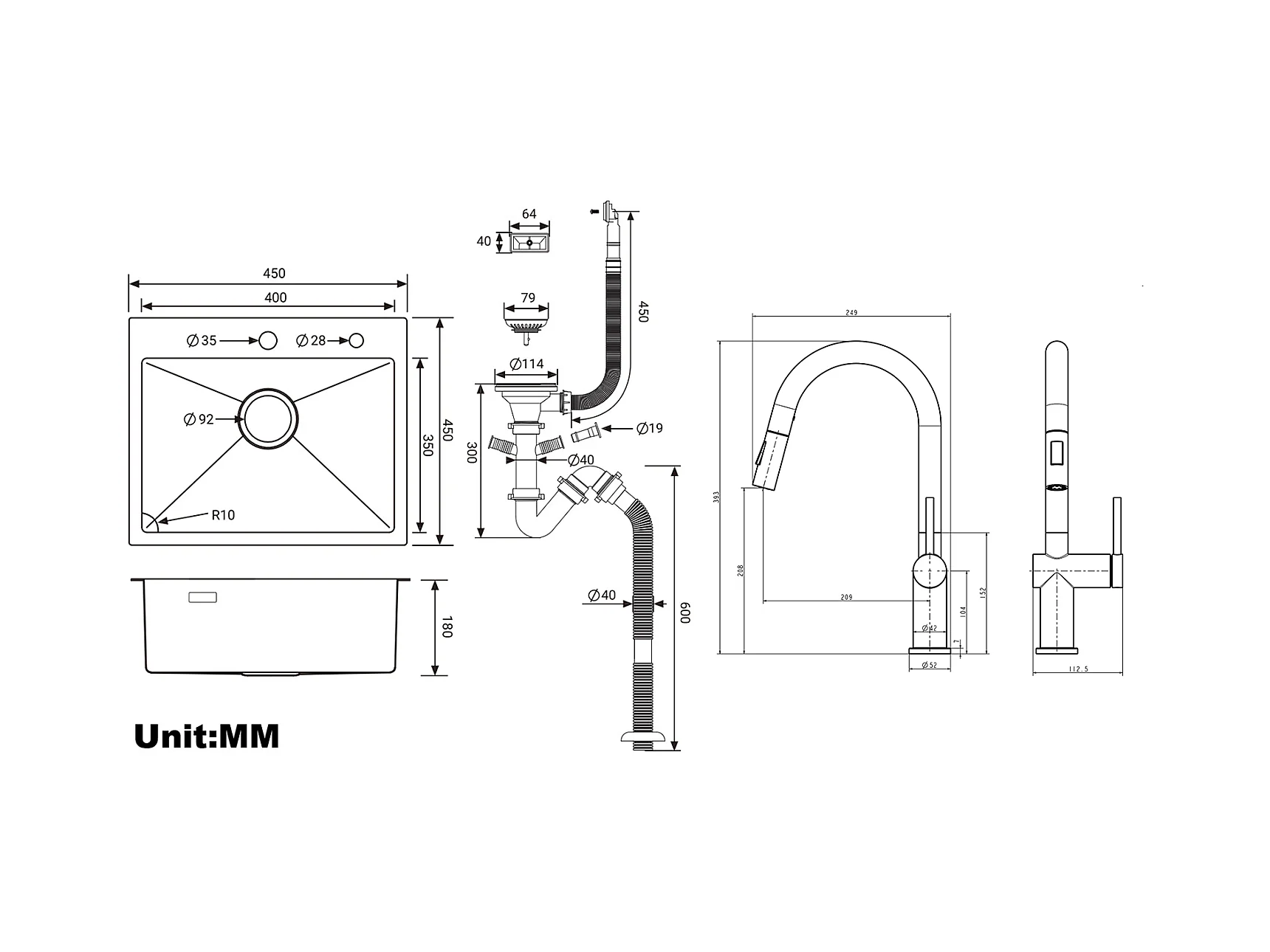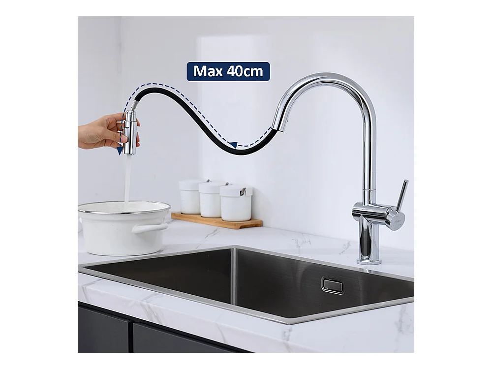 2-in-1-Küchenspüle mit Einzelbecken, 55 x 44 x 19 cm, Einbau-/Blumen-/Unterbauspüle, gebürstet + ausziehbarer Küchenhahn mit zwei Funktionen, Chrom