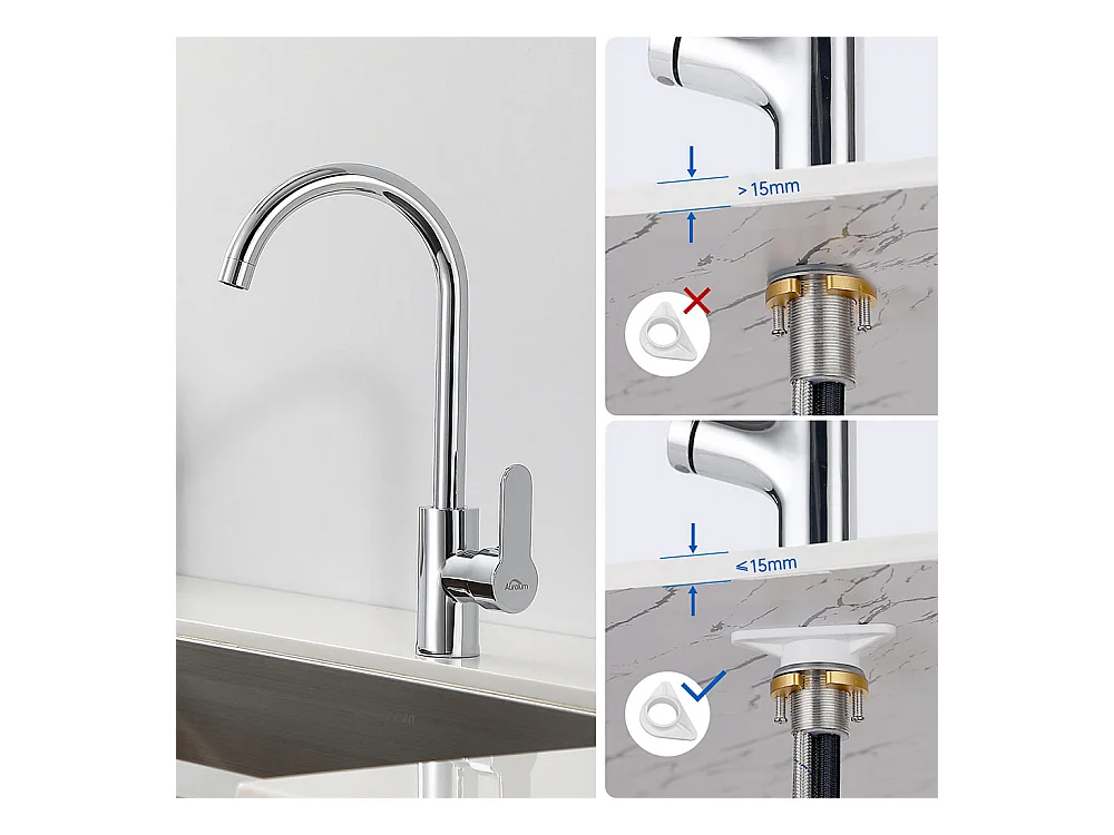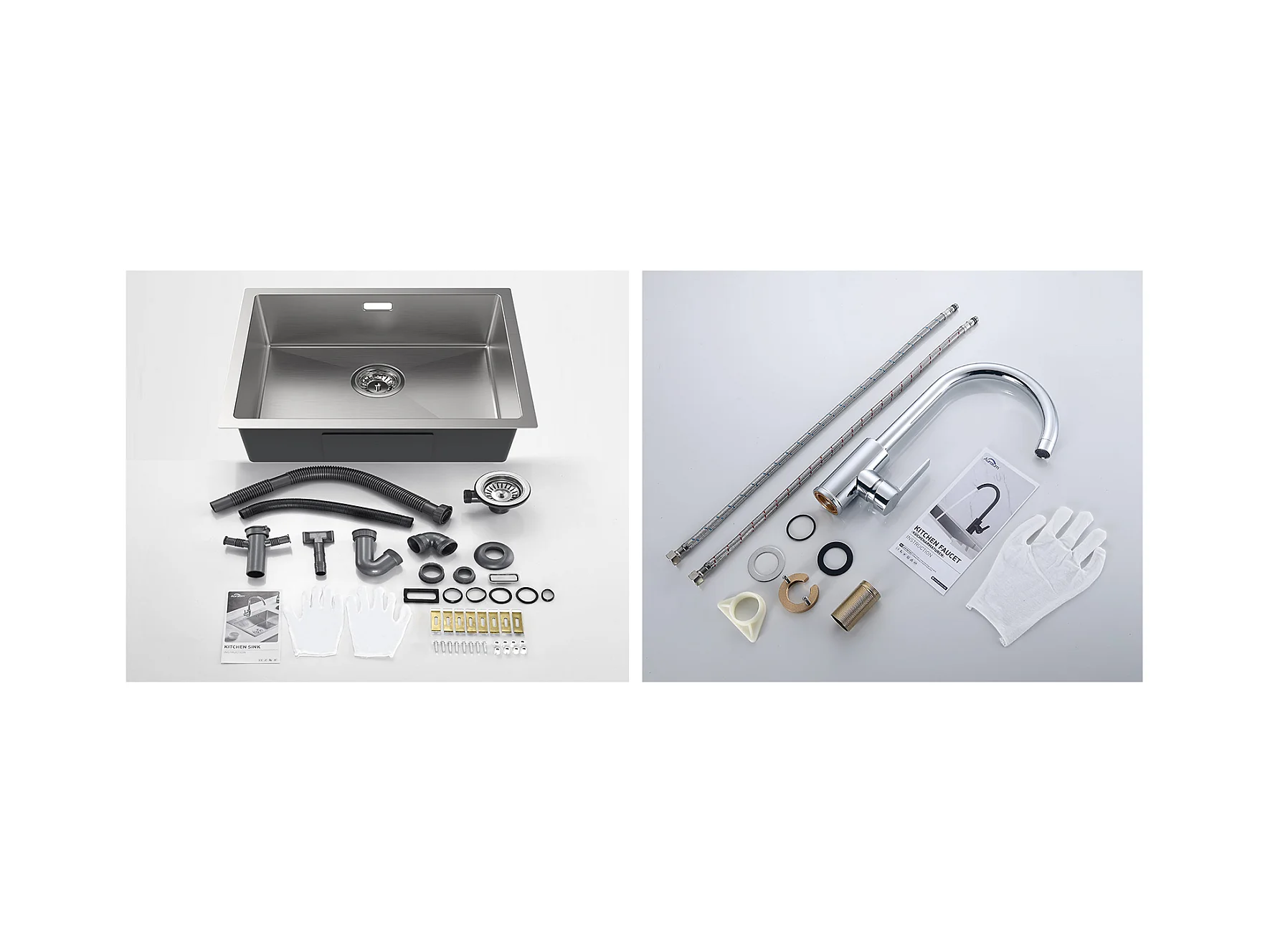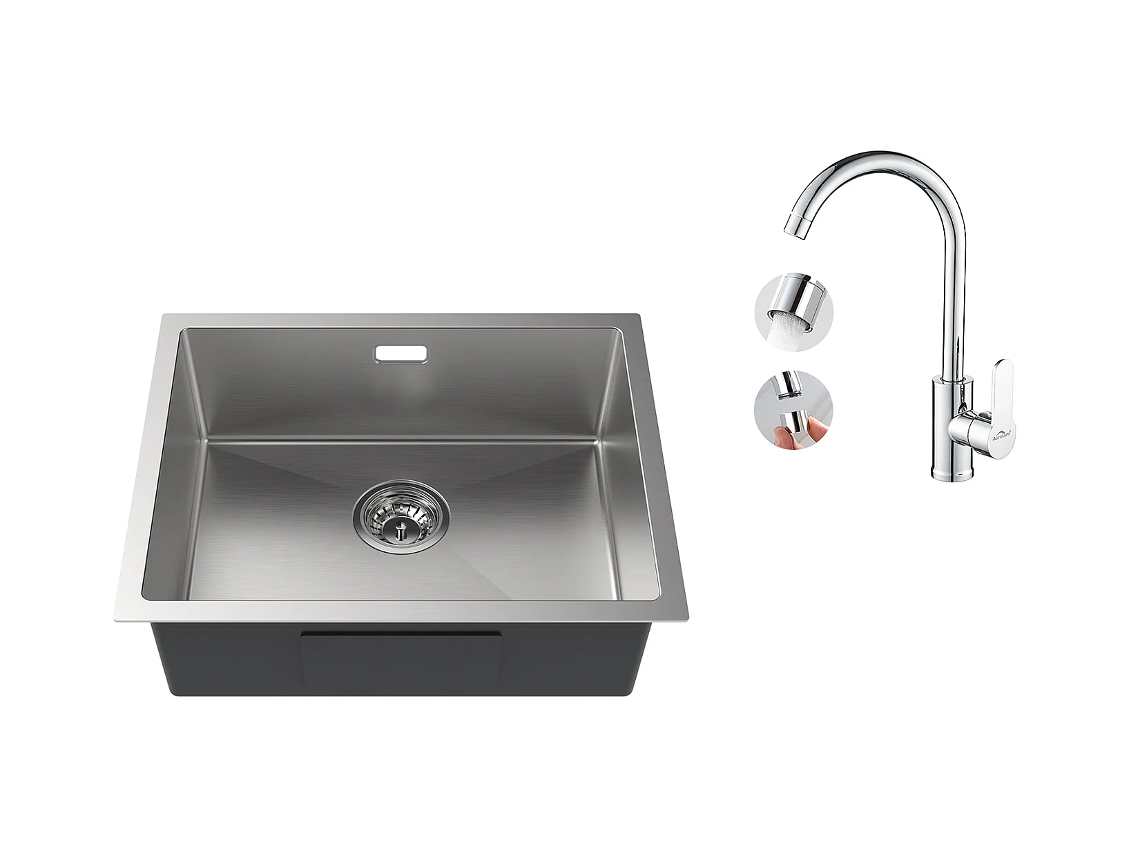 2-in-1-Küchenspüle mit Einzelbecken, 55 x 44 x 19 cm, Unterbau/flächenbündig/Unterbau, gebürstet + 360° schwenkbarer Küchenhahn mit Warm-/Kaltwasser, Chrom