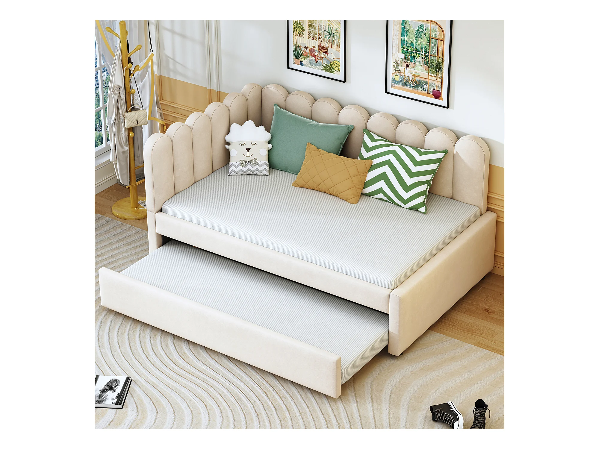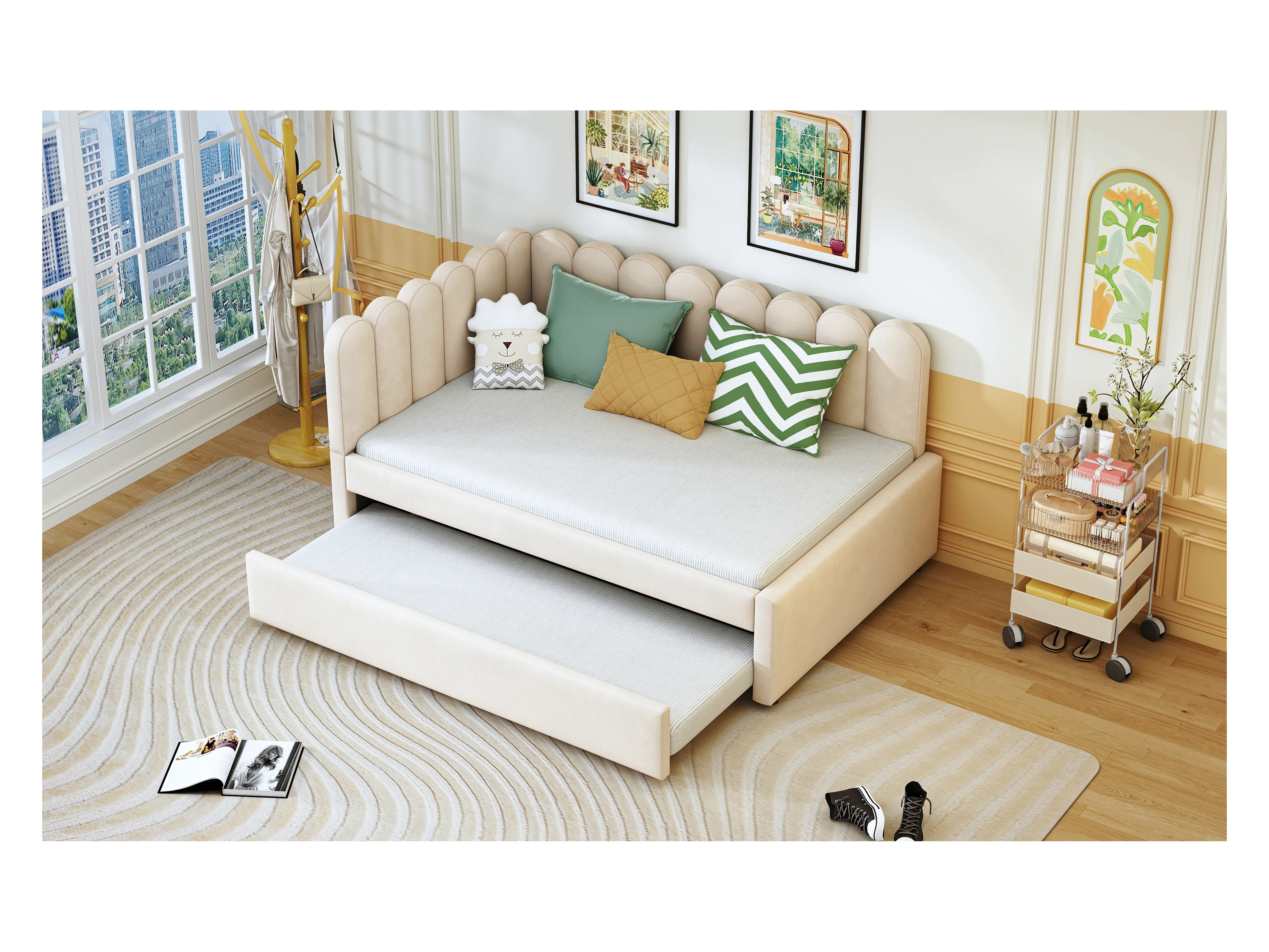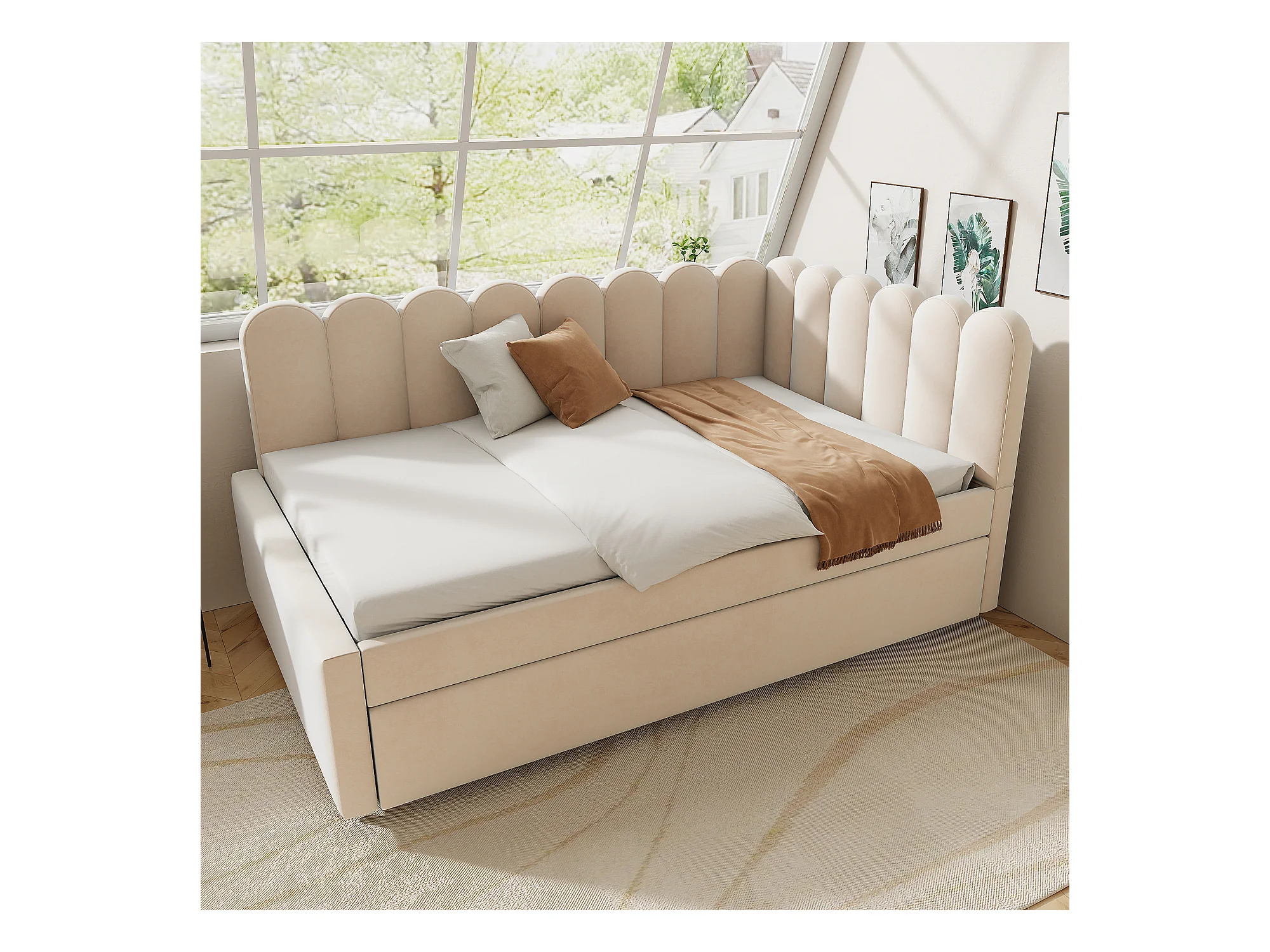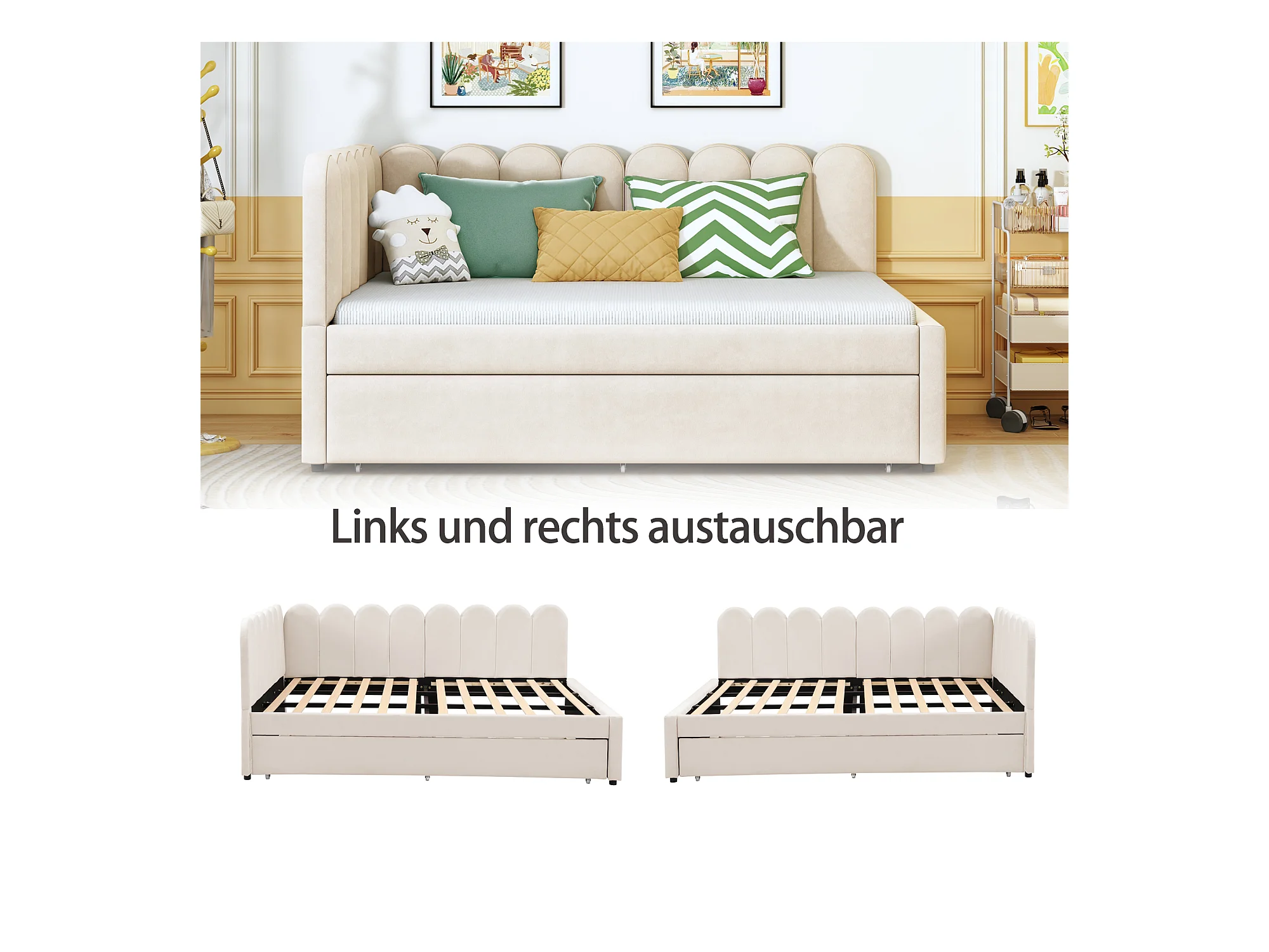 2-in-1-Polsterschlafsofa für Kinder – 140 x 200 cm + 90 x 190 cm – L-Form – Samt + Sperrholz + MDF – Beige