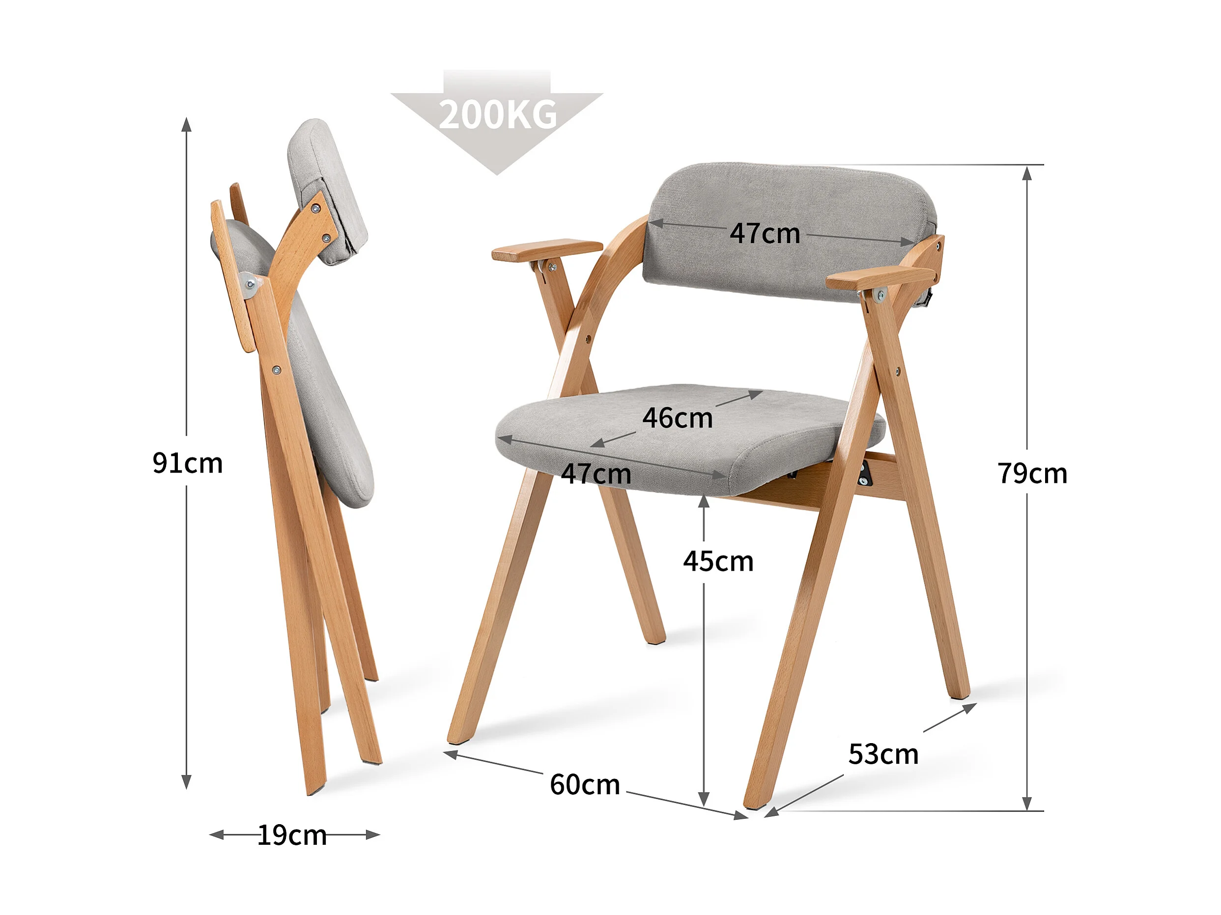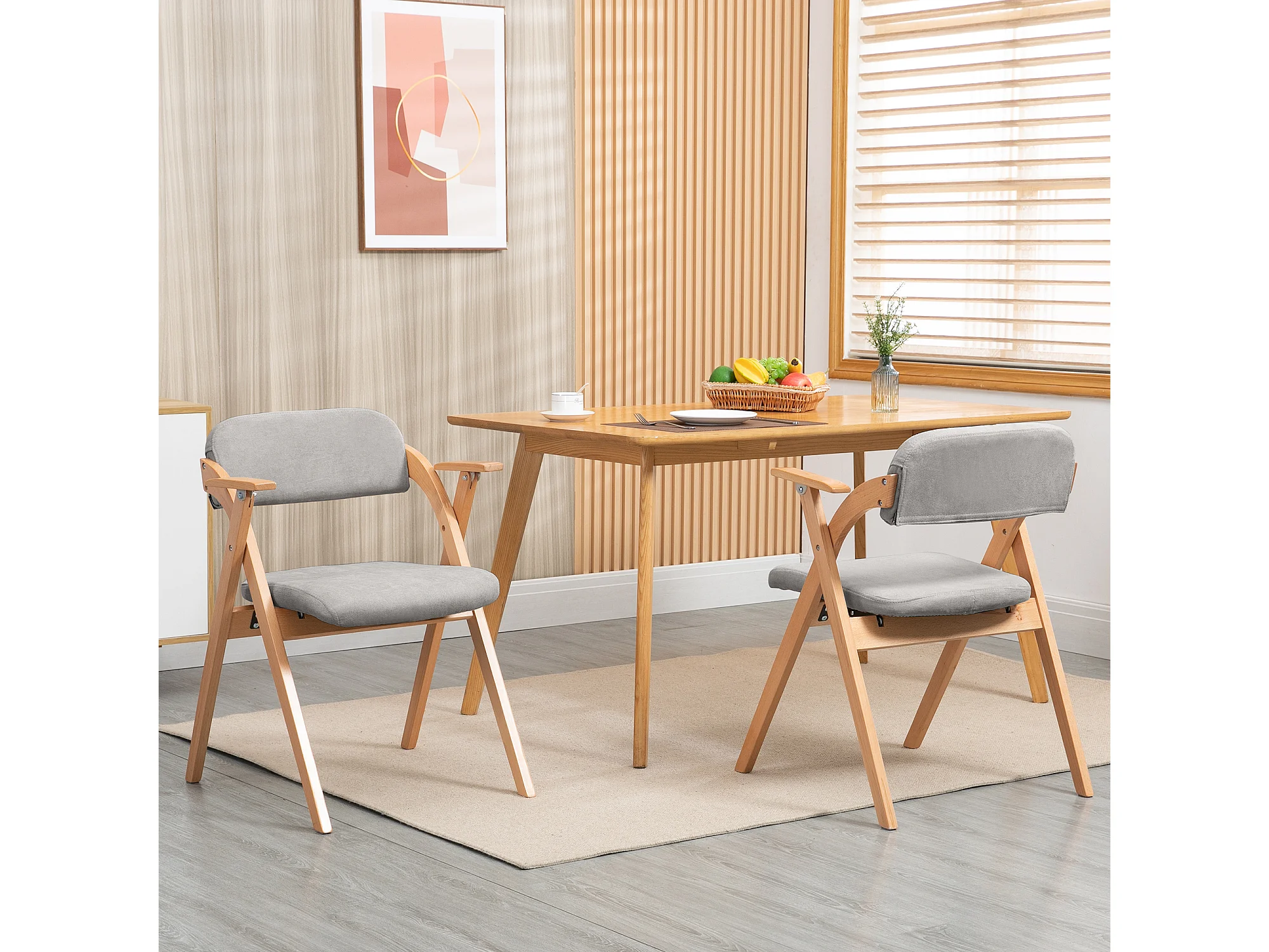 2 klappbare, gepolsterte Esszimmerstühle mit Armlehnen aus Massivholz – grau