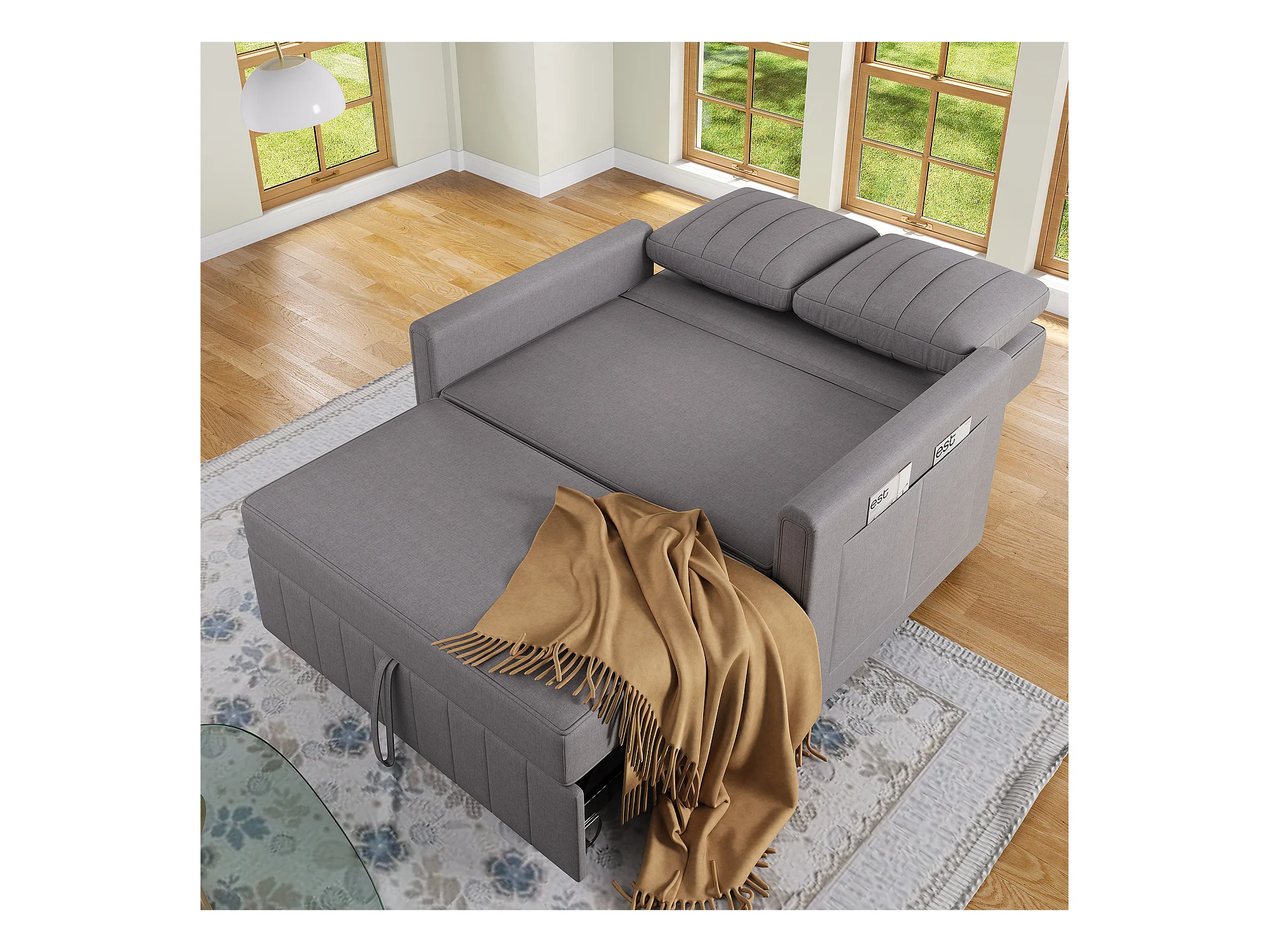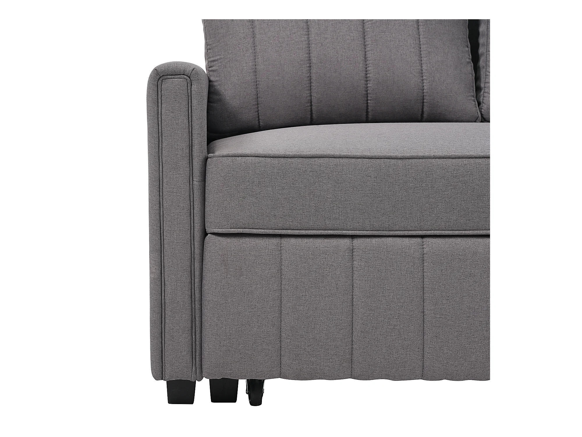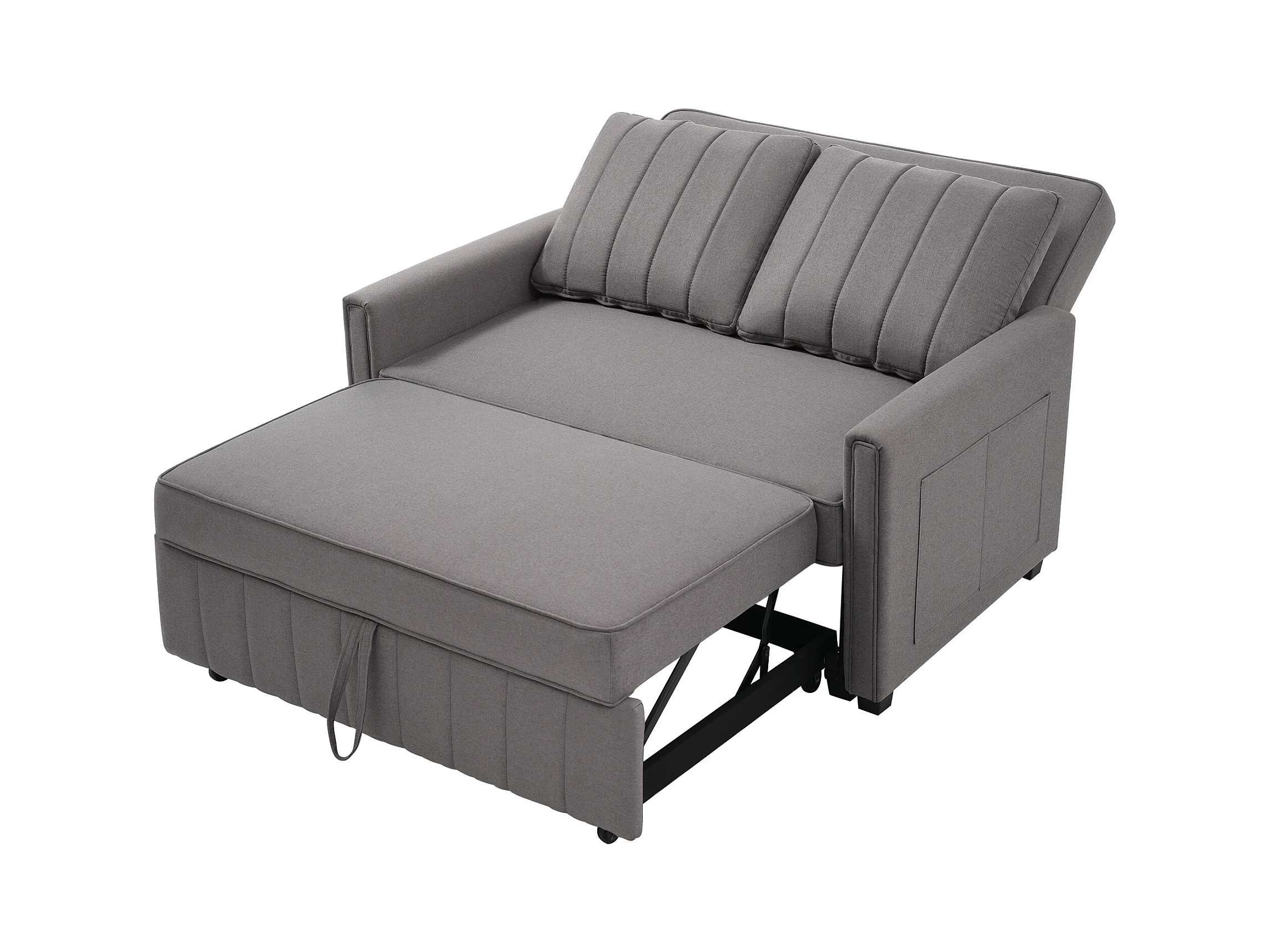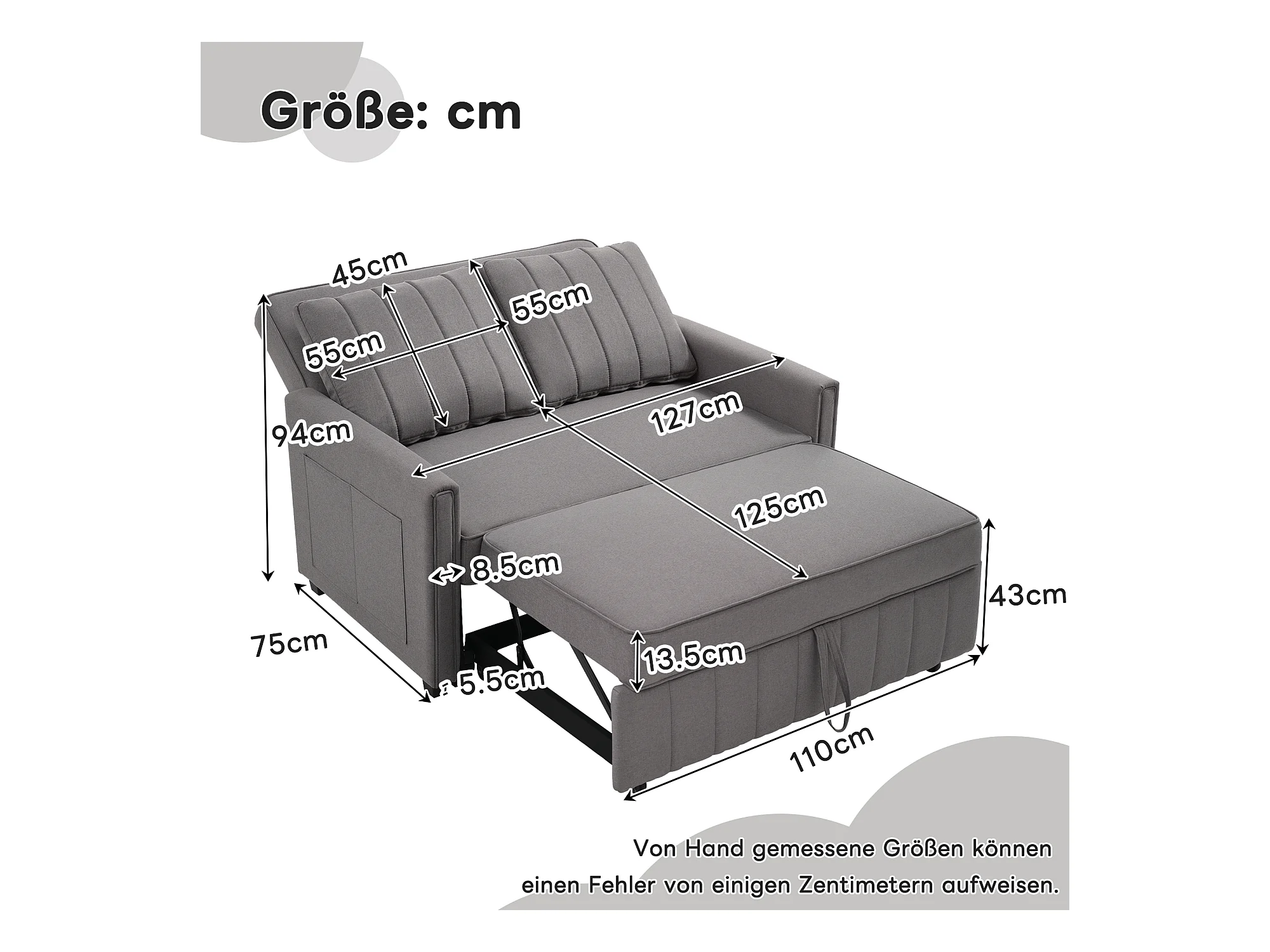 2-Sitzer-Sofa mit Ausziehfunktion - Relaxsofa mit Seitentaschen und 2 Kissen - Graues Leinen