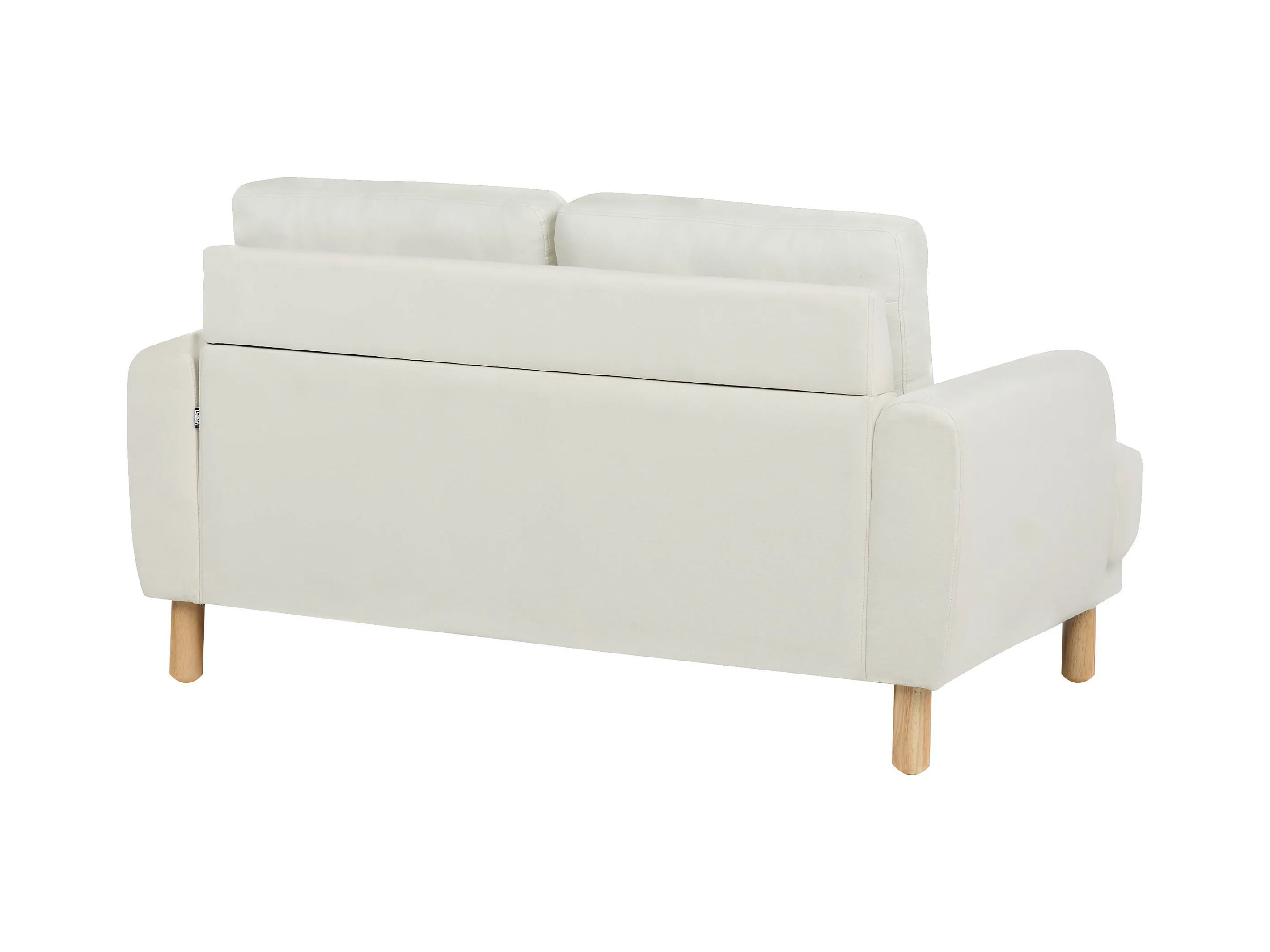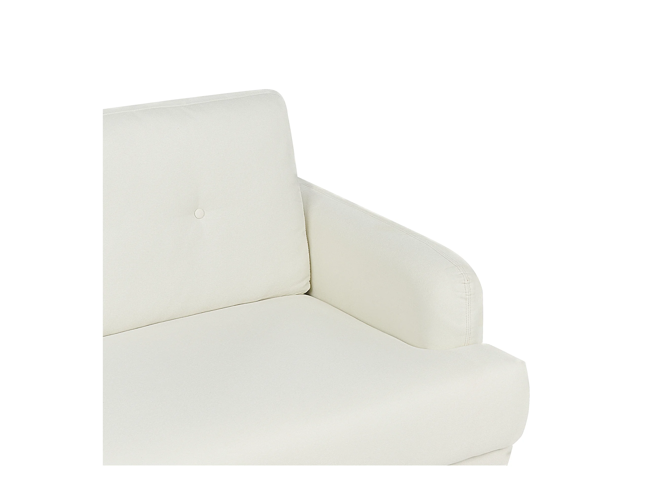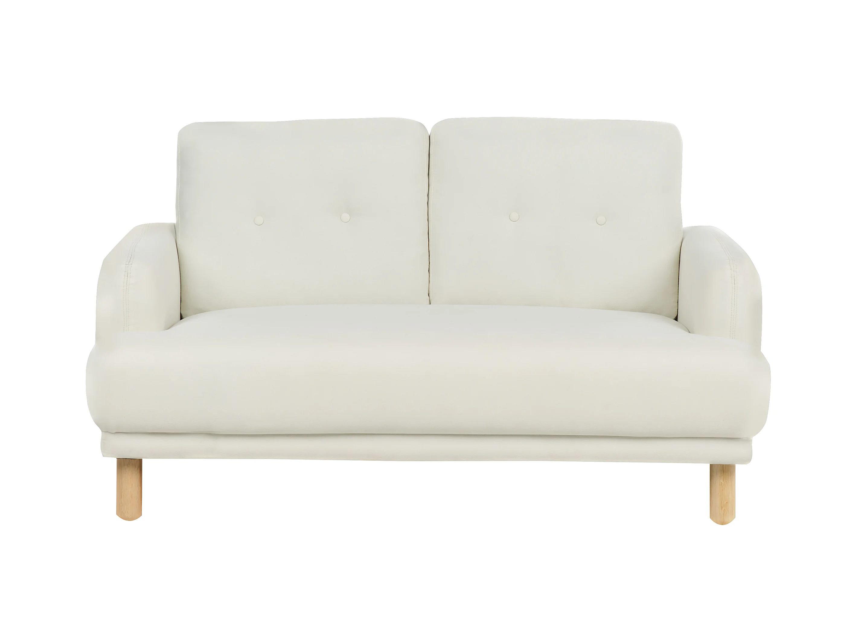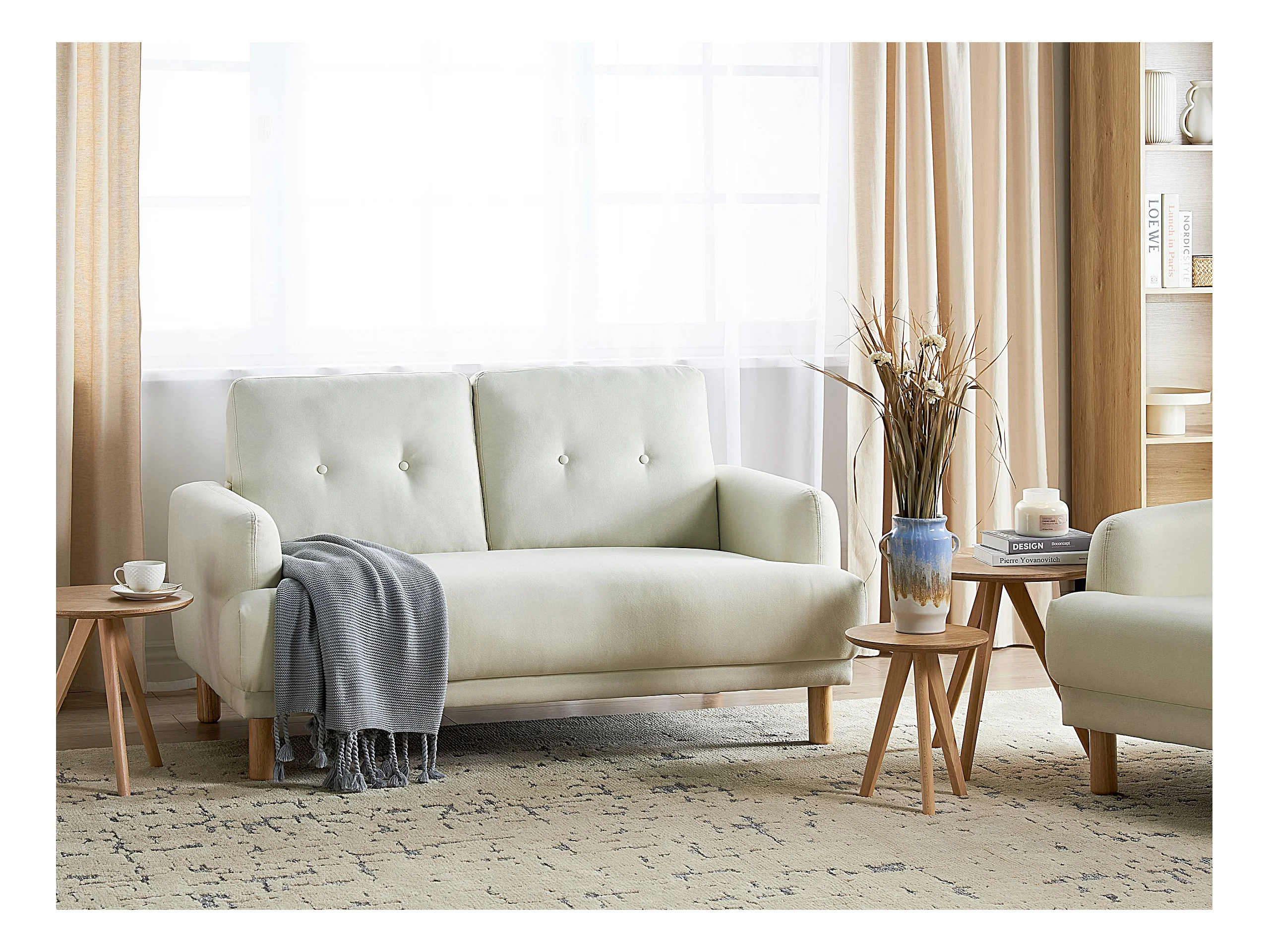 2-Sitzer Sofa Stoff weiß mit hohen Holzbeinen Armlehnen Knöpfe Retro Stil Tuve