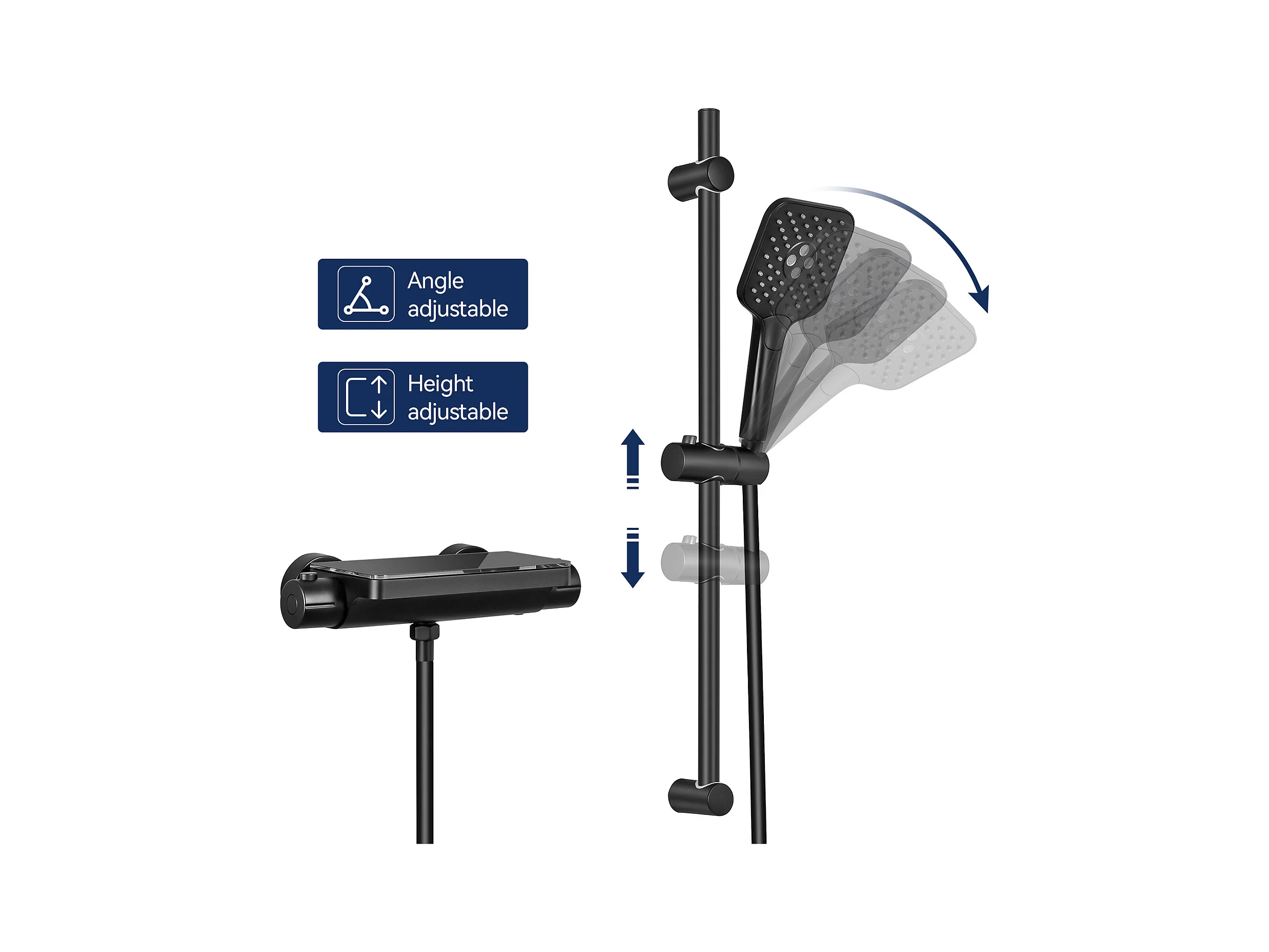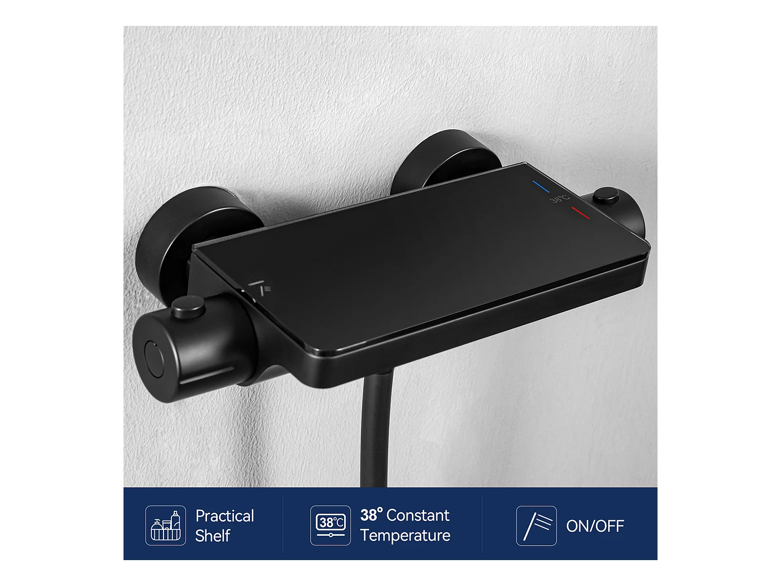 2-teiliges elegantes Duschset Lonheo max mit Ablage und 3-Funktions-Handbrause, schwarze Thermostat-Duschsäule mit 38°C-Mischbatterie