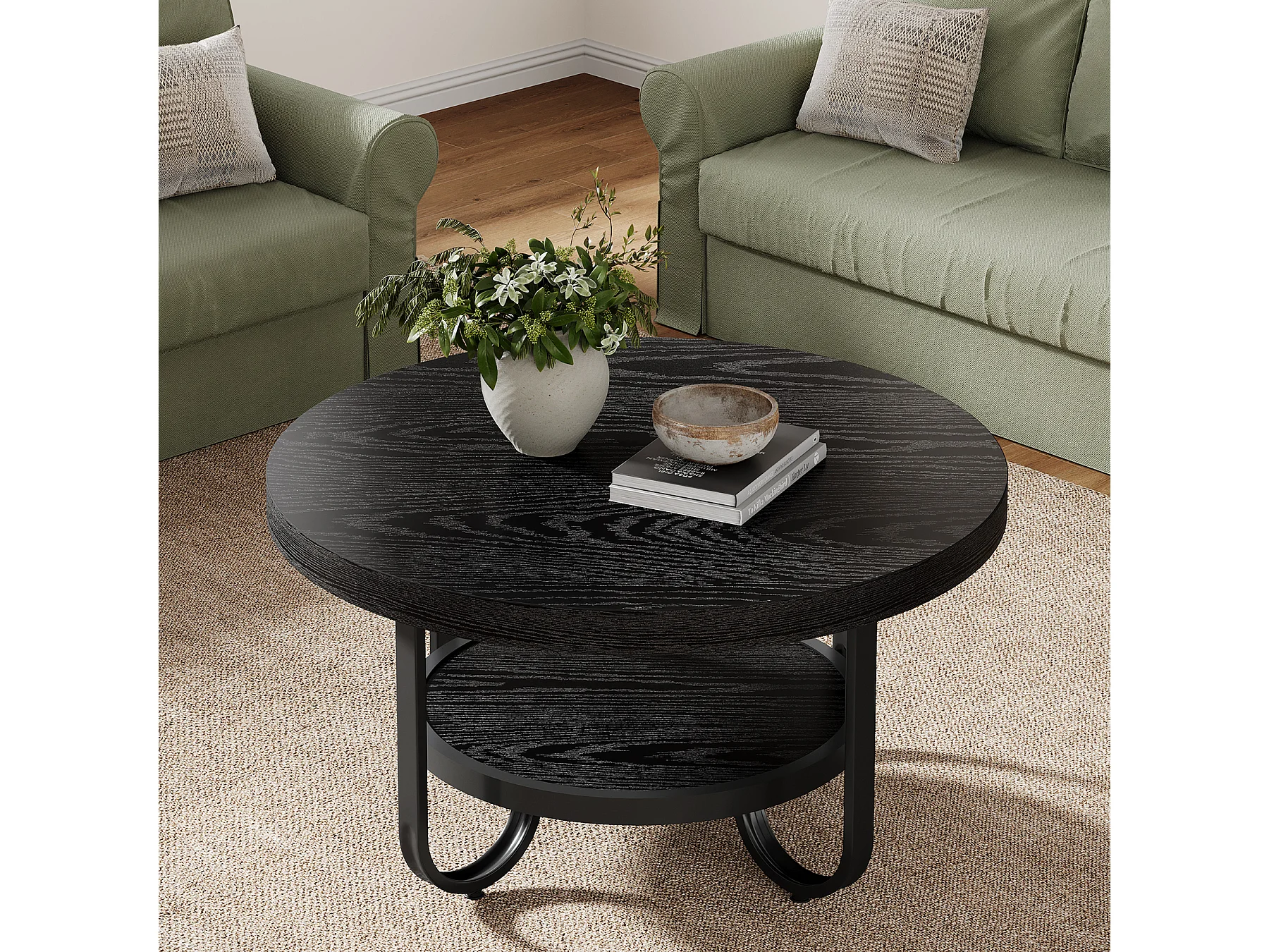 2-Tier-Runder Couchtisch mit Ablagefach für das Wohnzimmer, Schwarz