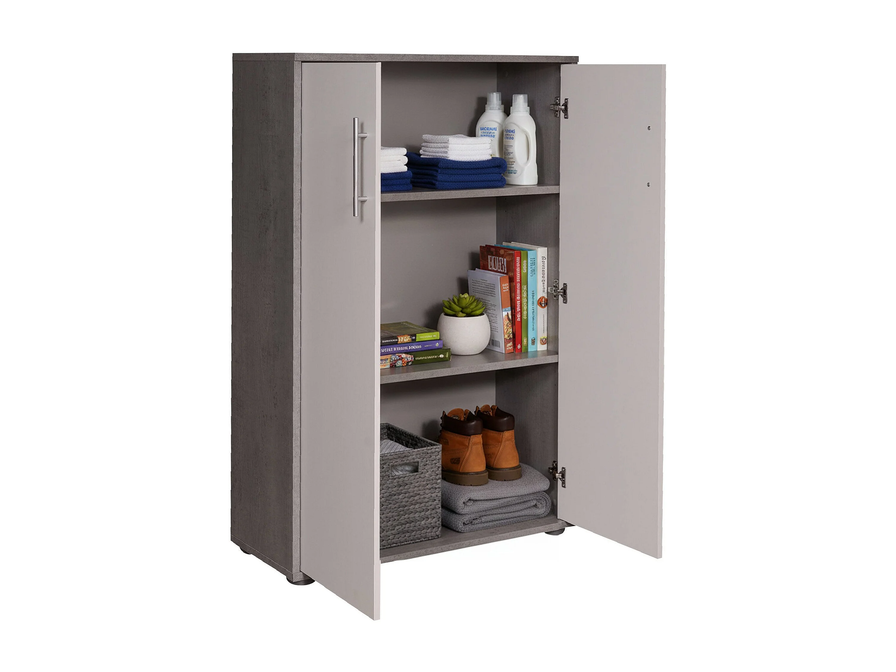 2-türiger MehrzweckschrankCambrils, Hilfsschrank, Schuhschrank, Multifunktions-Bücherregal mit 2 Türen, 79x34h118 cm, Zement und Weiß