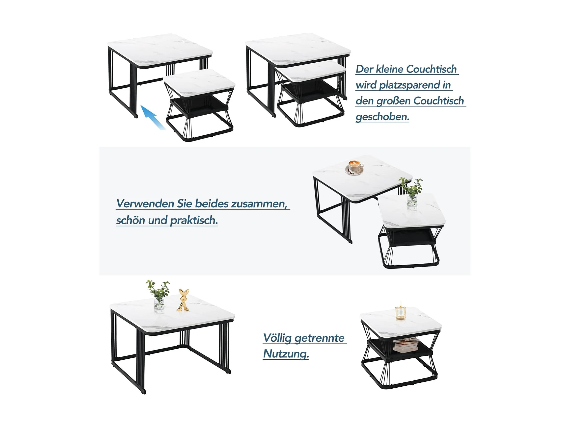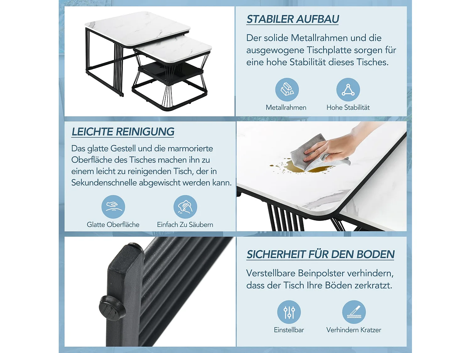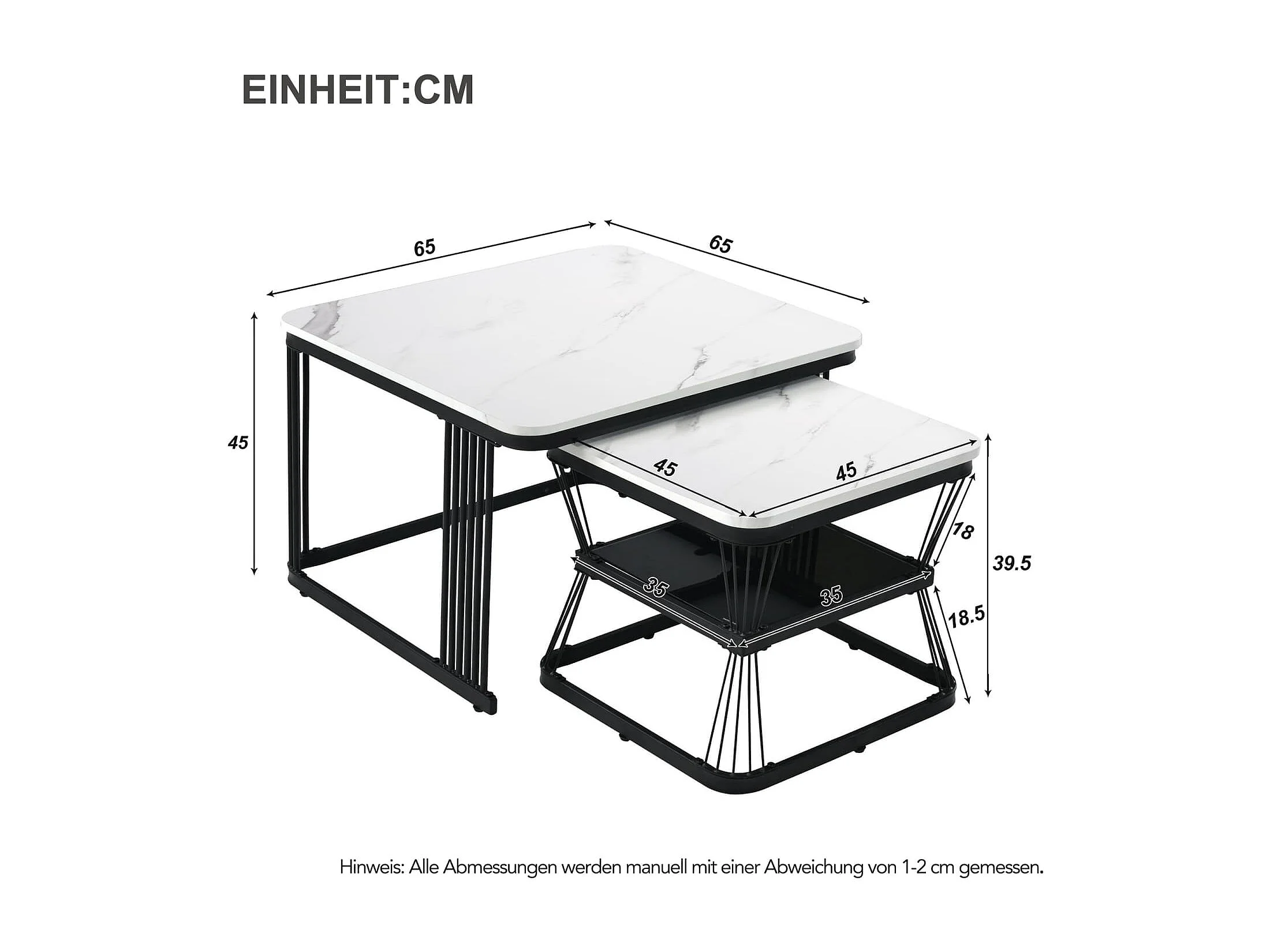 2er-Set moderne Beistelltische, MDF in Marmoroptik, Stahlrohr weiß hochglänzend schwarz, 2 Tische mit den Maßen 65x65x45 cm und 45x45x39,5 cm