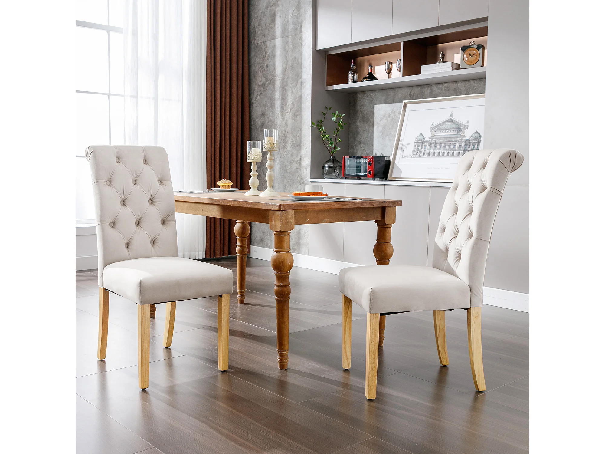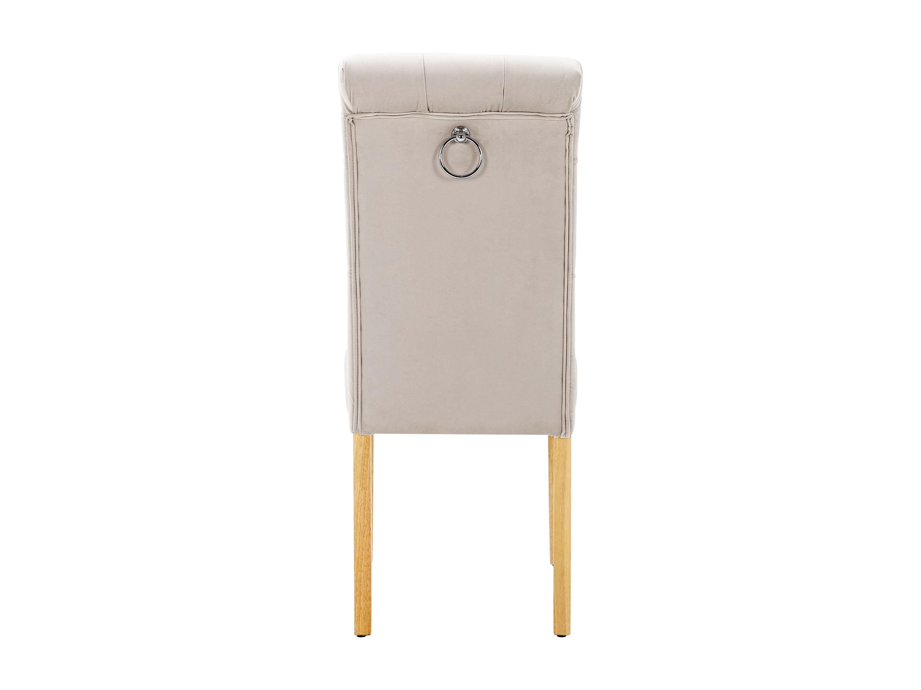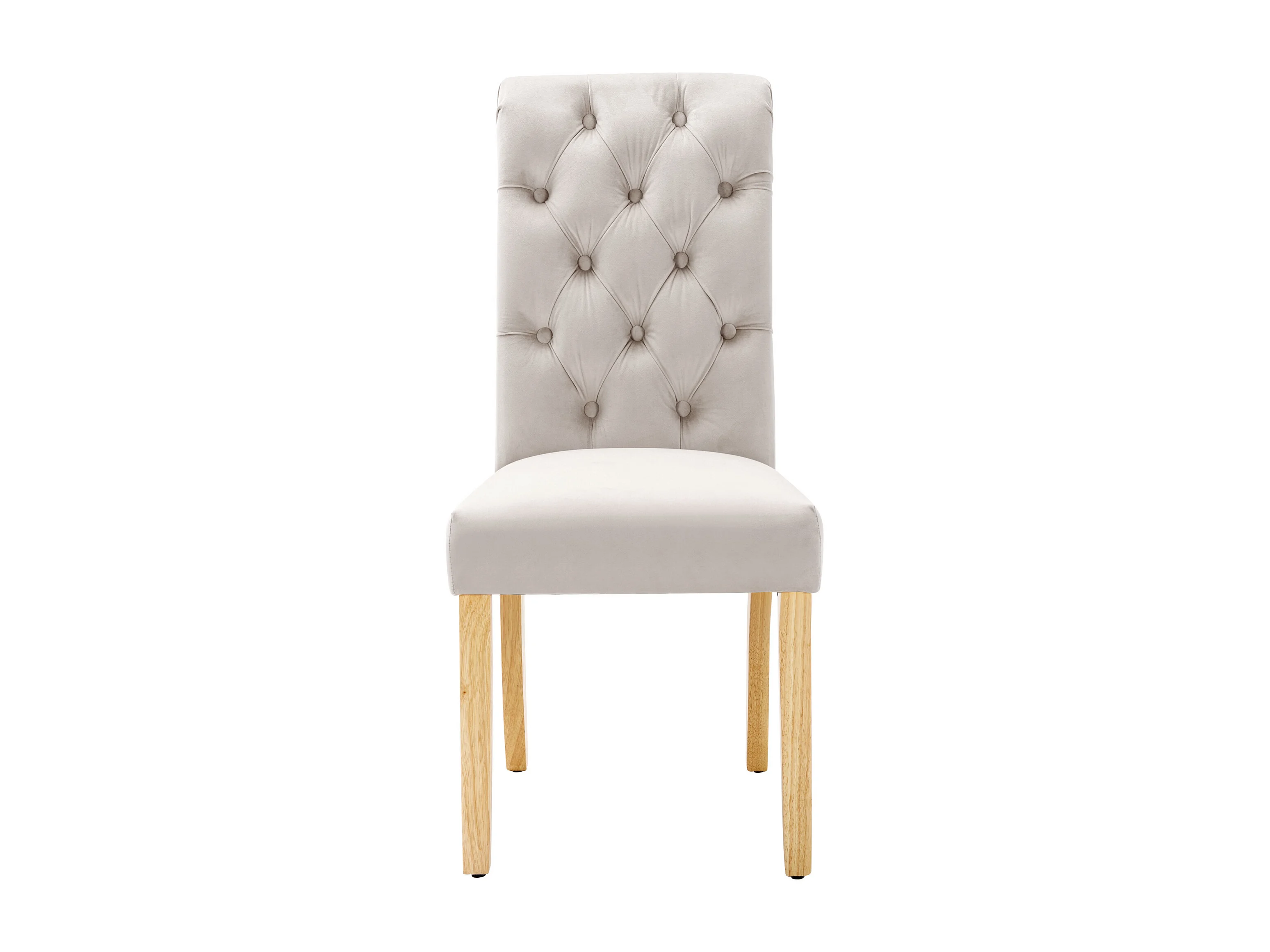 2er-Set Samtstühle, Eichenholzbeine, geschwungene Rückenlehne mit Zierknöpfen – beige