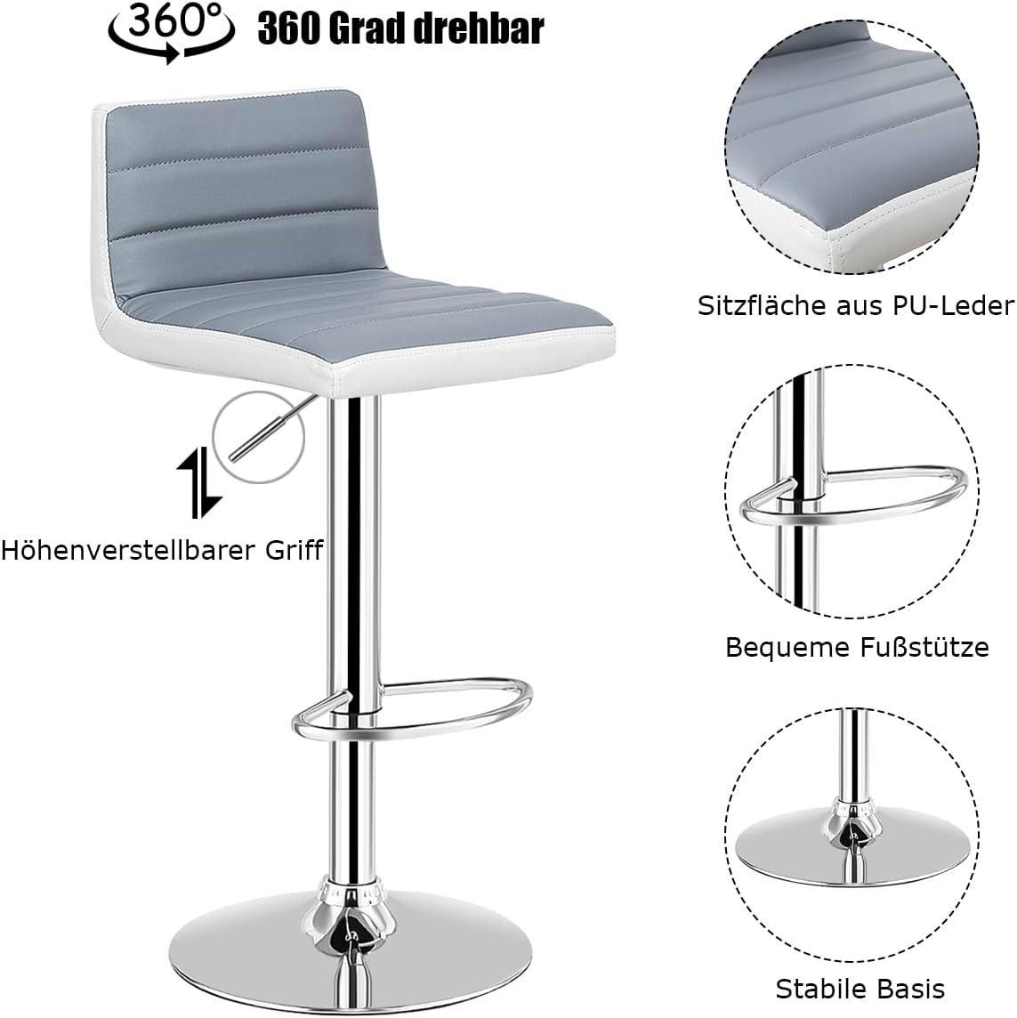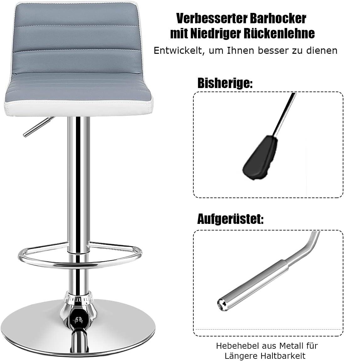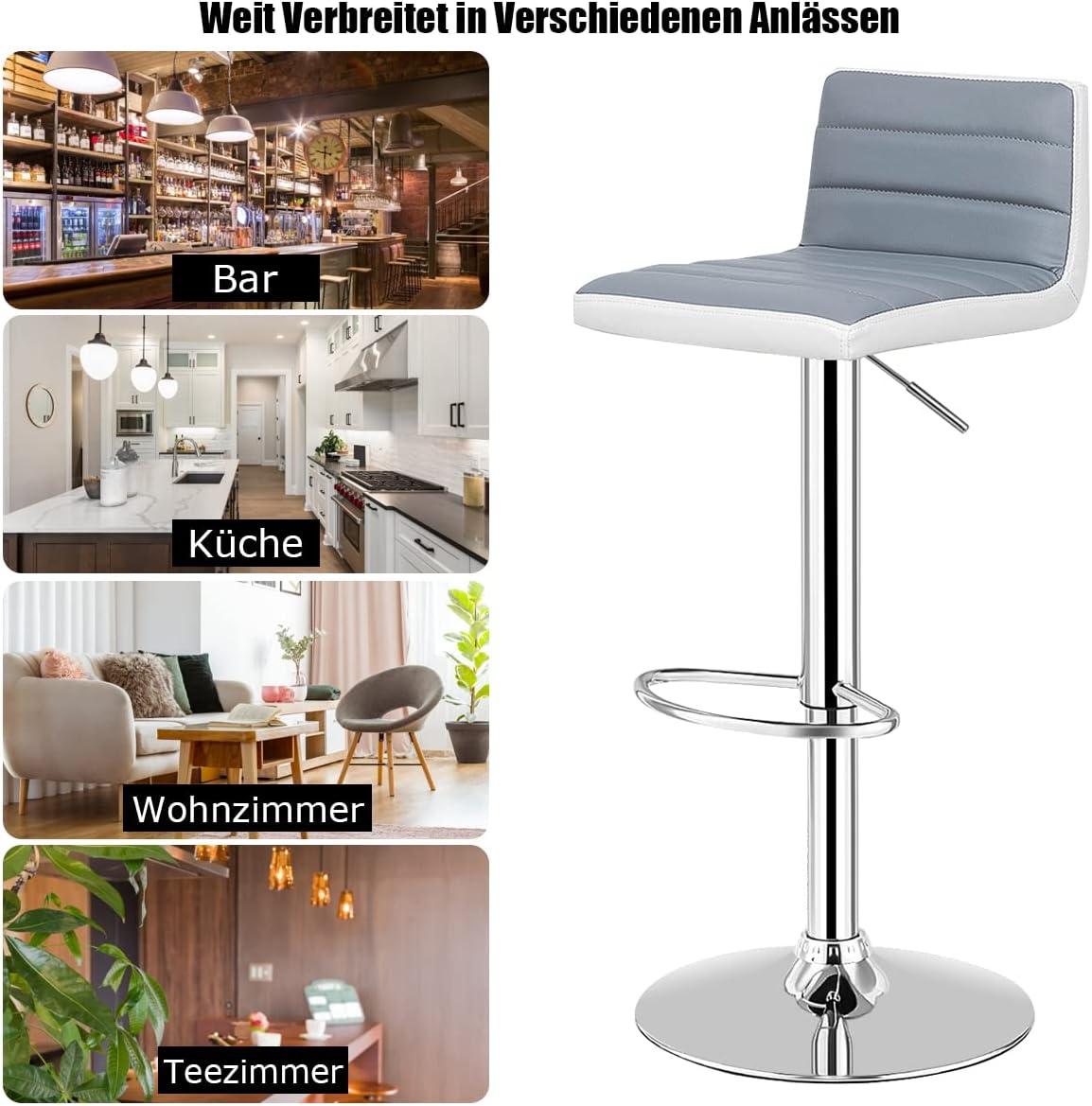 Der Barhocker steht auf einem stabilen Fuß aus verchromtem Stahl mit einem rutschfesten Gummiring, stabil genug, um Gewicht zu halten, kein Wackeln und keine Kratzer. Der Stuhl hat ein ergonomisches Design mit niedriger Rückenlehne, einen gepolsterten Sitz und ein Fußstützendesign, das das Sitzen sehr bequem macht. Außerdem ist es mit einem einfachen Hebehebel ausgestattet, mit dem Sie die Höhe für eine geeignete Position leicht einstellen können. Außerdem lässt sich der Sitz um 360° drehen, sodass Sie Dinge nehmen oder mit anderen chatten können, ohne sich zu bewegen. Entworfen im modernen zeitgenössischen Stil, ist das 2er Set Barhocker eine großartige Ergänzung für Küche, Kneipe, Café, Esszimmer, Wohnzimmer, Ruhebereich, Büro usw.