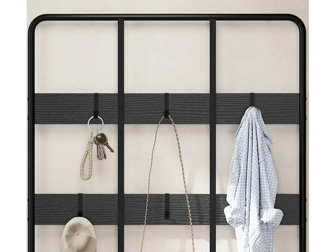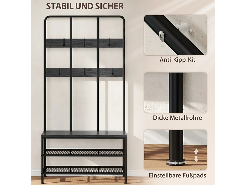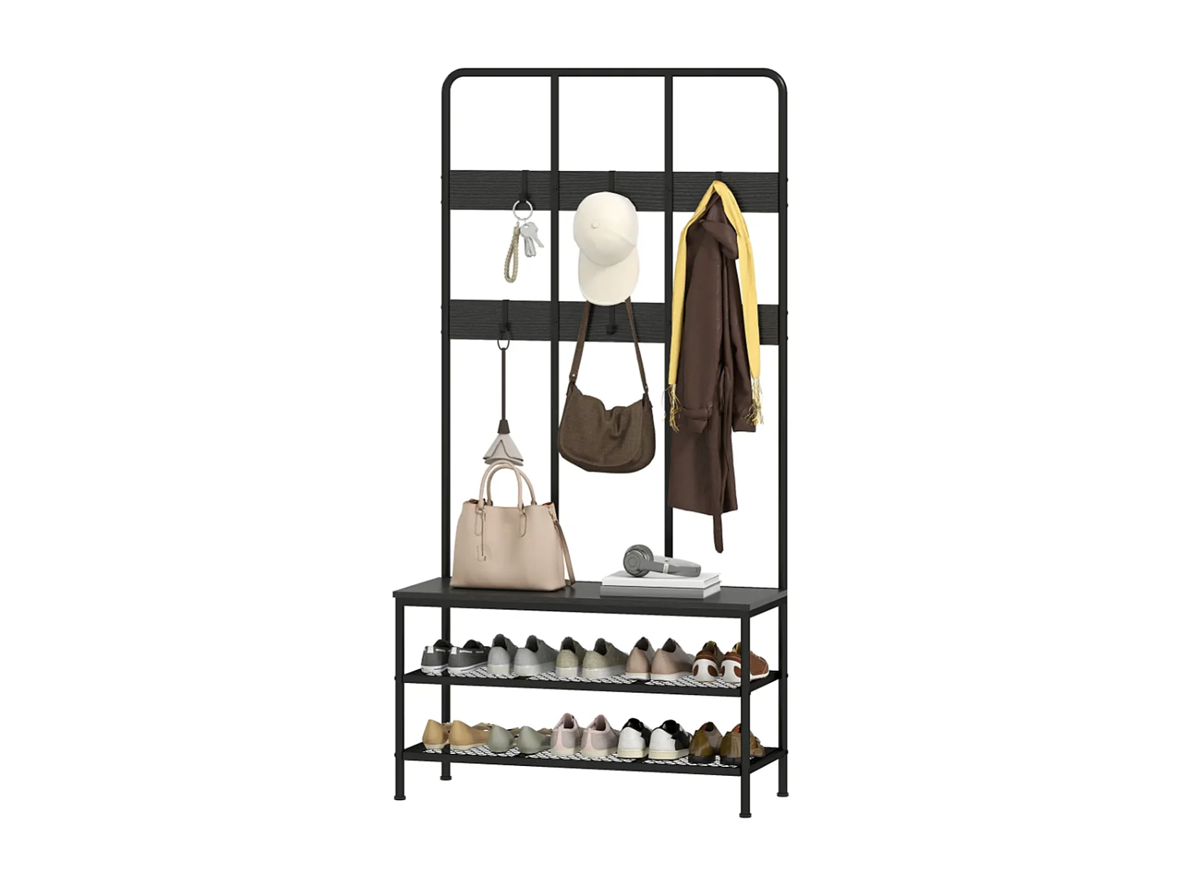 3-in-1 Garderobenständer, Schuhregal, Kleiderhaken, Sitzbank, Schuhregal, Metall, Schwarz