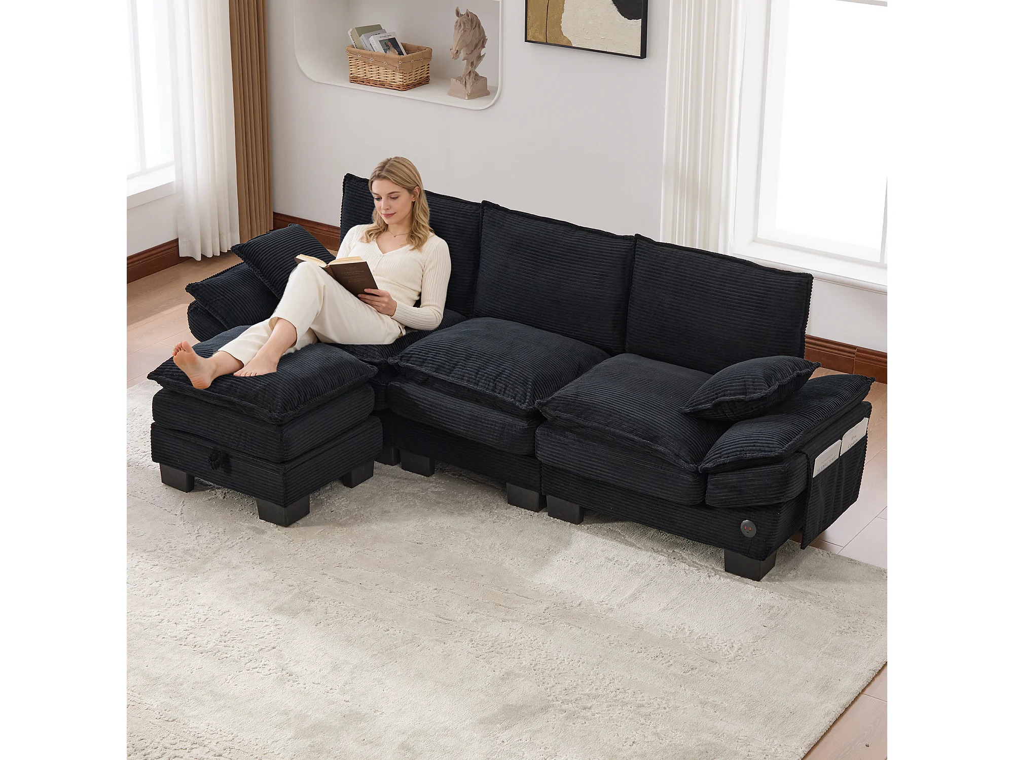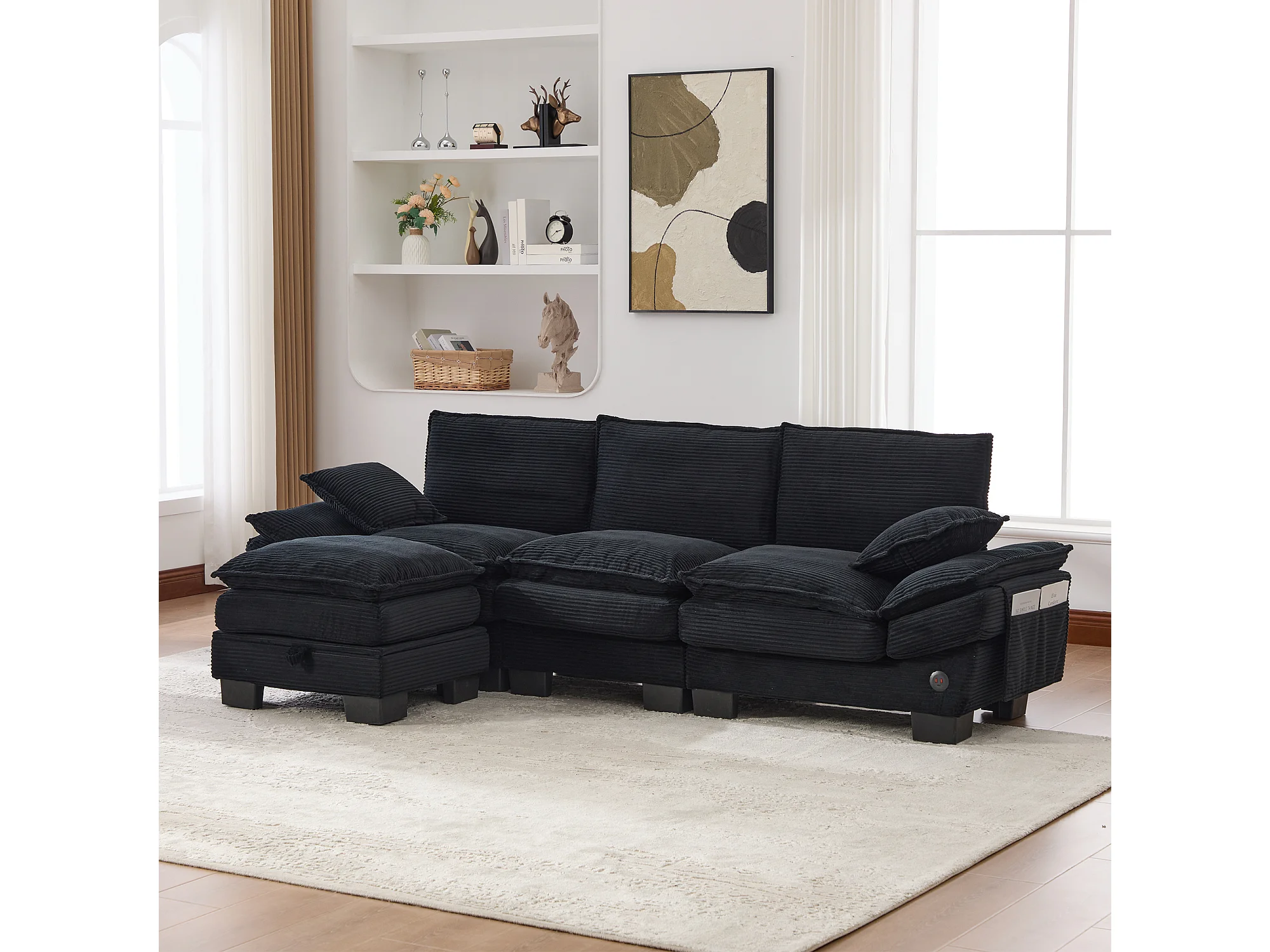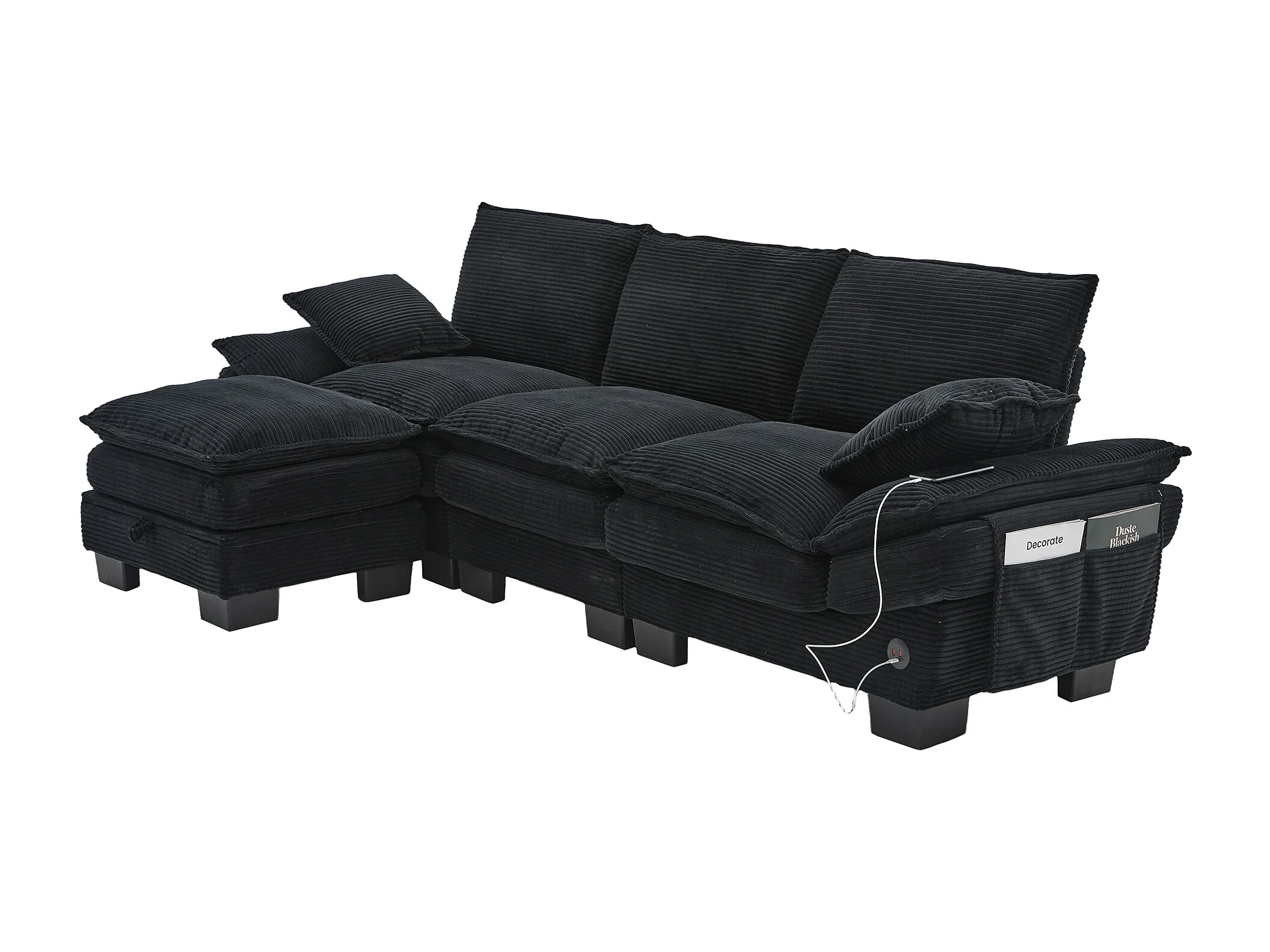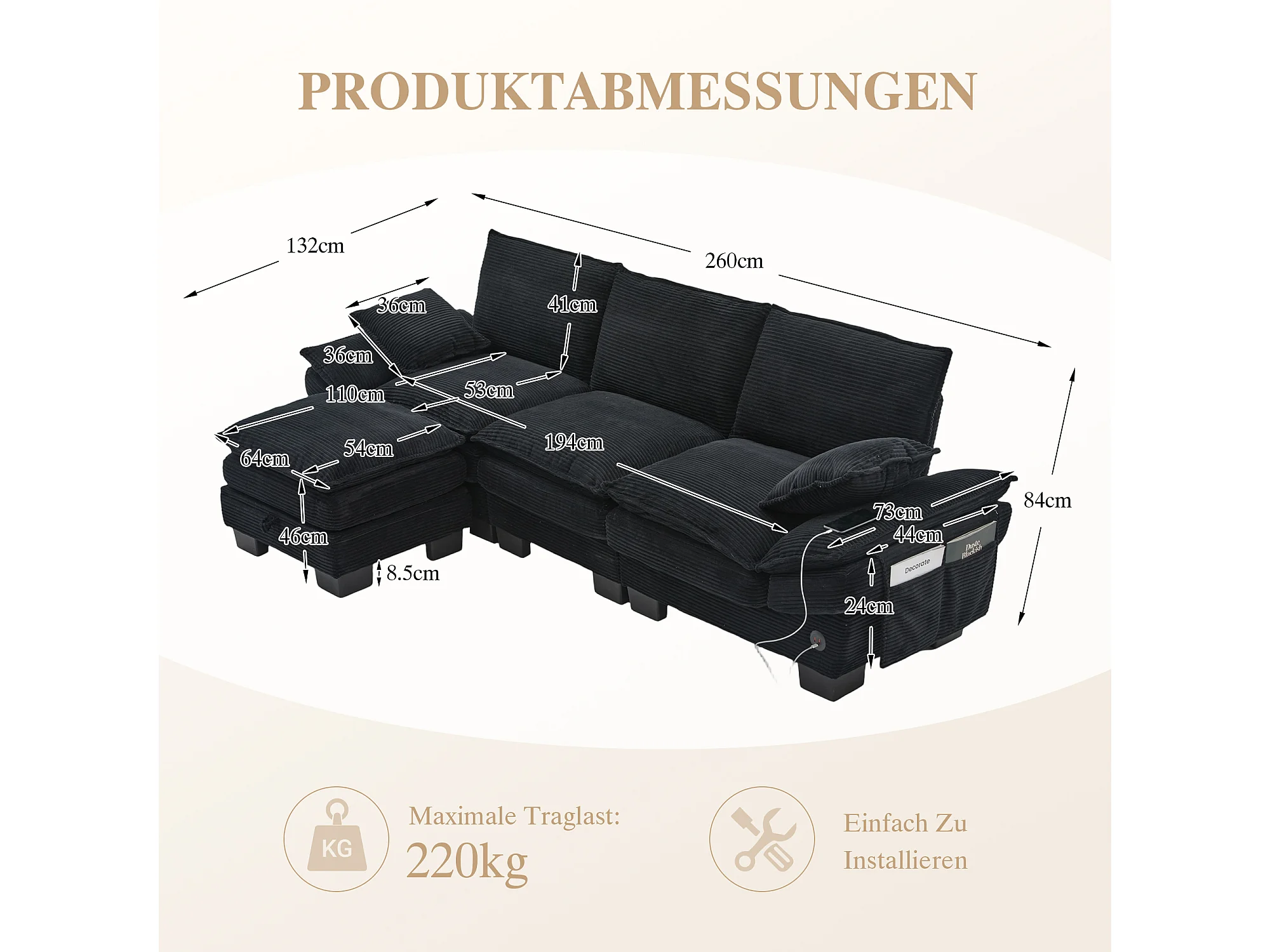 3-Sitzer-Cordsofa-Set – 260 x 132 x 84 cm – mit 1 Aufbewahrungshocker + USB-Anschluss + Taschen – schwarz