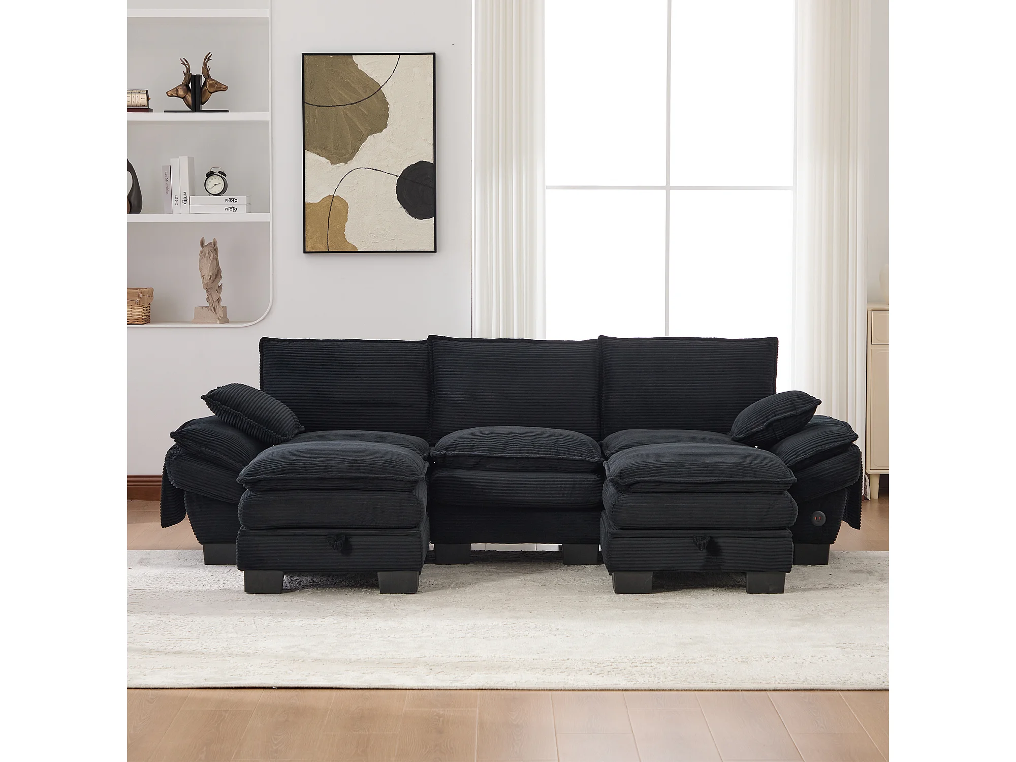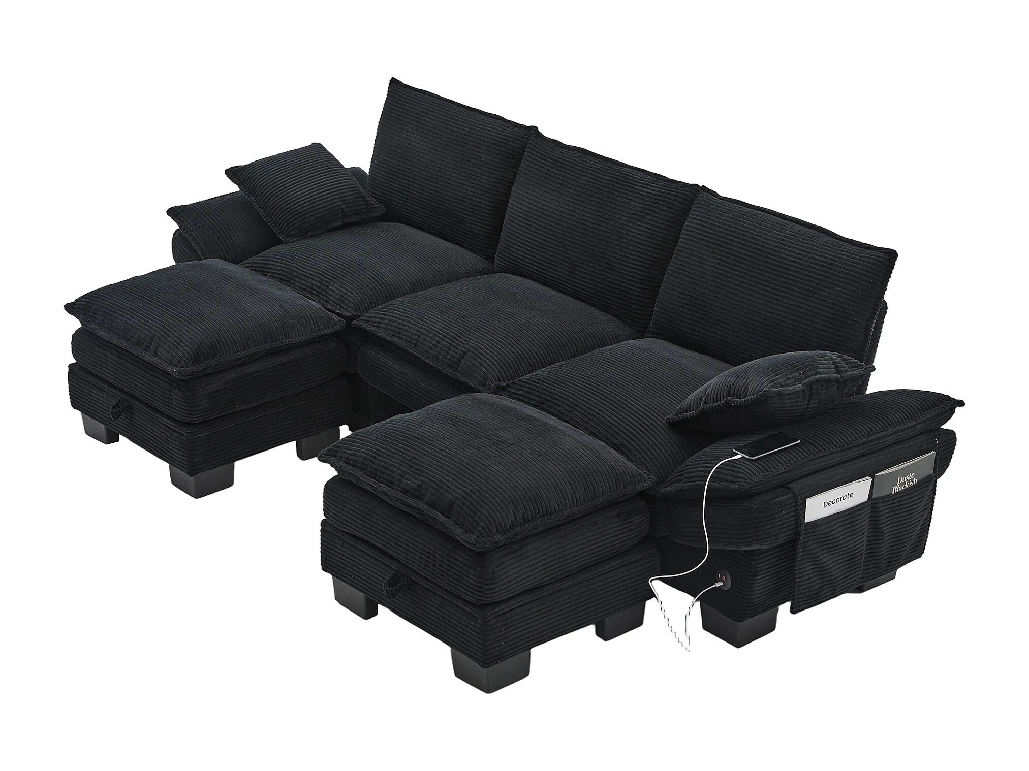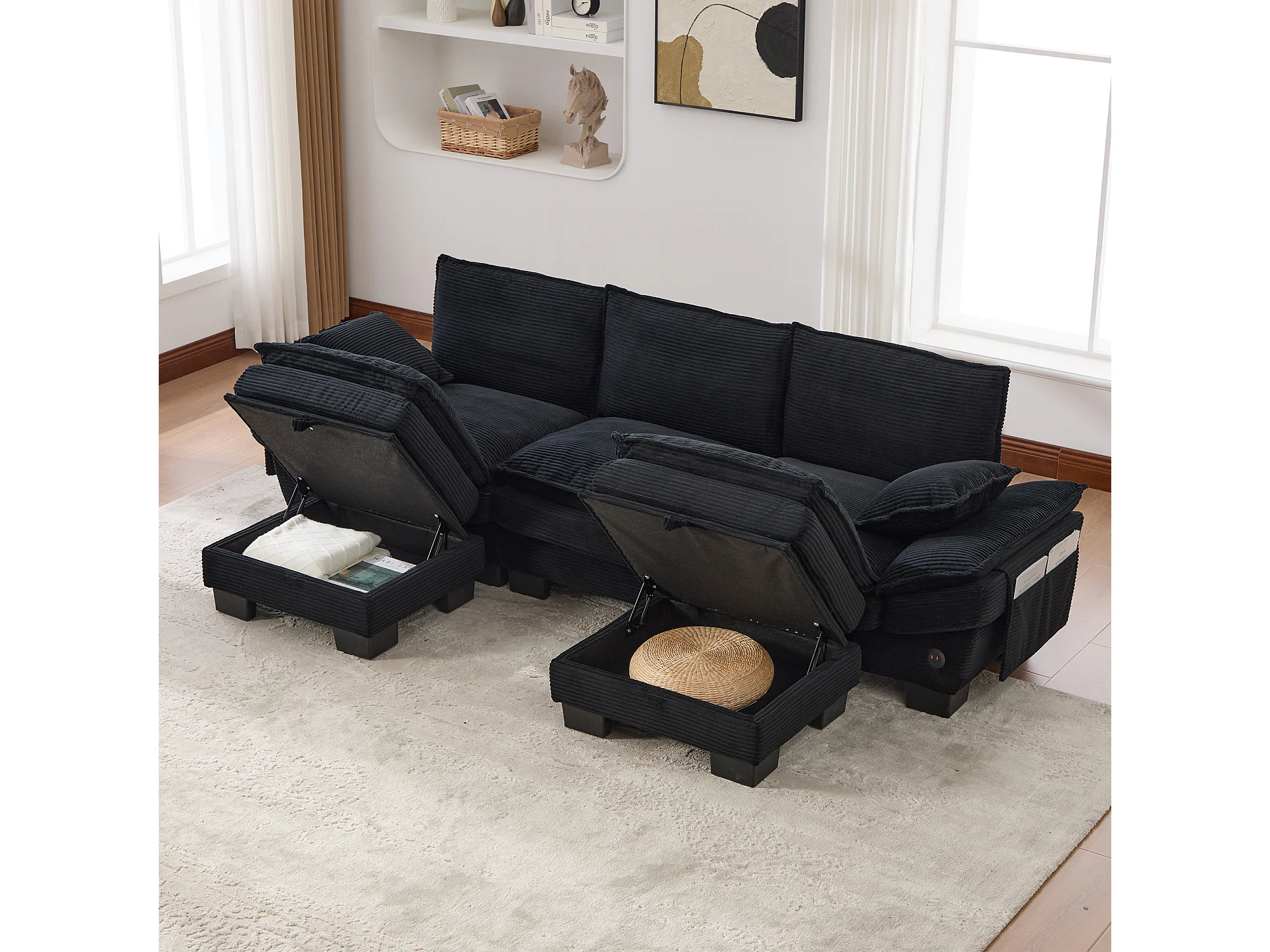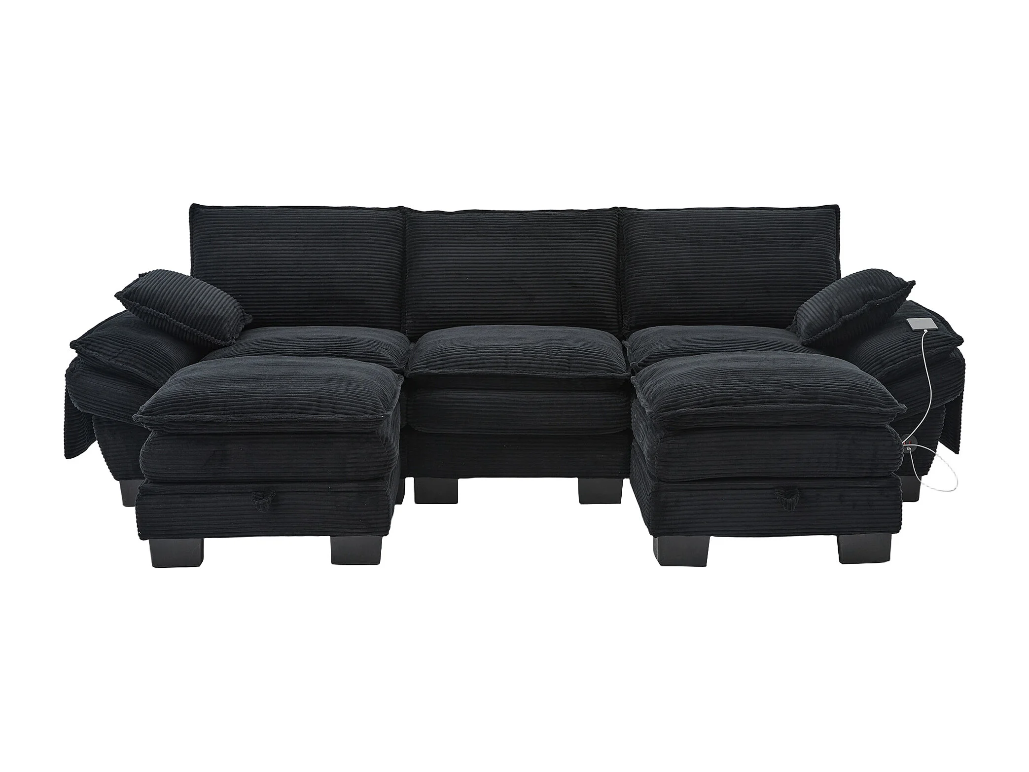 3-Sitzer-Cordsofa-Set – 260 x 132 x 84 cm – mit 2 Aufbewahrungshockern, USB-Anschluss und Taschen – schwarz