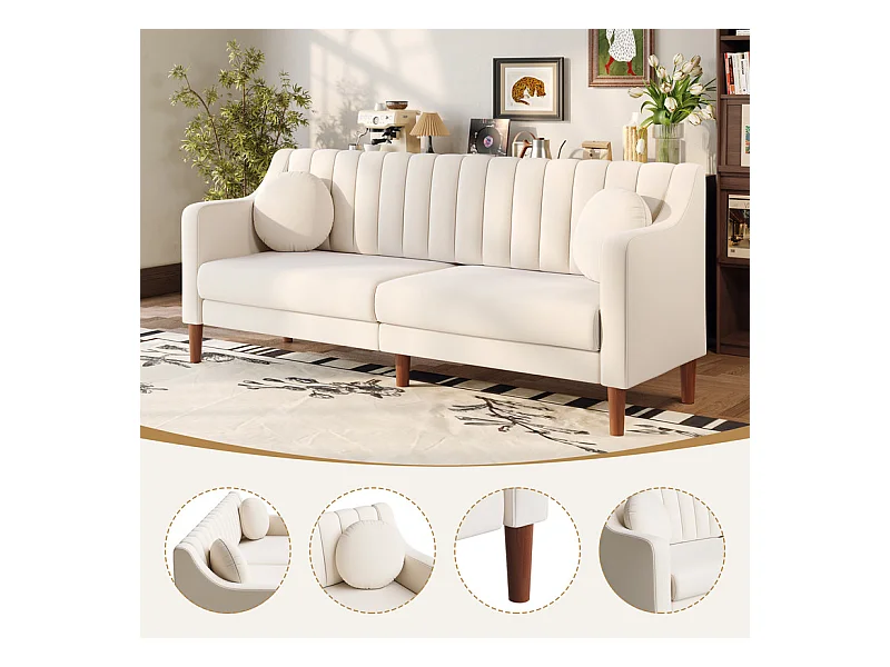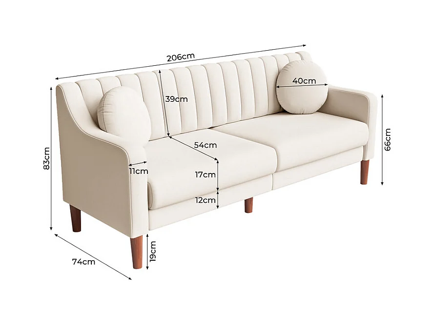 3-Sitzer Sofa aus Velours - Massivholzfüße 19cm - mit 2 Kissen - 206x74x83cm - Beige