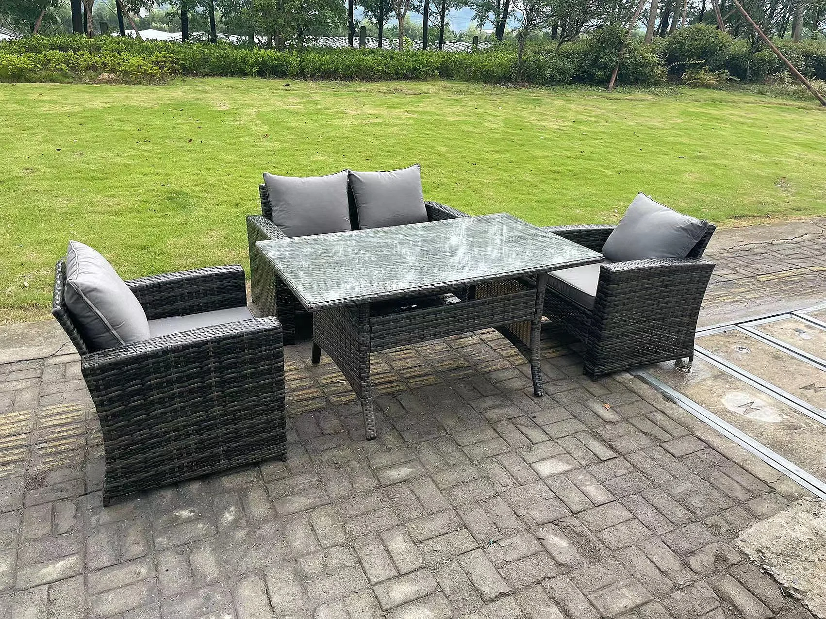 4 Sitzer Outdoor Dunkelgrau gemischt Hoher Rücken Rattan Sofa Esstisch Set Gartenmöbel mit Sesseln