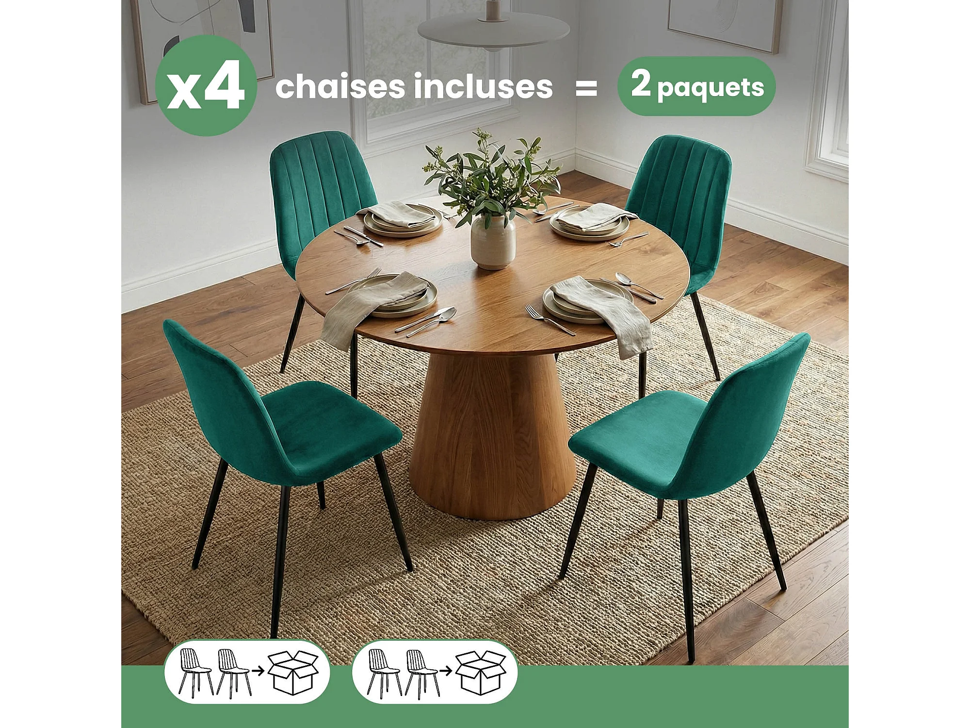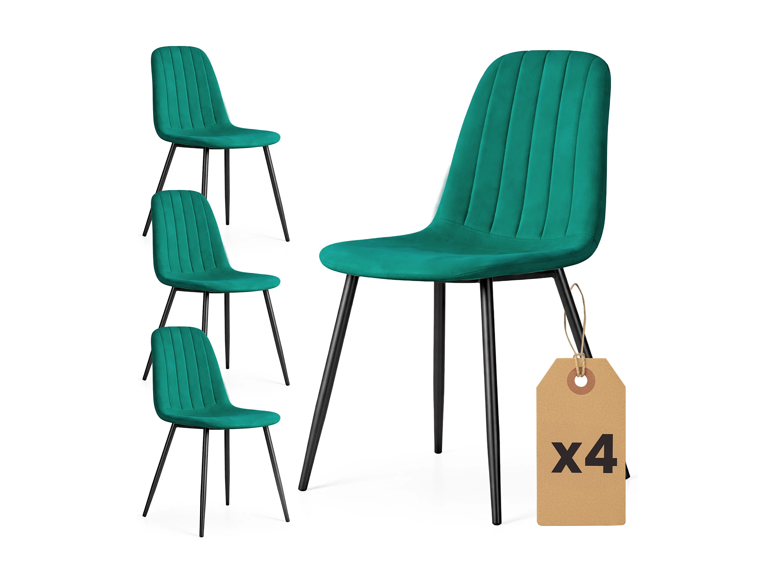 4er Set Samt-Polsterstühle, gesteppt LUMO Flaschengrün mit schwarzen Beinen